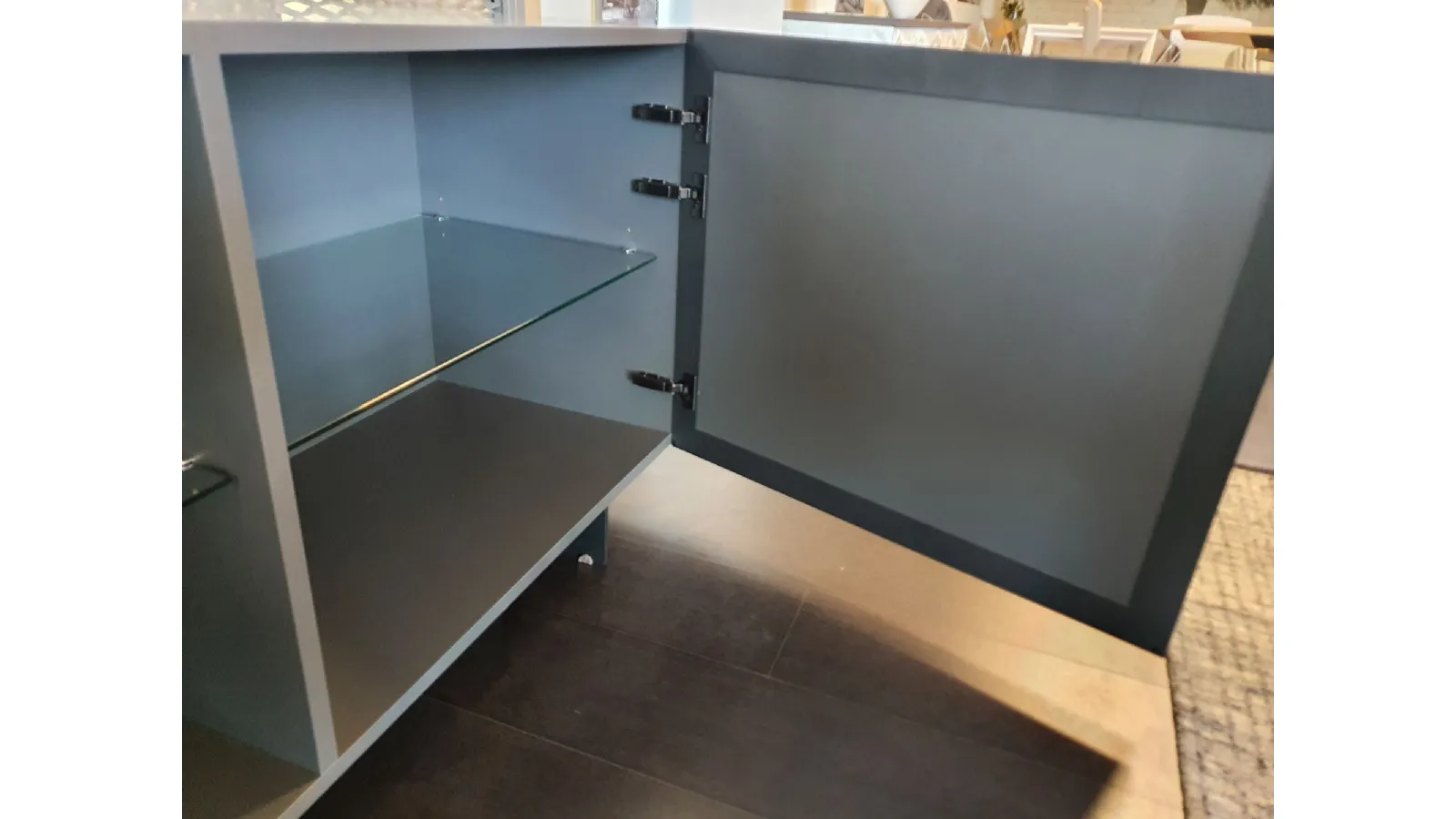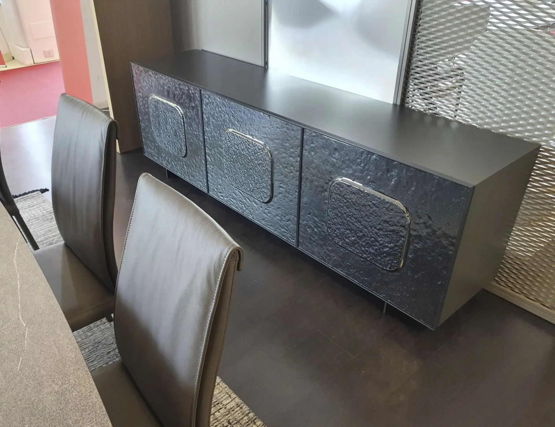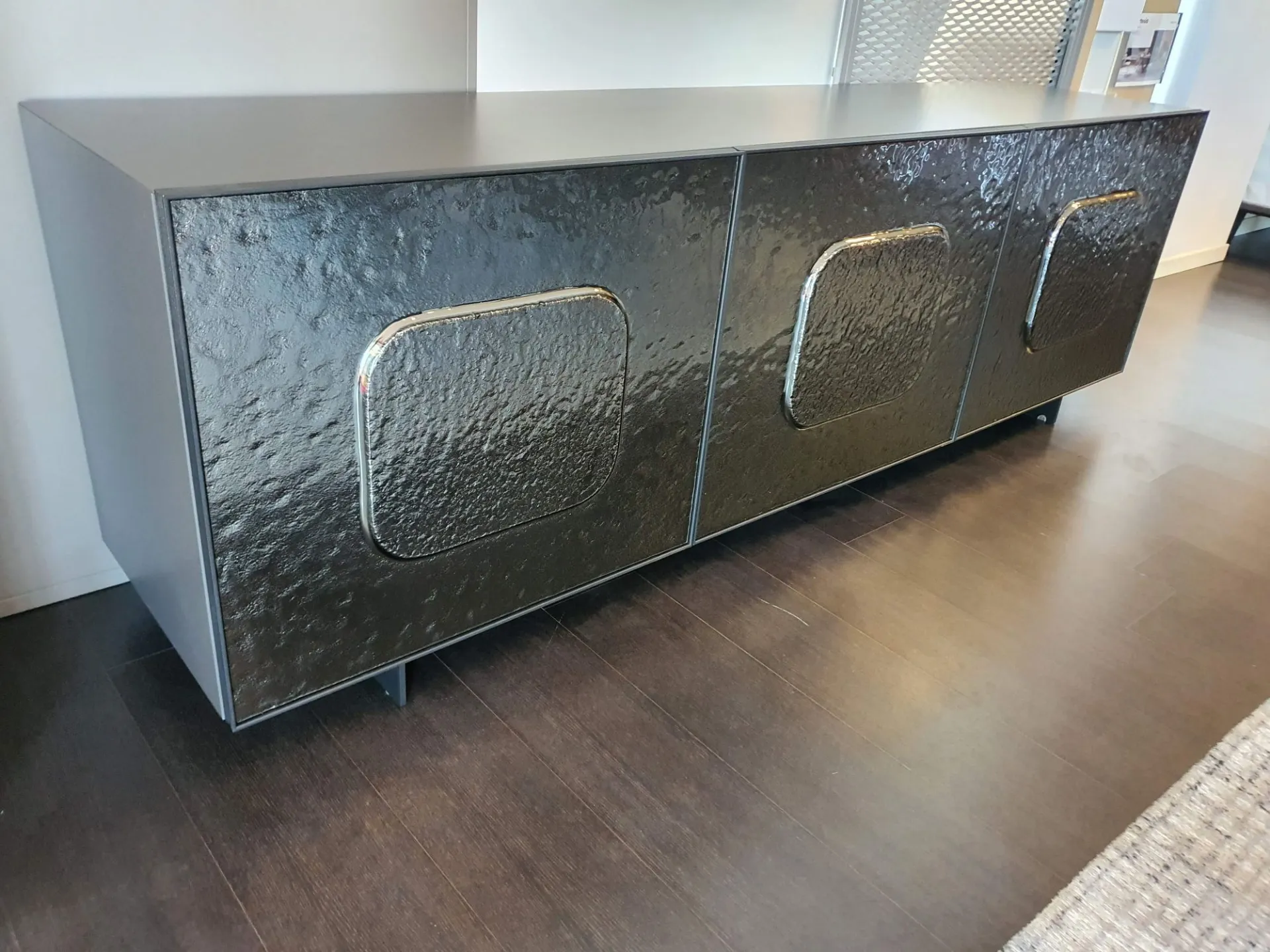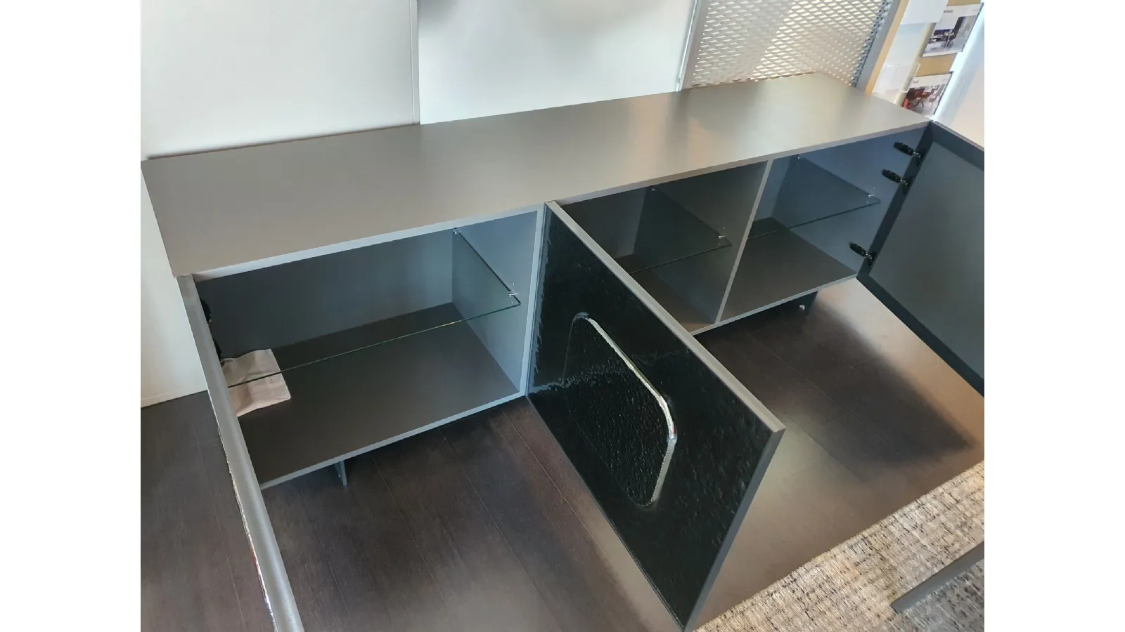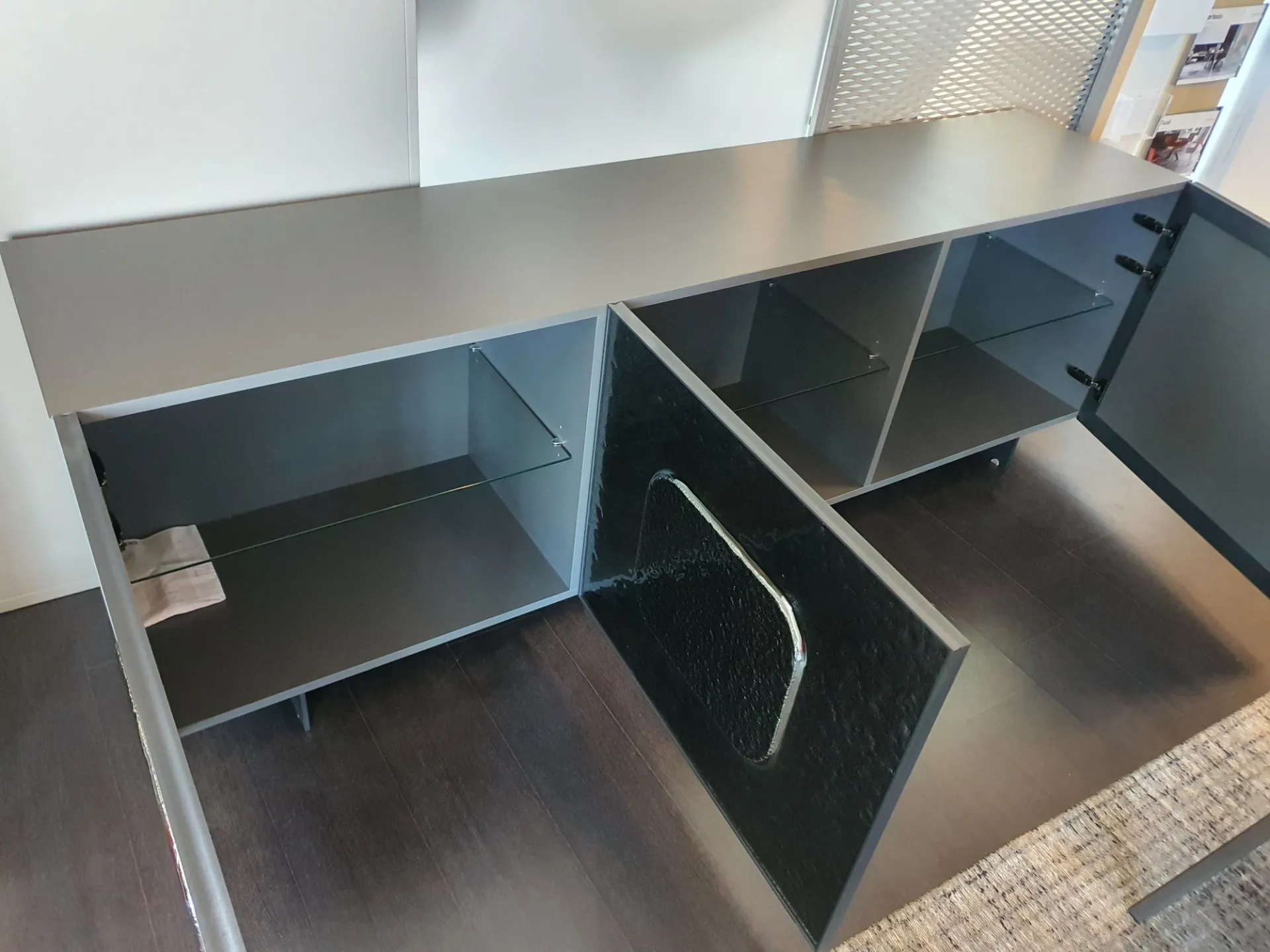 Three-door sideboard model GIULIA with frosted glass fronts in smoke and silver VB02, matte graphite painted metal foot MT98, and matte lacquered slate top X06. Measurements: L.223xP.50xH.72 cm.