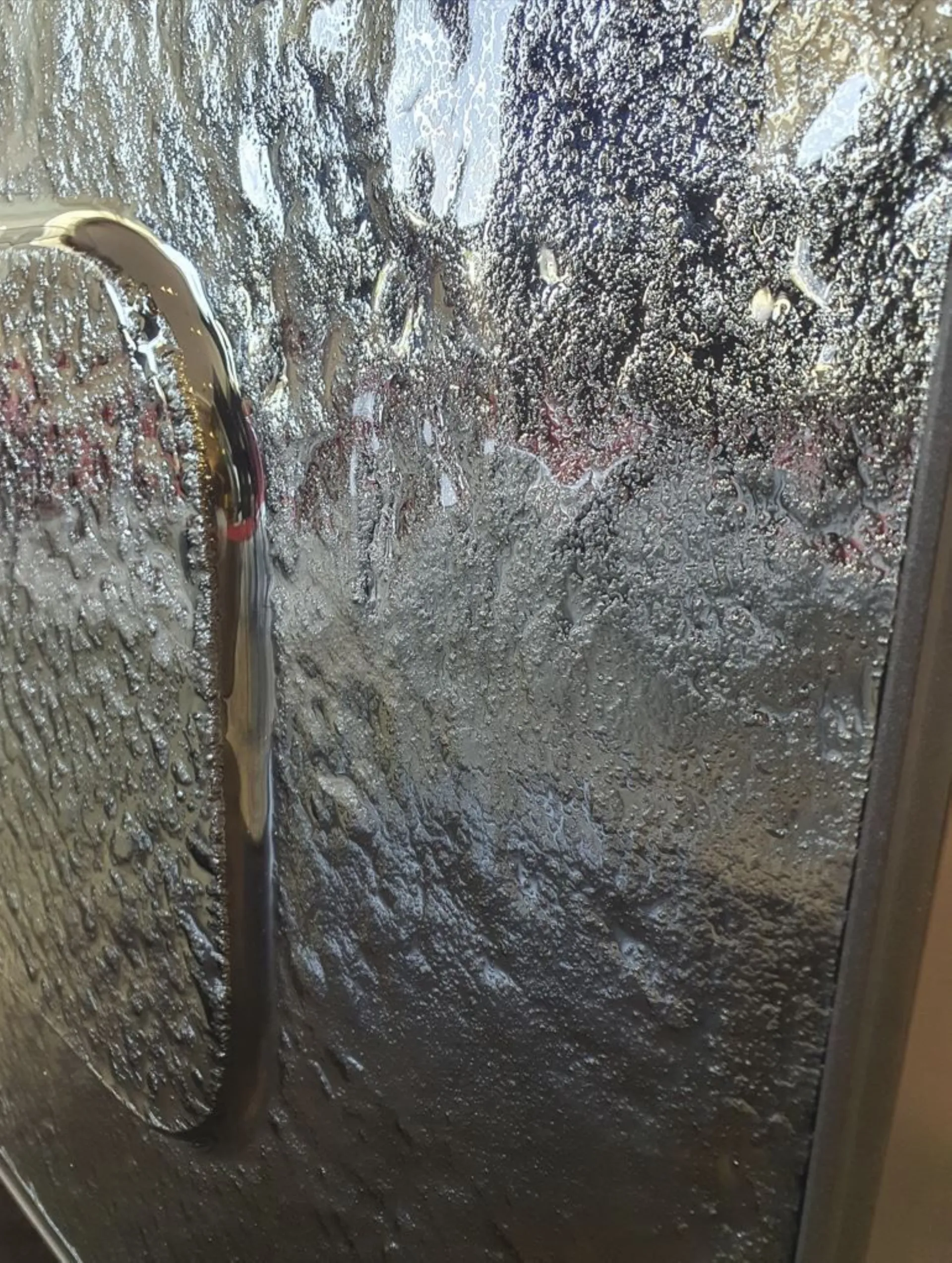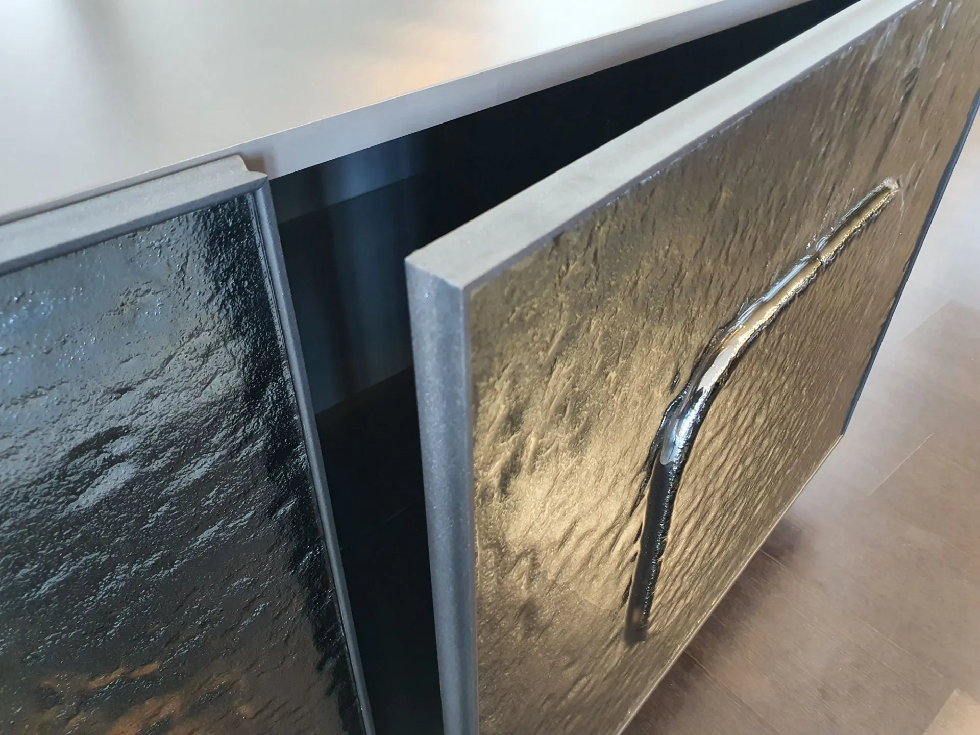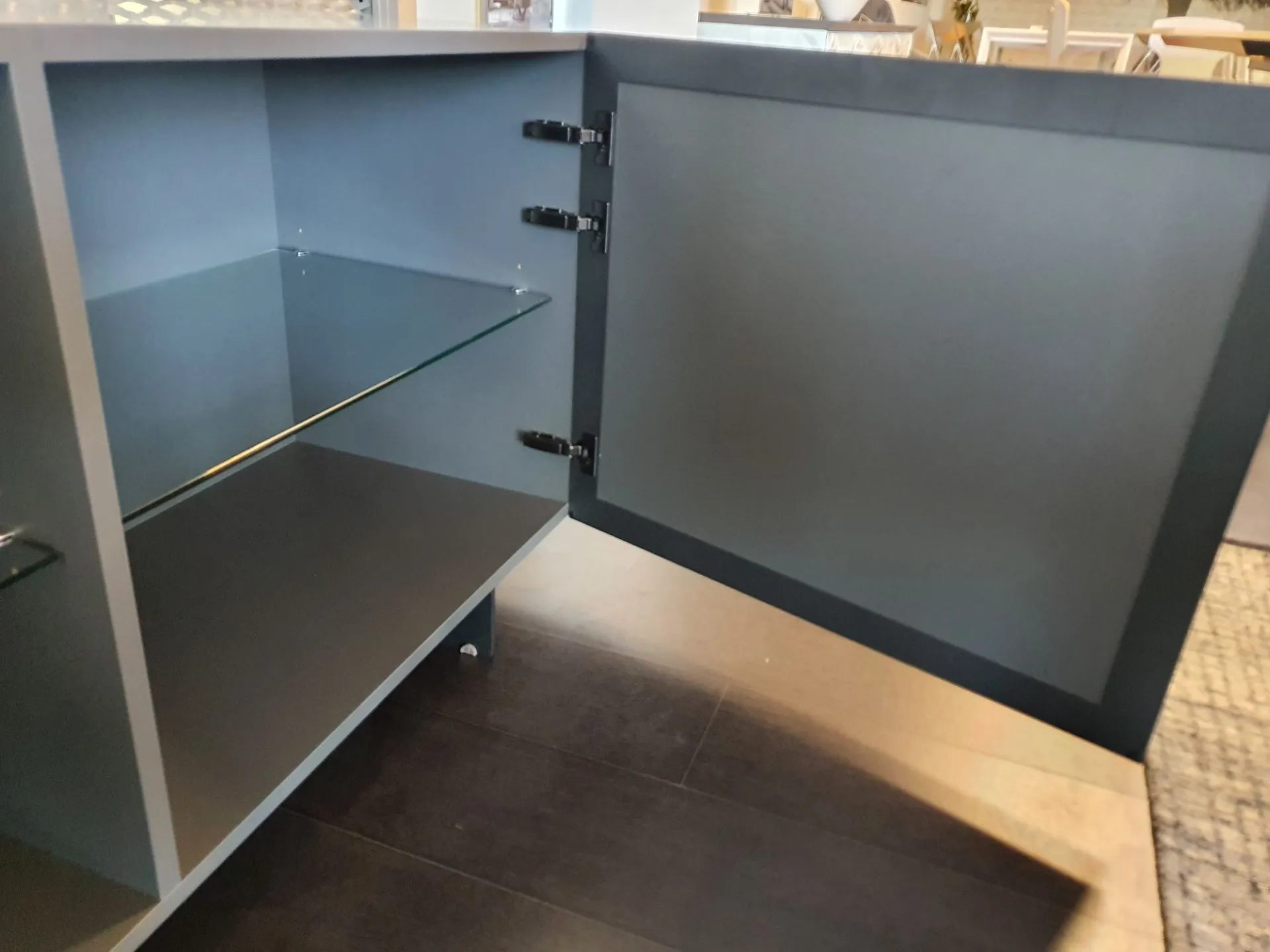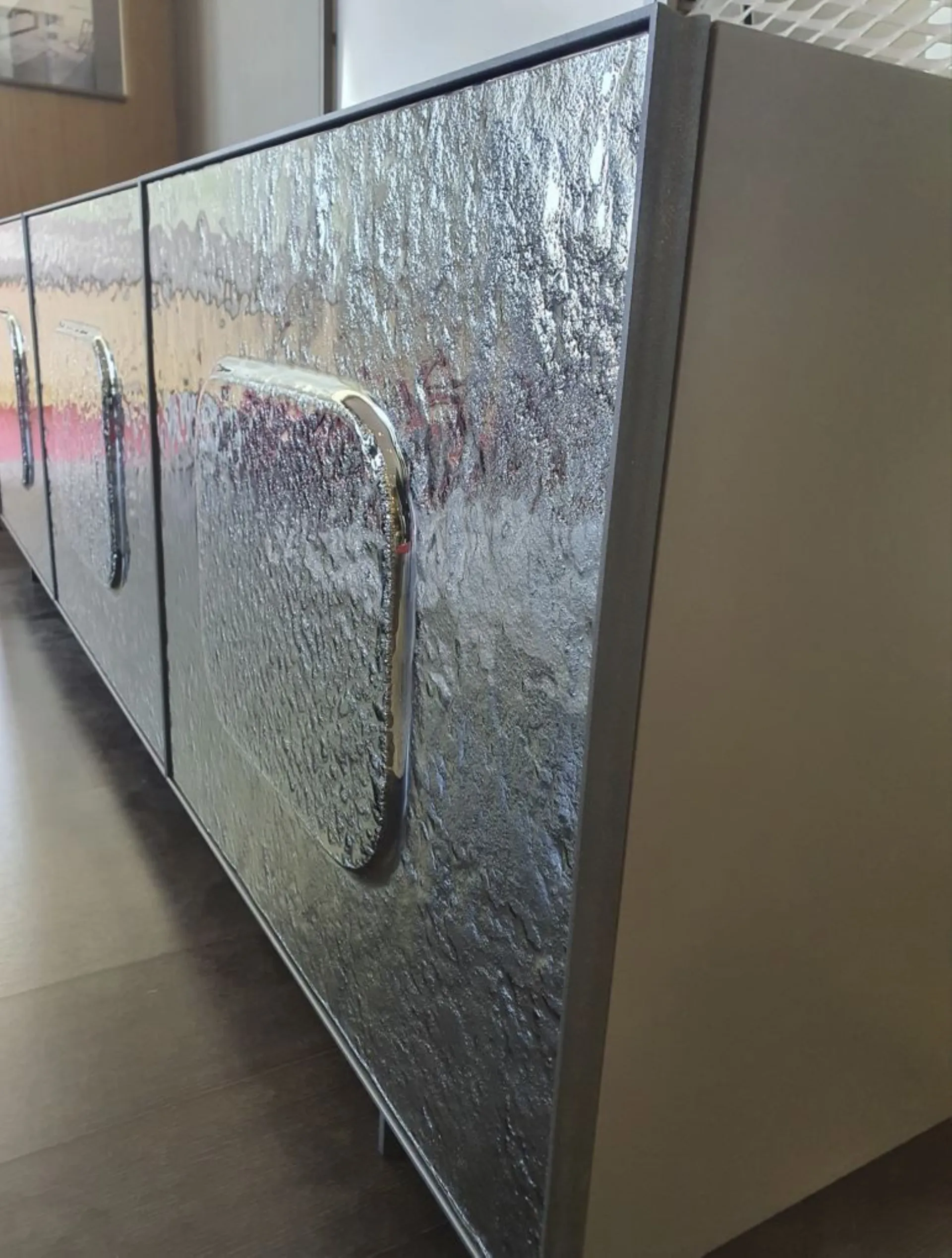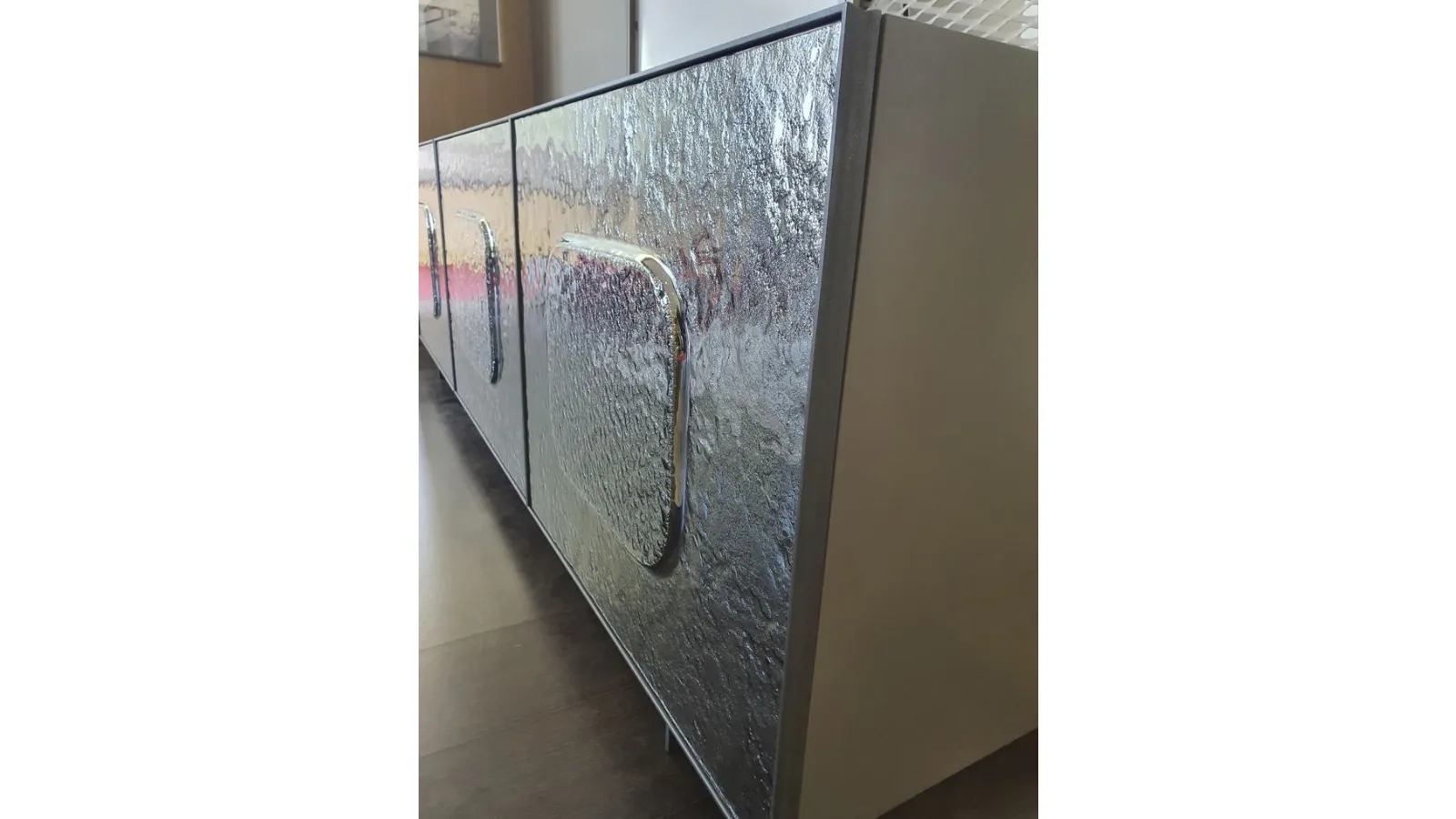Three-door sideboard model GIULIA with frosted glass fronts in smoke and silver VB02, matte graphite painted metal foot MT98, and matte lacquered slate top X06. Measurements: L.223xP.50xH.72 cm.