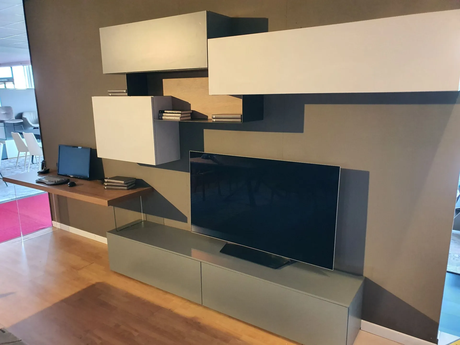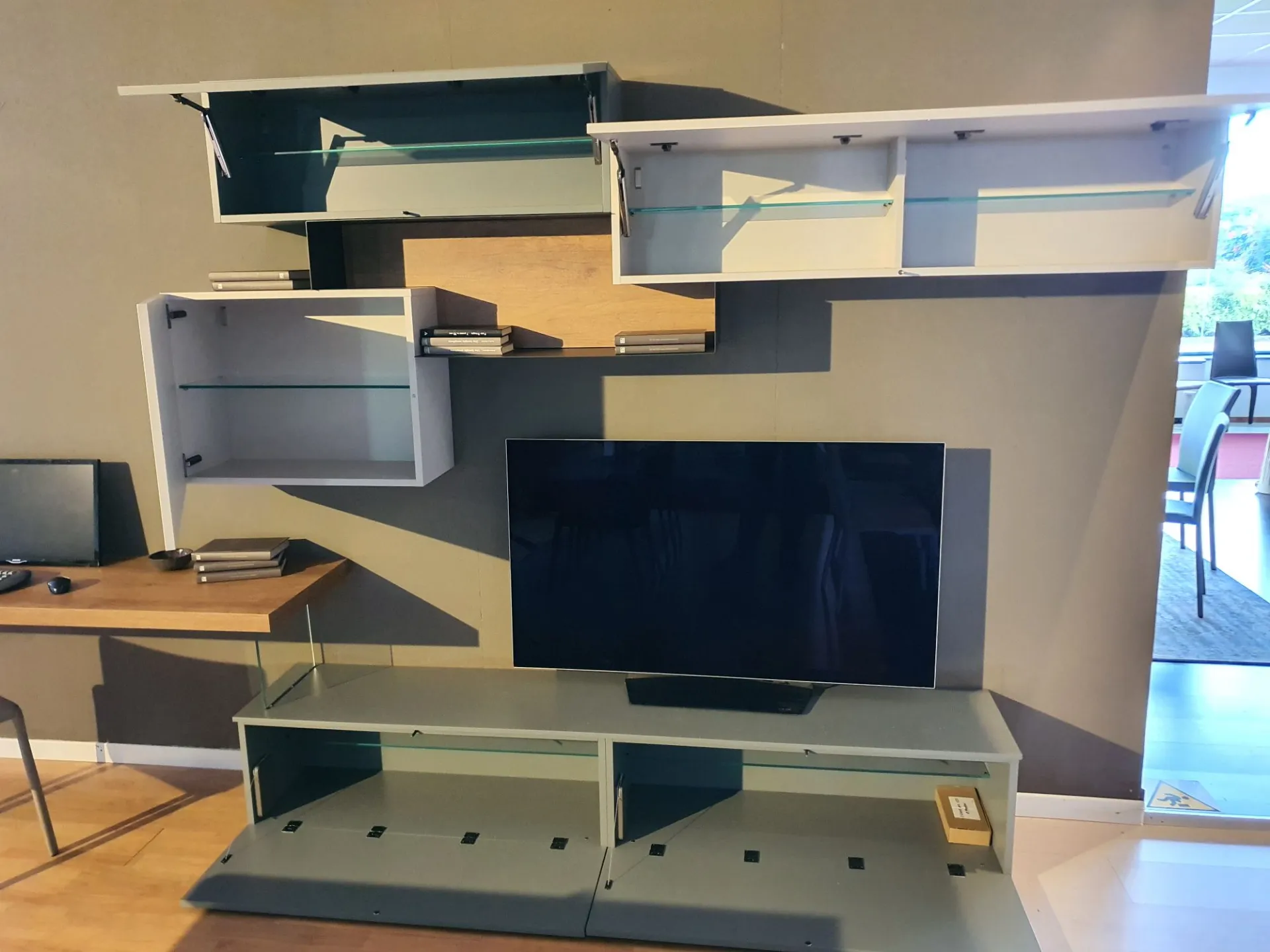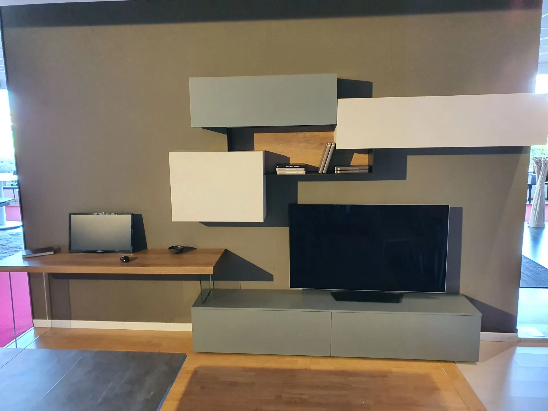 Atlas New 2023 living room in matte mother-of-pearl finish, light knotted textured finish, and matte Basalt lacquered finish. The composition measures cm. L.370-410xP.30/40/51.5xH.215. It is an optimal solution for those who also want a study area thanks to the glass-sided desk. The writing desk can also be placed on the right side. PRODUCT AVAILABLE FOR IMMEDIATE DELIVERY. Contact us for more information.