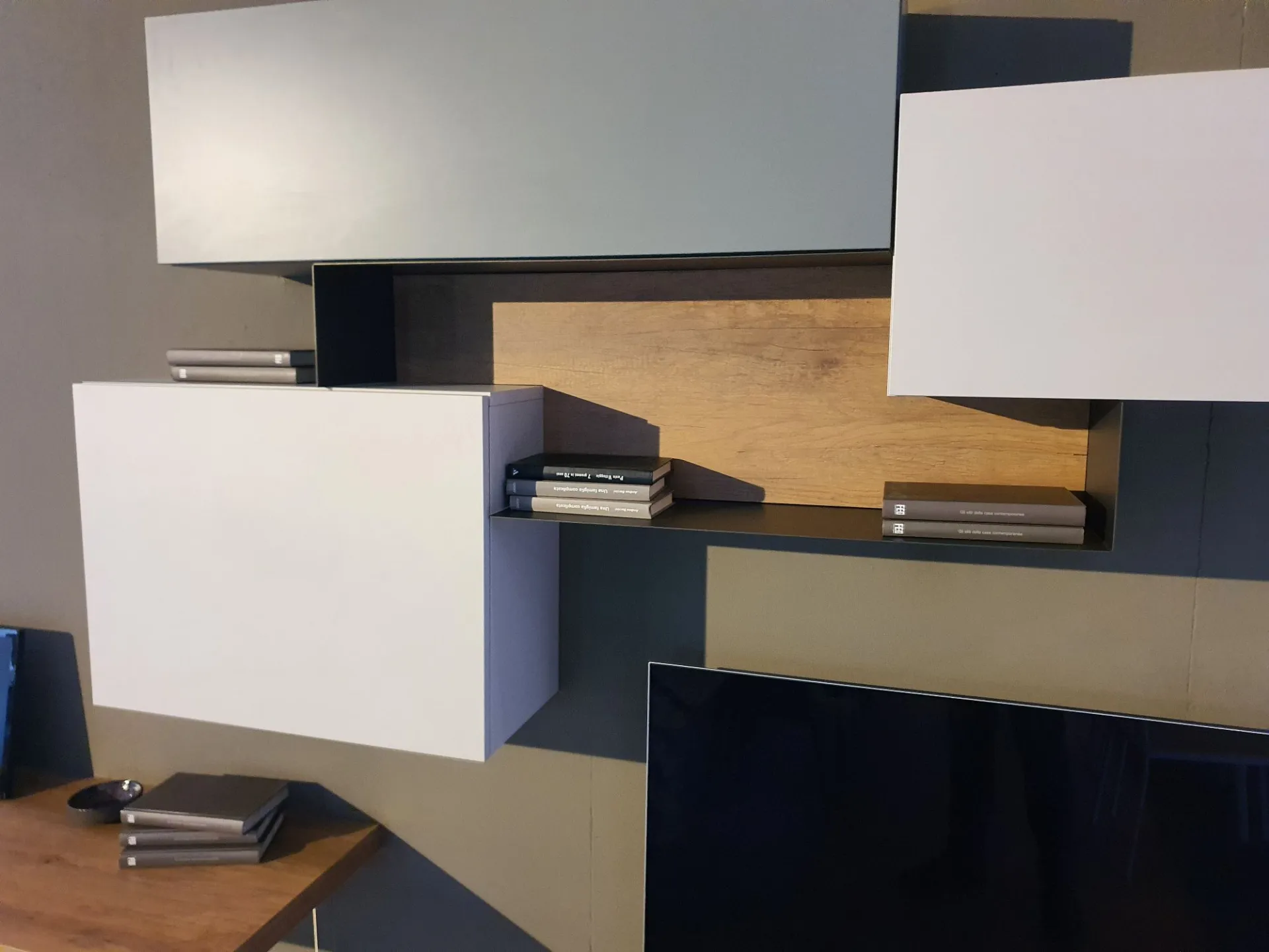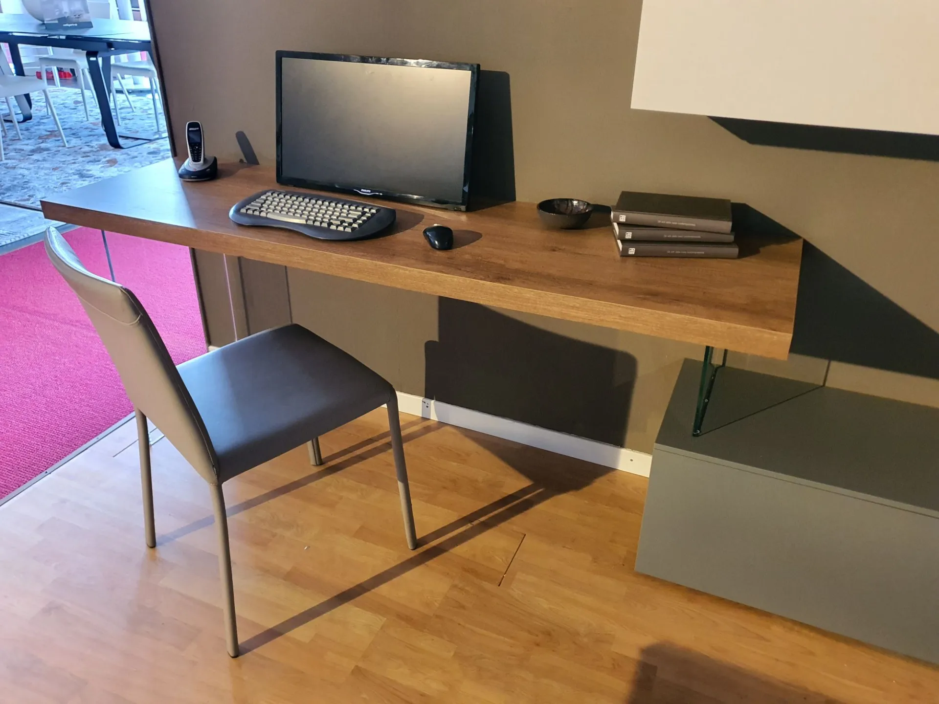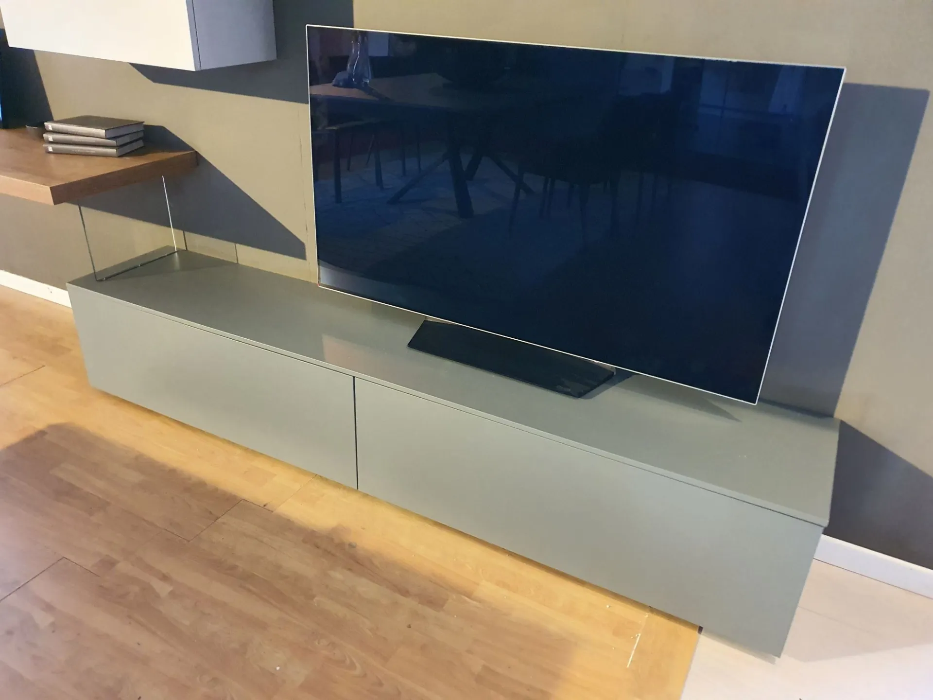 Atlas New 2023 living room in matte mother-of-pearl finish, light knotted textured finish, and matte Basalt lacquered finish. The composition measures cm. L.370-410xP.30/40/51.5xH.215. It is an optimal solution for those who also want a study area thanks to the glass-sided desk. The writing desk can also be placed on the right side. PRODUCT AVAILABLE FOR IMMEDIATE DELIVERY. Contact us for more information.