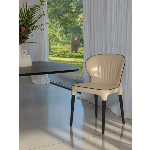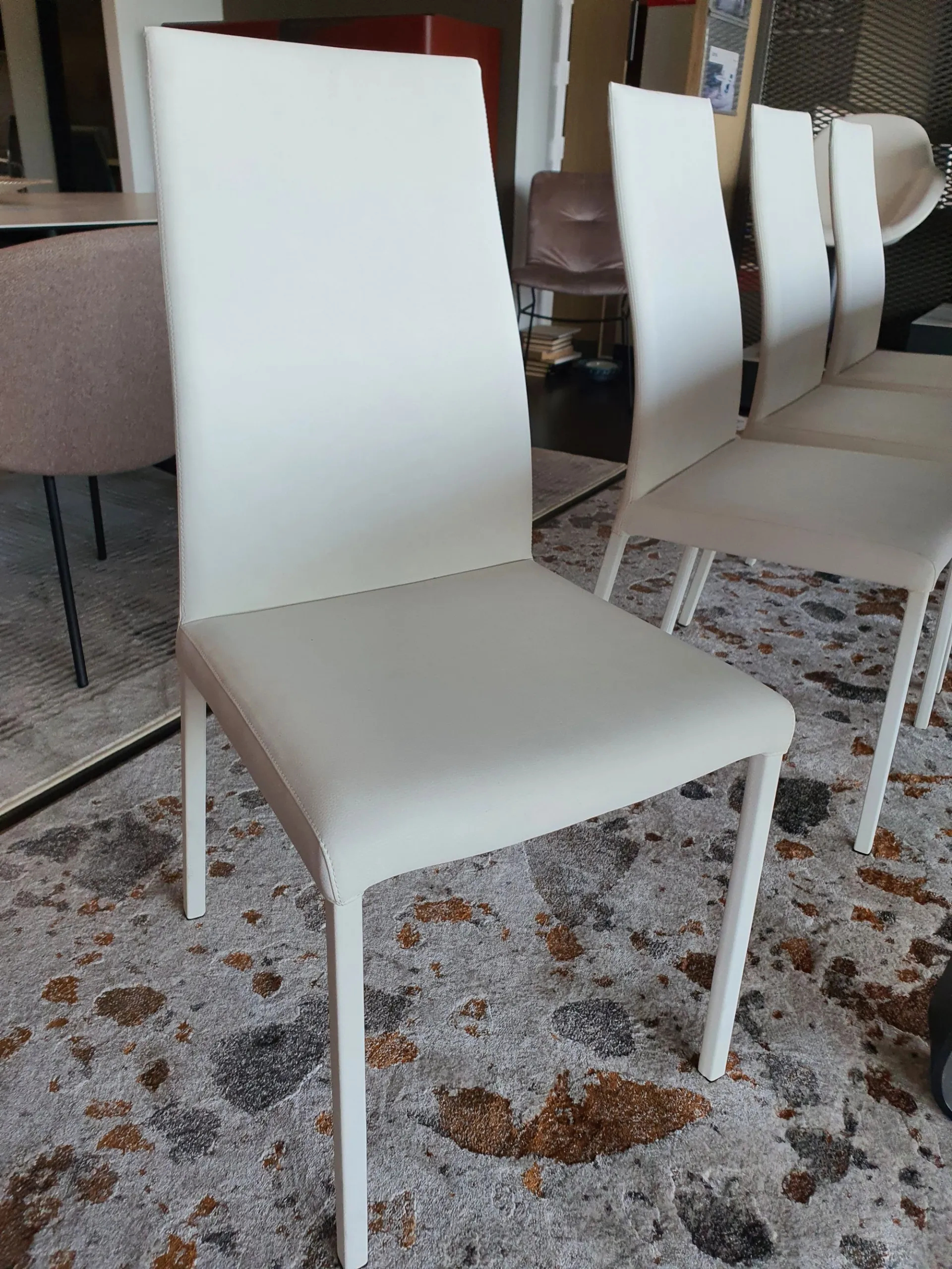 The Blitz chairs by Ozzio are extremely comfortable and elegant, fully covered including the legs so they have no limitations in terms of positioning and matching with other furniture. The particular shaping of the backrest provides a healthy lumbar support. Covered in white nabuk eco-leather. Availability of 4 chairs.