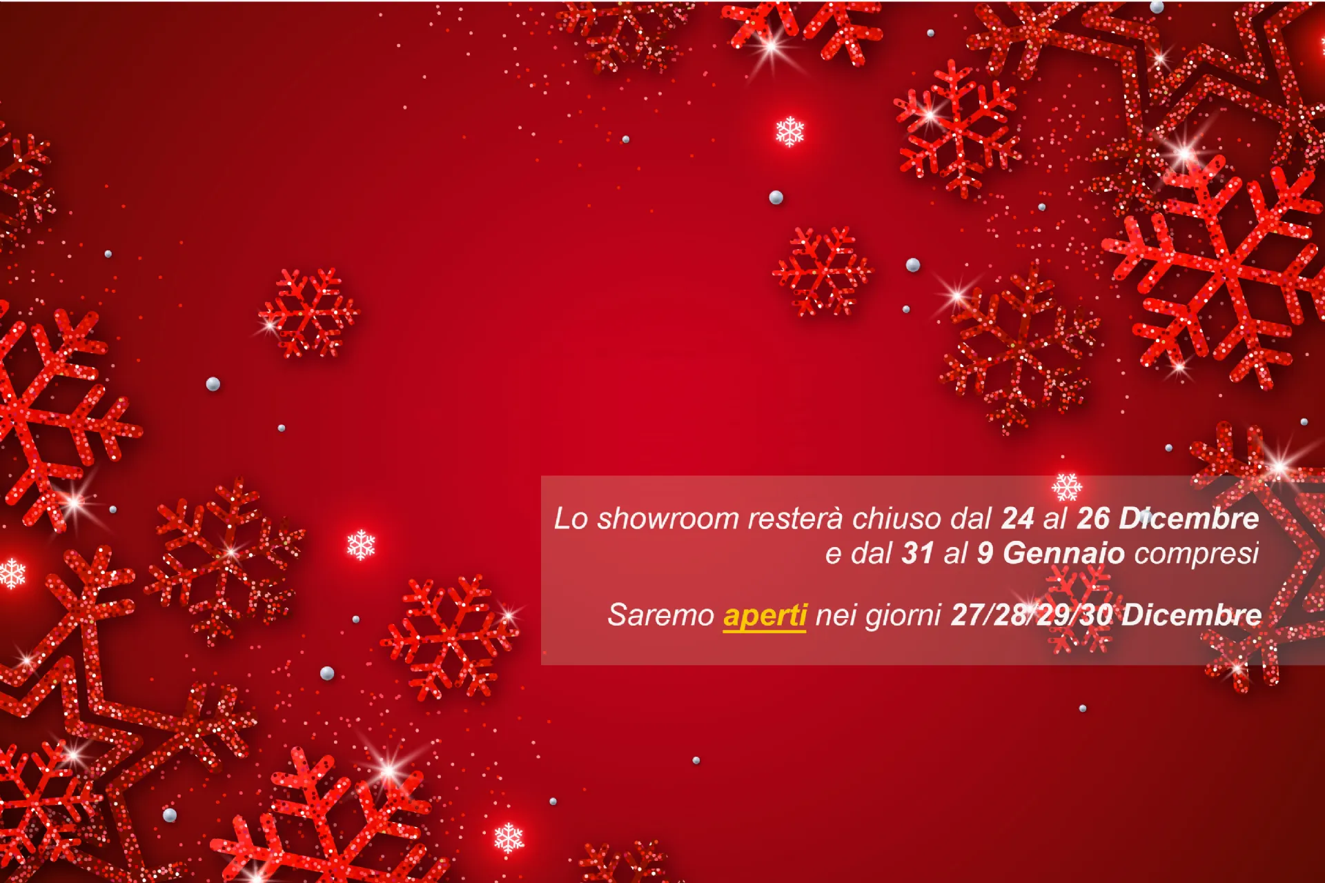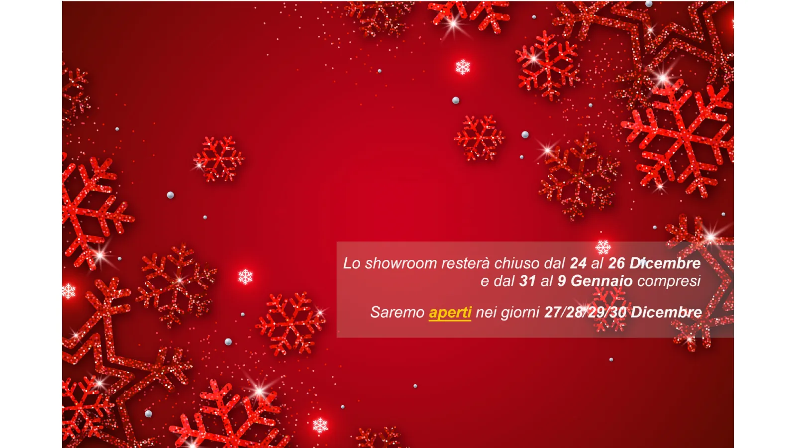 On the occasion of the Festività Christmas, from 24 to 26 December 2021 and from 31 to 9 January 2022 , our showroom will remainà Closed