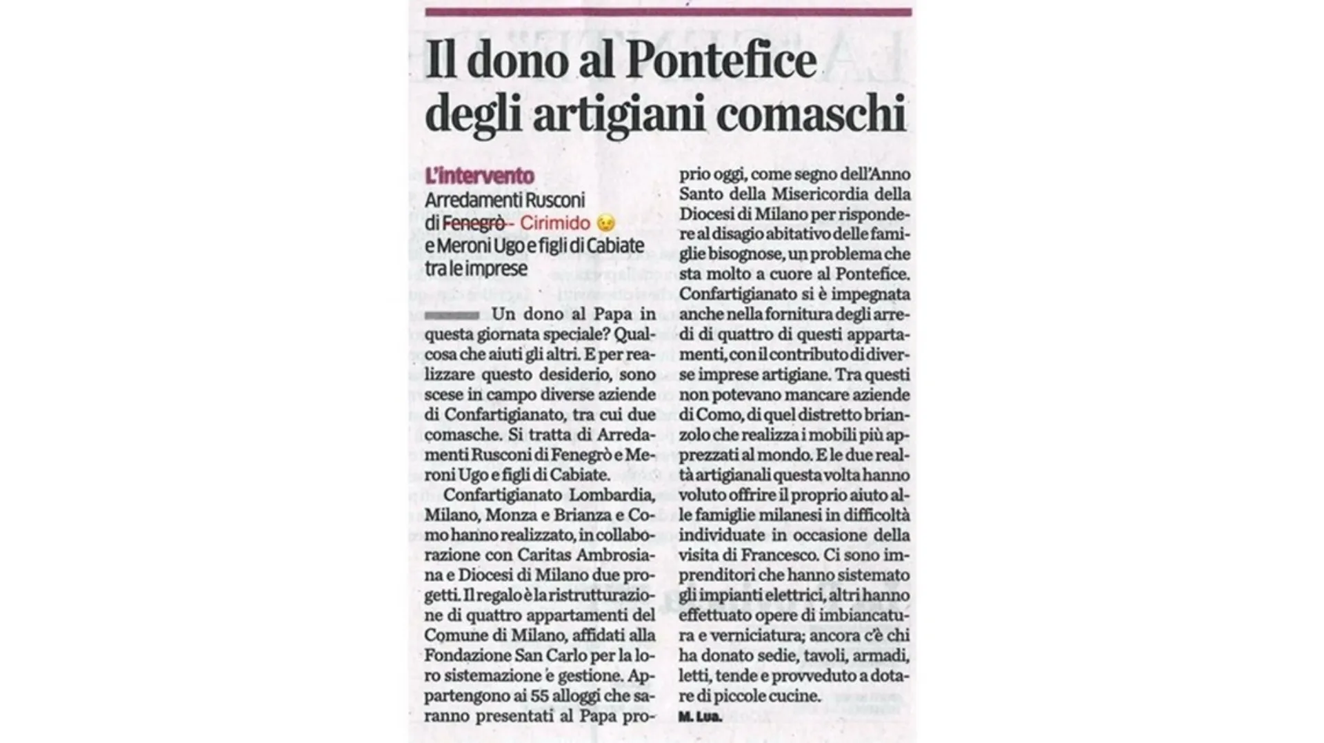 Apartments between 40 and 70 square meters made new habitable. A gift to the cityà in the name of Francesco realized thanks to the Lombard artisans and their generosityà ;. « A gift in the gift. Dall’ electrical system, all’ plumbing, whitewashing, finishing, curtains, practically ready. About fifteen companies in the territory who wanted to join the initiative on the 26-rsquo offering not only their time and their work, but also the necessary furniture: chairs, tables, wardrobes, beds, curtains, nonché small custom kitchens. A simple gesture to respond to the disadvantaged housing of needy families, when we look at these people we are helping today, we must realize how lucky we are.
