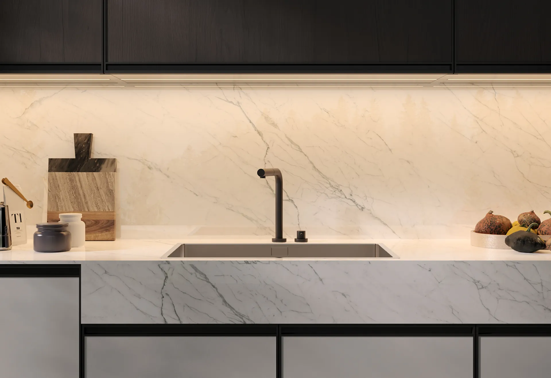 Kitchen worktop in marble-effect porcelain stoneware and more