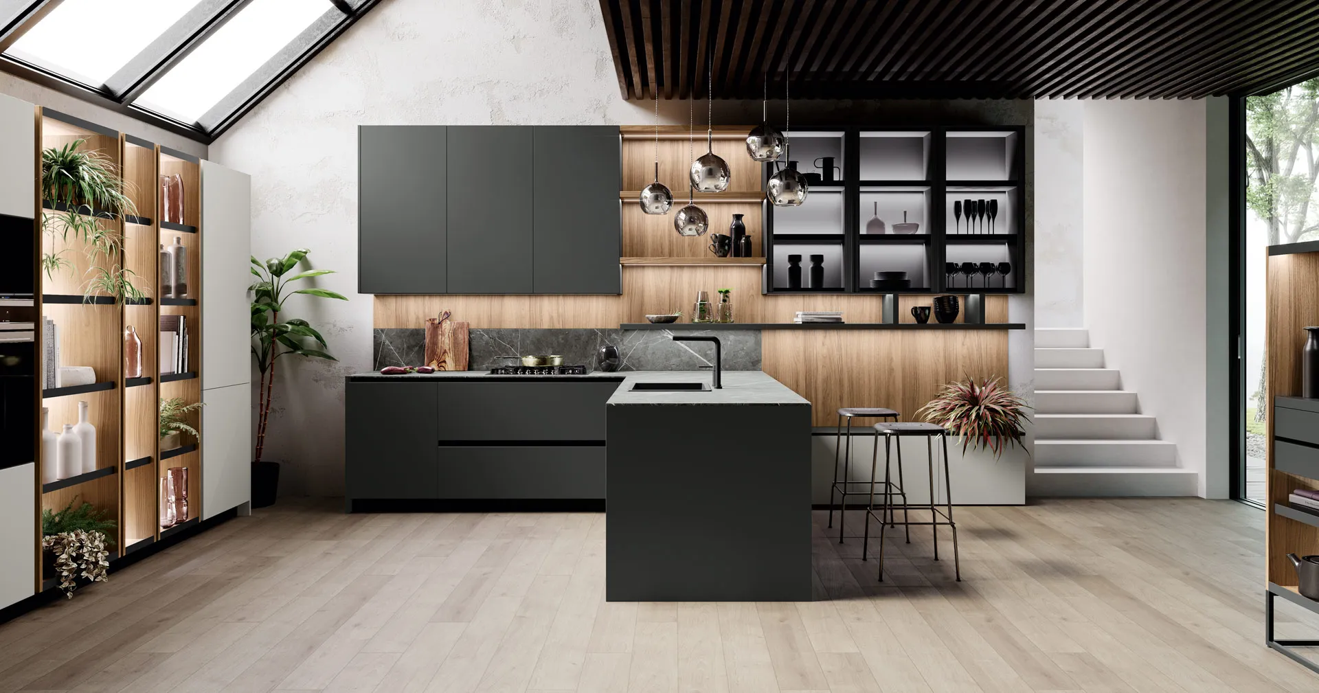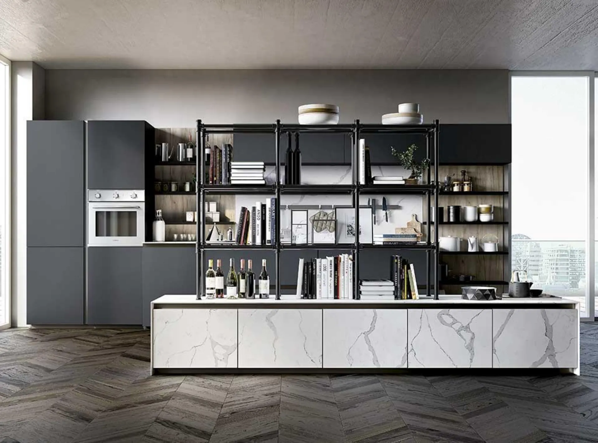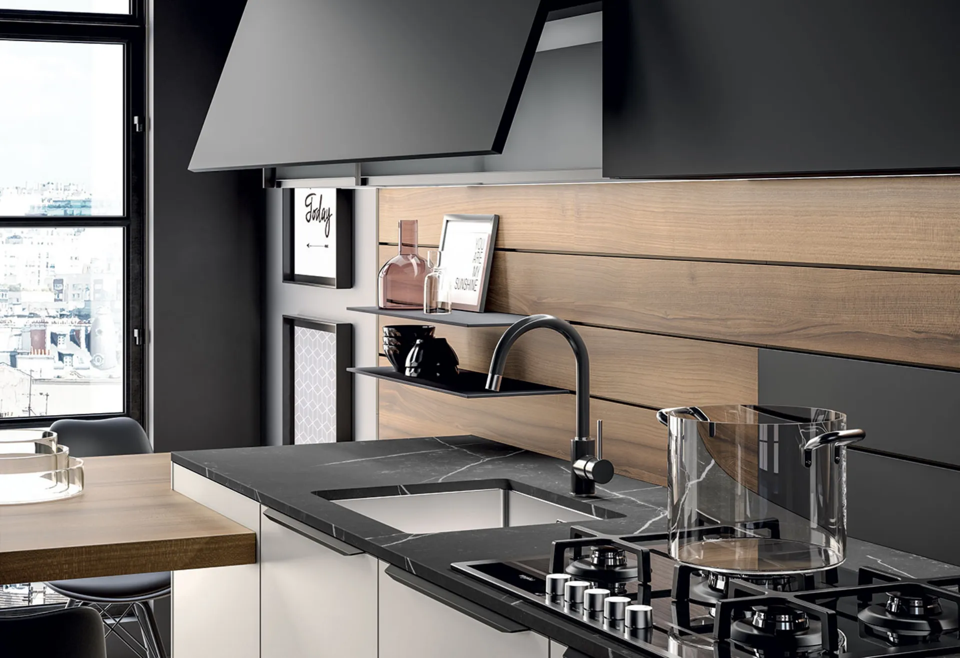 A worktop very resistant to scratches, stains, high temperatures and UV rays, the one made of Dekton , a mixture of glass, innovative ceramic materials and quartz. A very compact and therefore hygienic material, which remains stable over time and which can take a toll; be customized in thickness (from 4 to 30 millimeters) and in formats (the large slabs guarantee visual continuity).