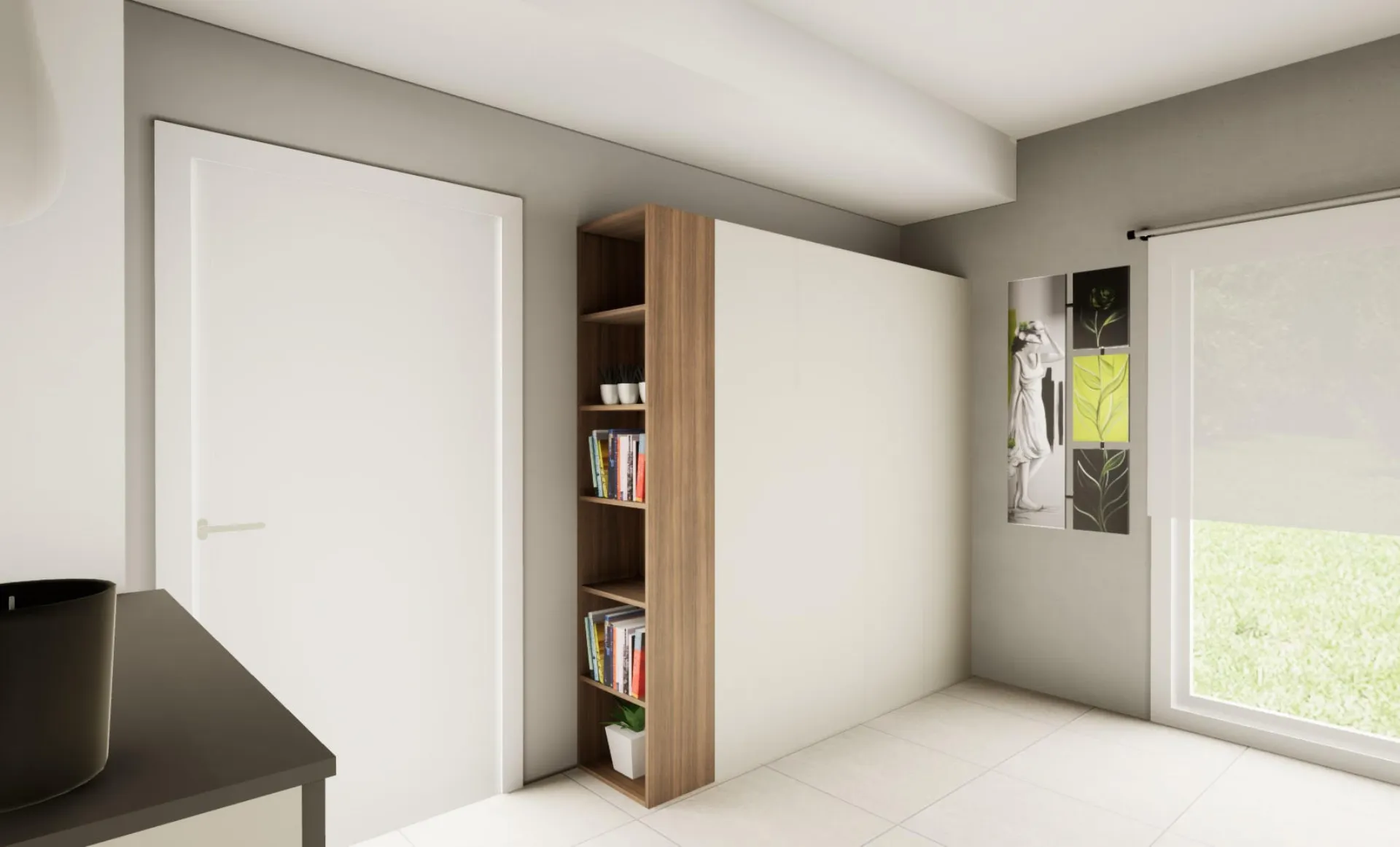 To avoid the closing effect given by the presence of this tall equipped column, we have designed and conceived an open end unit , characterized by 6 shelves that act as a bookcase.