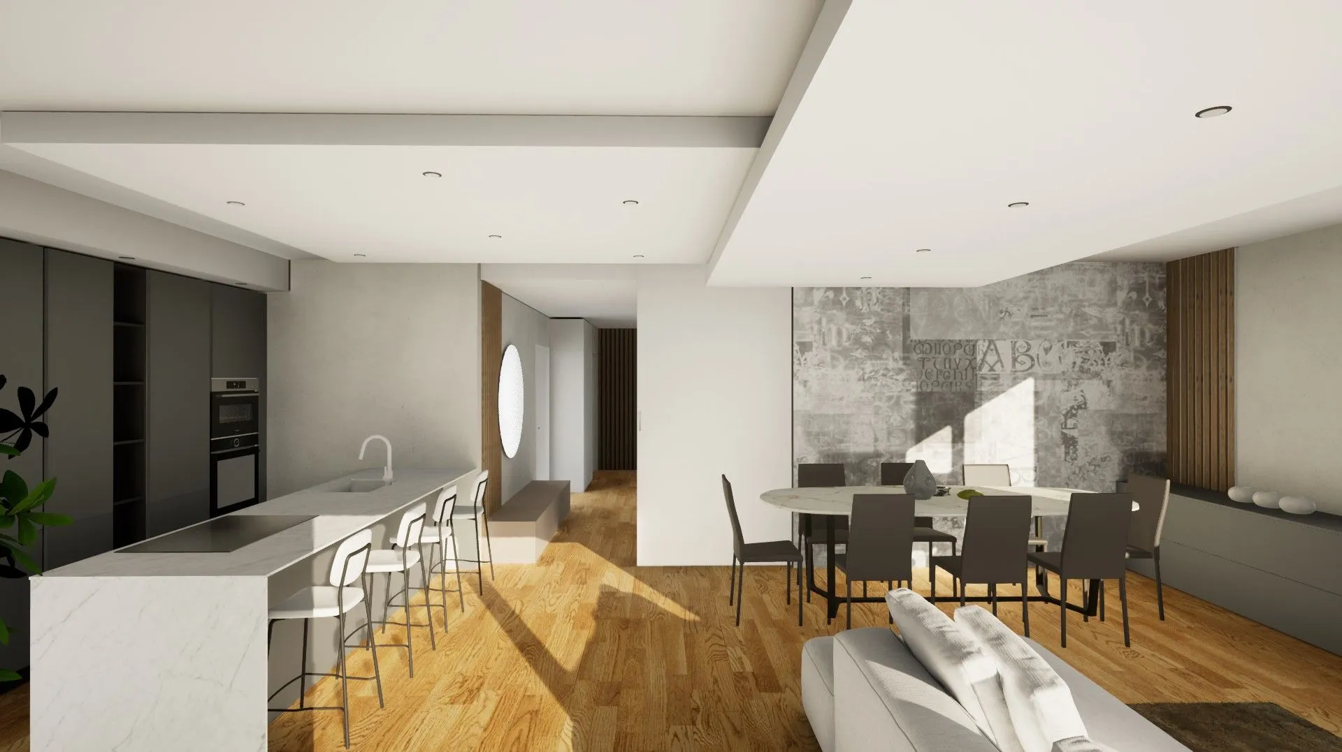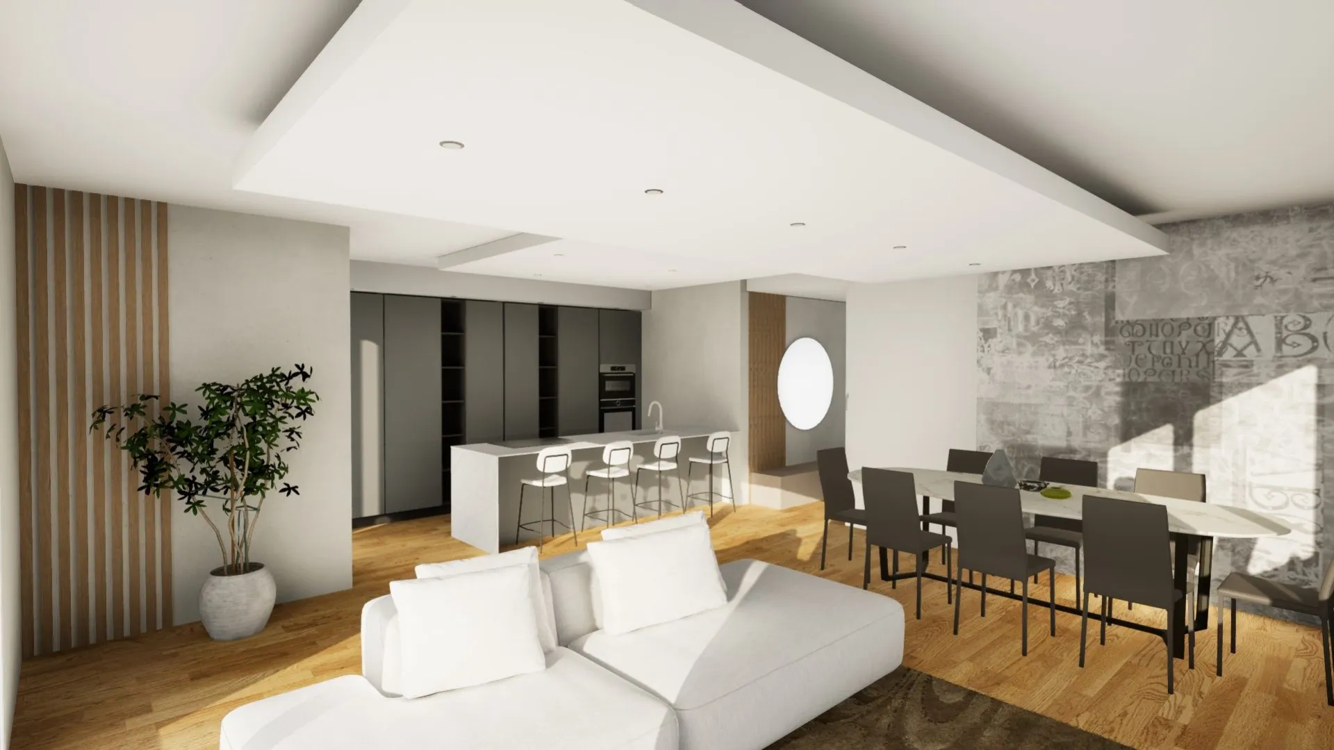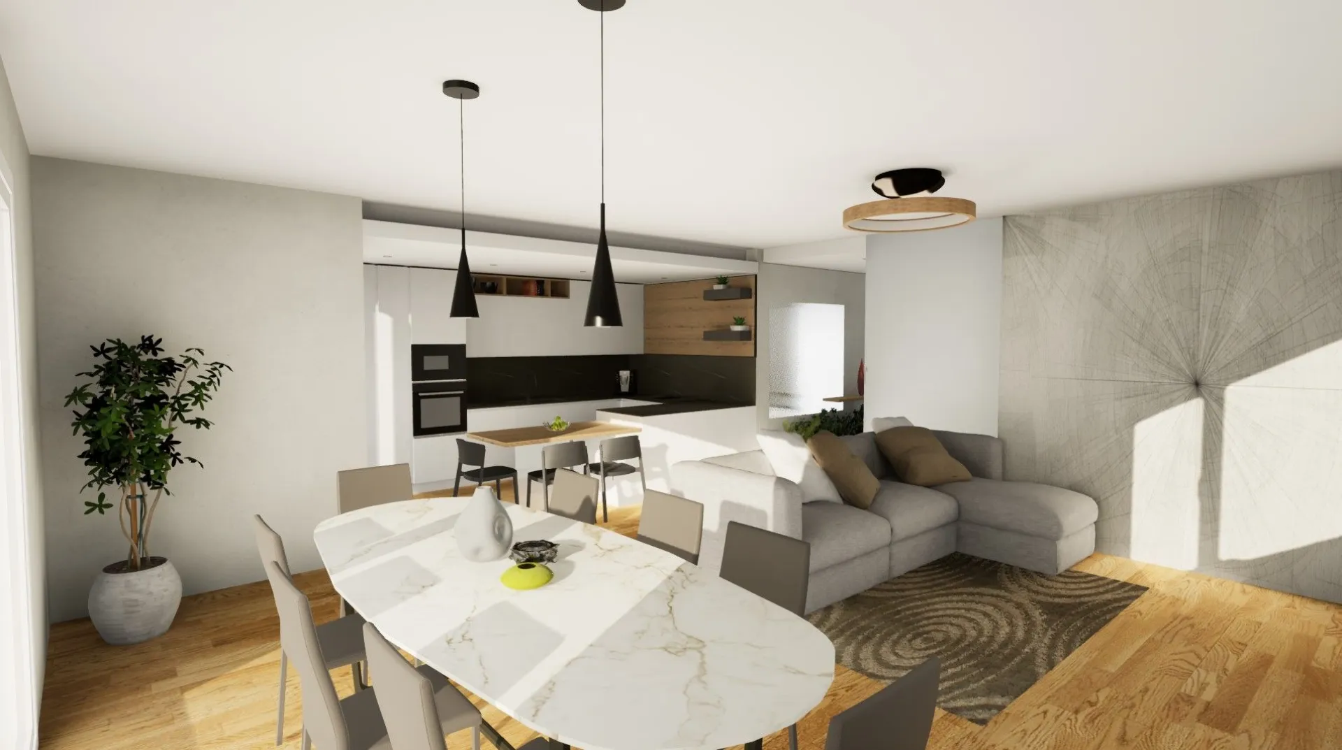 By wearing a VR headset, you can explore every furnished environment, observe proportions, volumes, and distances, truly perceive the spaces, and understand their functionality. This makes it possible to immediately assess whether your choices meet your everyday needs, avoiding uncertainty and second thoughts later on. One of the key advantages of Virtuo is the ability to interact with the project in real time: colors, finishes, and materials can be changed instantly, allowing you to compare different solutions and evaluate their aesthetic impact. It is also possible to simulate the effect of natural light, observing how the environment changes according to sunlight intensity and time of day—an essential aspect for confidently choosing tones, surfaces, and combinations. Moving within your virtual home also allows you to appreciate the design of the selected furnishings, verify the correct organization of spaces, and identify any improvements before final implementation.