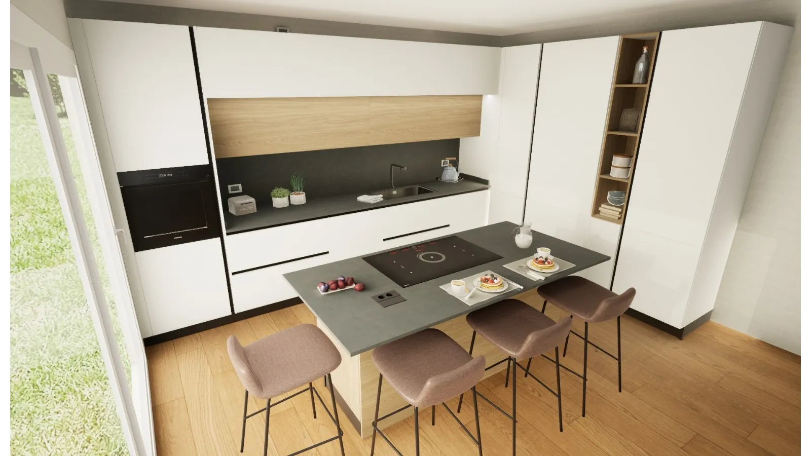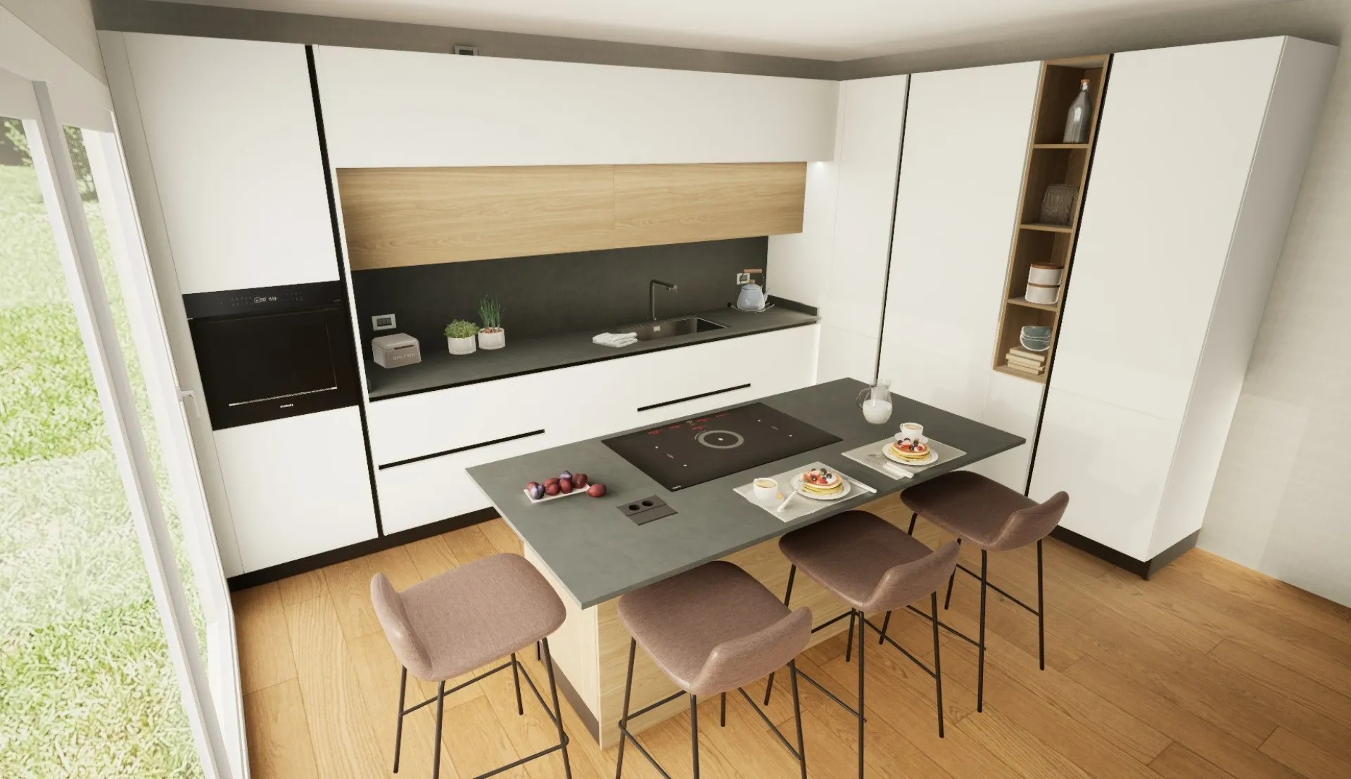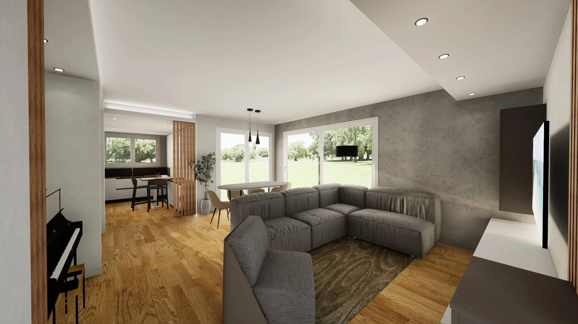 By wearing a VR headset, you can explore every furnished environment, observe proportions, volumes, and distances, truly perceive the spaces, and understand their functionality. This makes it possible to immediately assess whether your choices meet your everyday needs, avoiding uncertainty and second thoughts later on. One of the key advantages of Virtuo is the ability to interact with the project in real time: colors, finishes, and materials can be changed instantly, allowing you to compare different solutions and evaluate their aesthetic impact. It is also possible to simulate the effect of natural light, observing how the environment changes according to sunlight intensity and time of day—an essential aspect for confidently choosing tones, surfaces, and combinations. Moving within your virtual home also allows you to appreciate the design of the selected furnishings, verify the correct organization of spaces, and identify any improvements before final implementation.