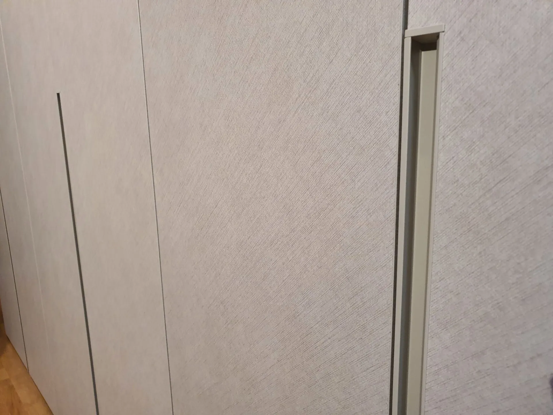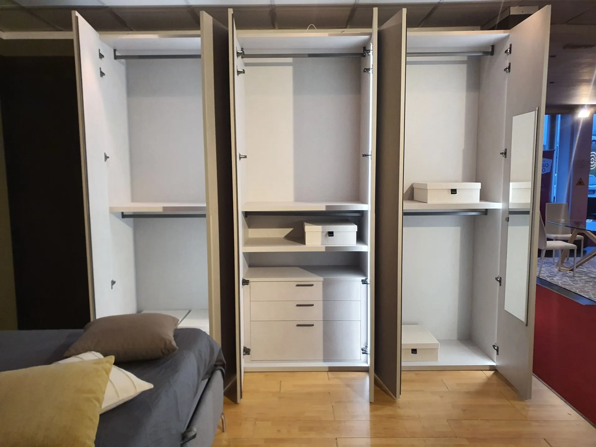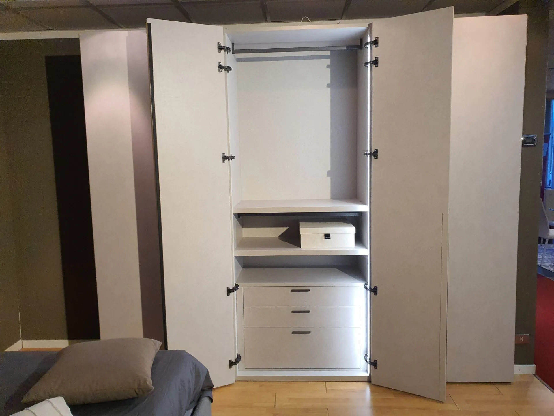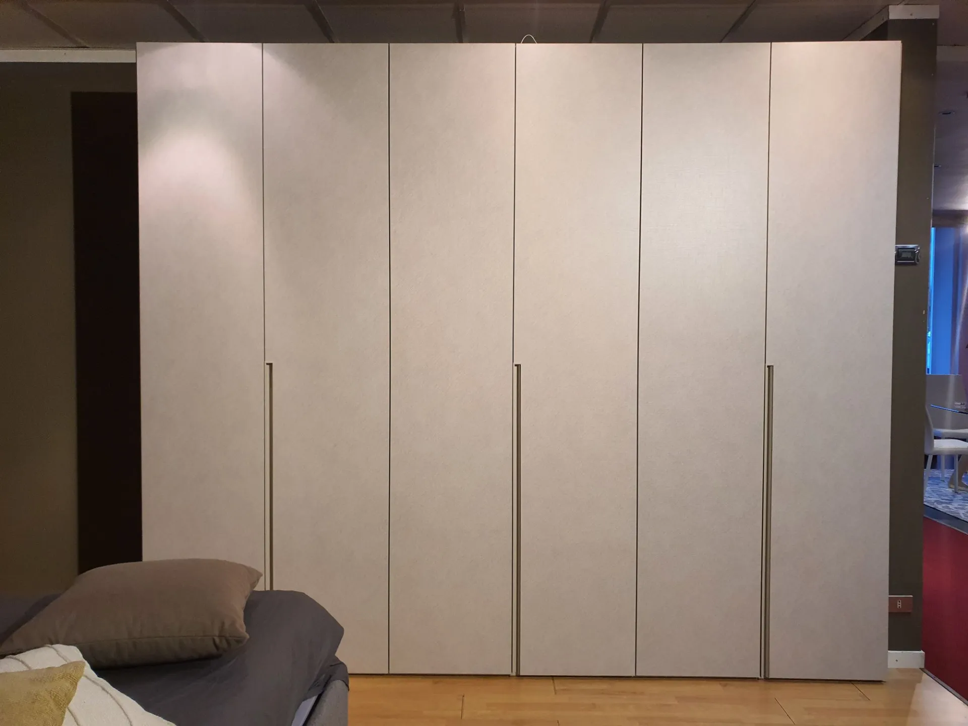 Wardrobe model DORIS composed of 6 swing doors measuring L.98 cm. External and internal finish in canvas material with integrated half groove in matte lacquered sand color. The hinges in the central compartment have a 180° opening angle for easier access to the internal drawer.