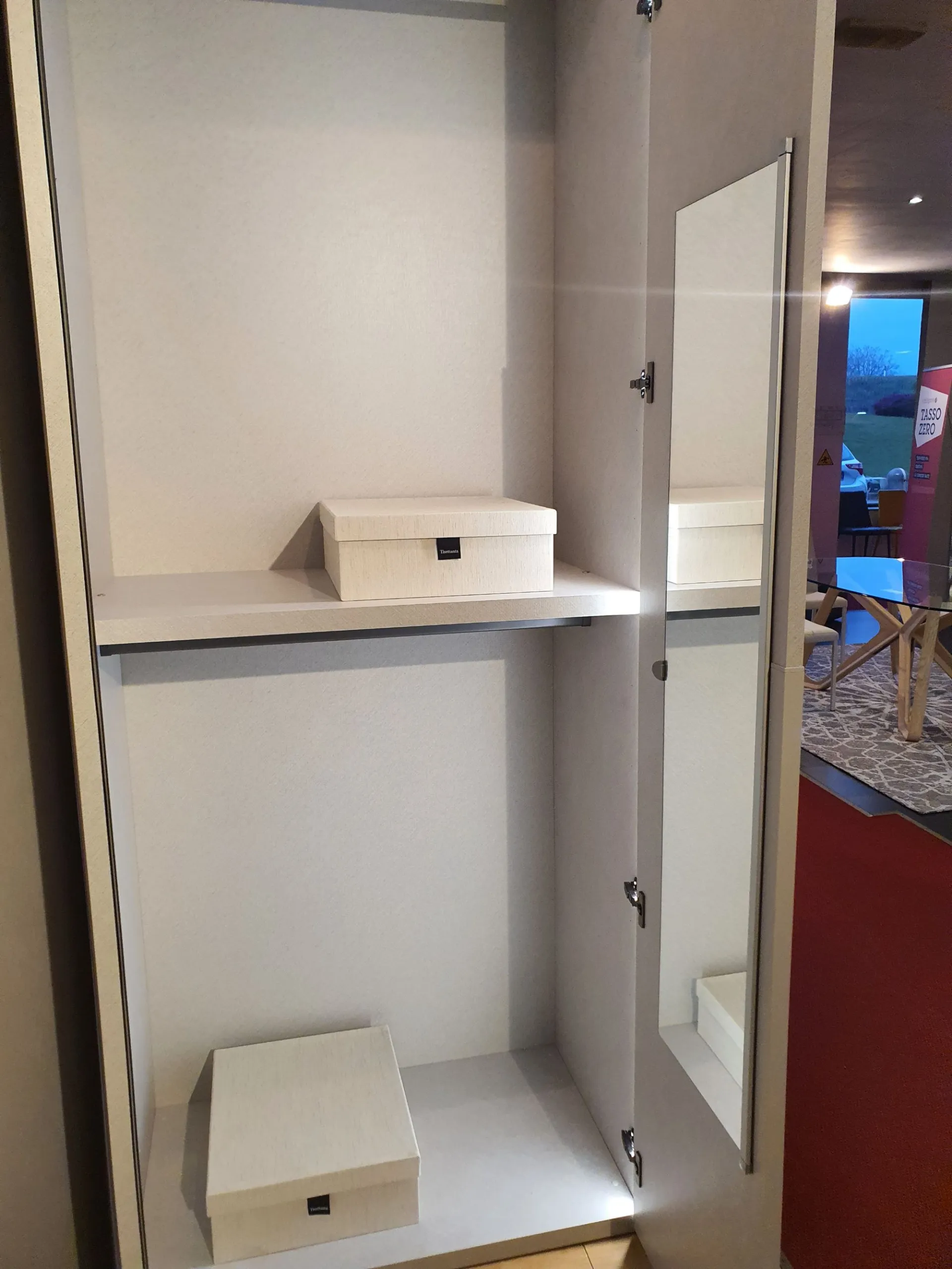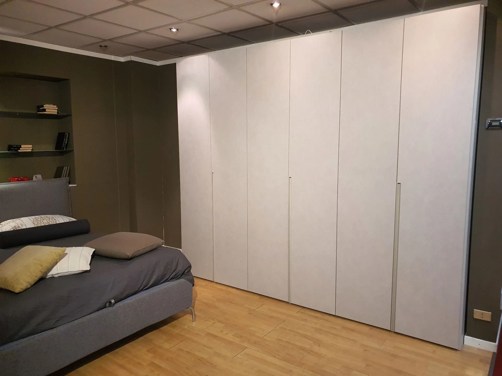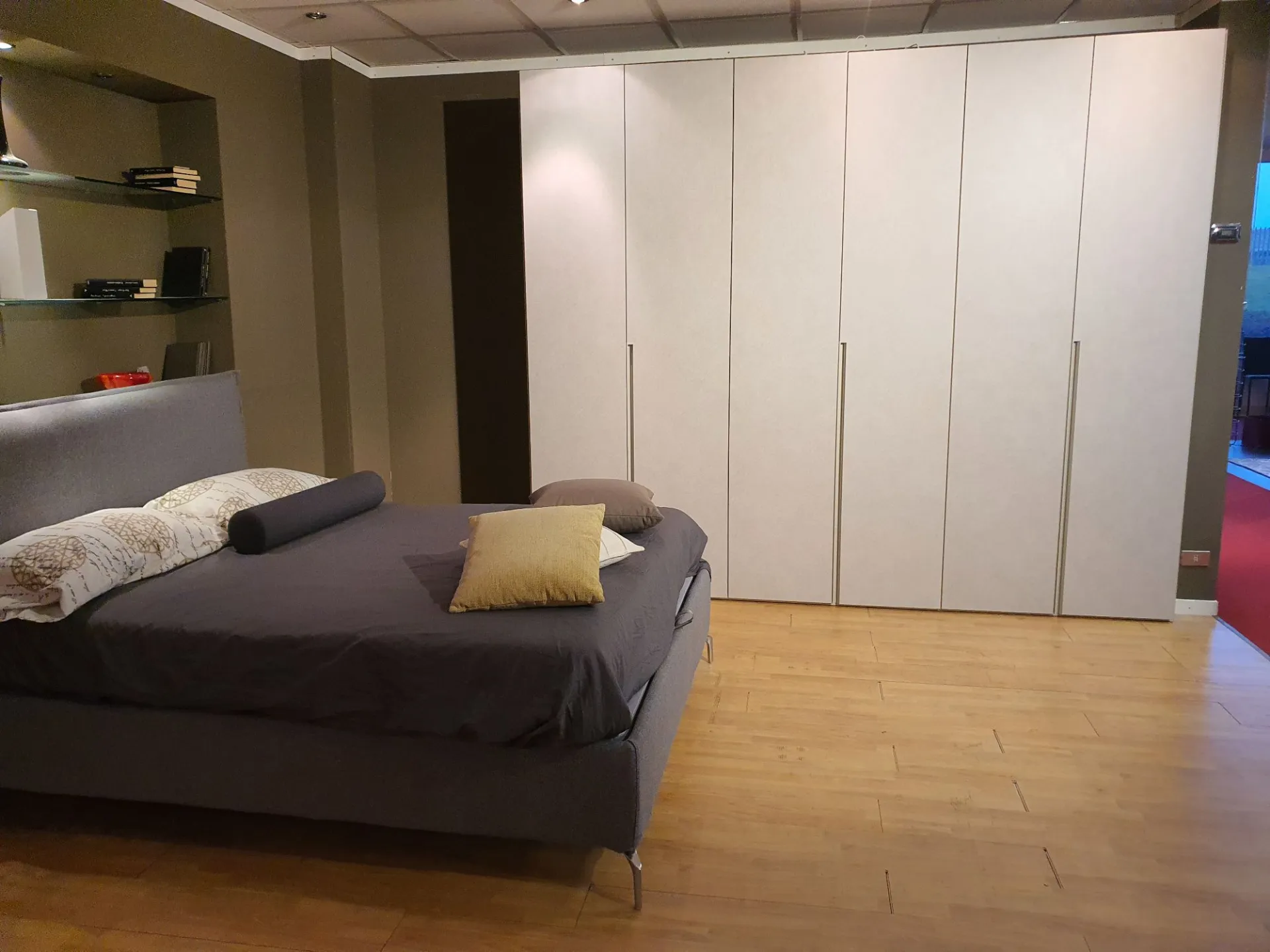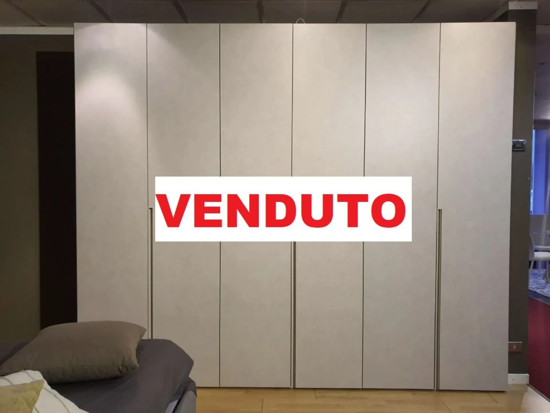 Wardrobe model DORIS composed of 6 swing doors measuring L.98 cm. External and internal finish in canvas material with integrated half groove in matte lacquered sand color. The hinges in the central compartment have a 180° opening angle for easier access to the internal drawer.