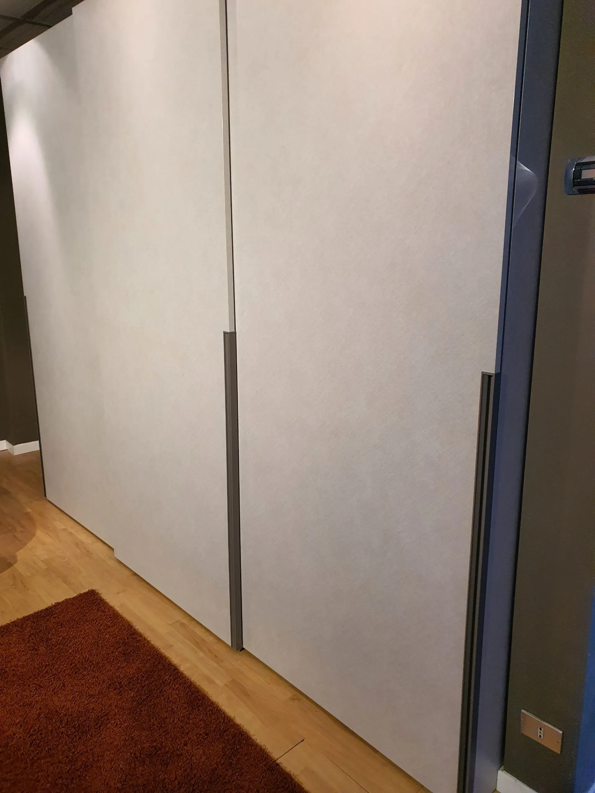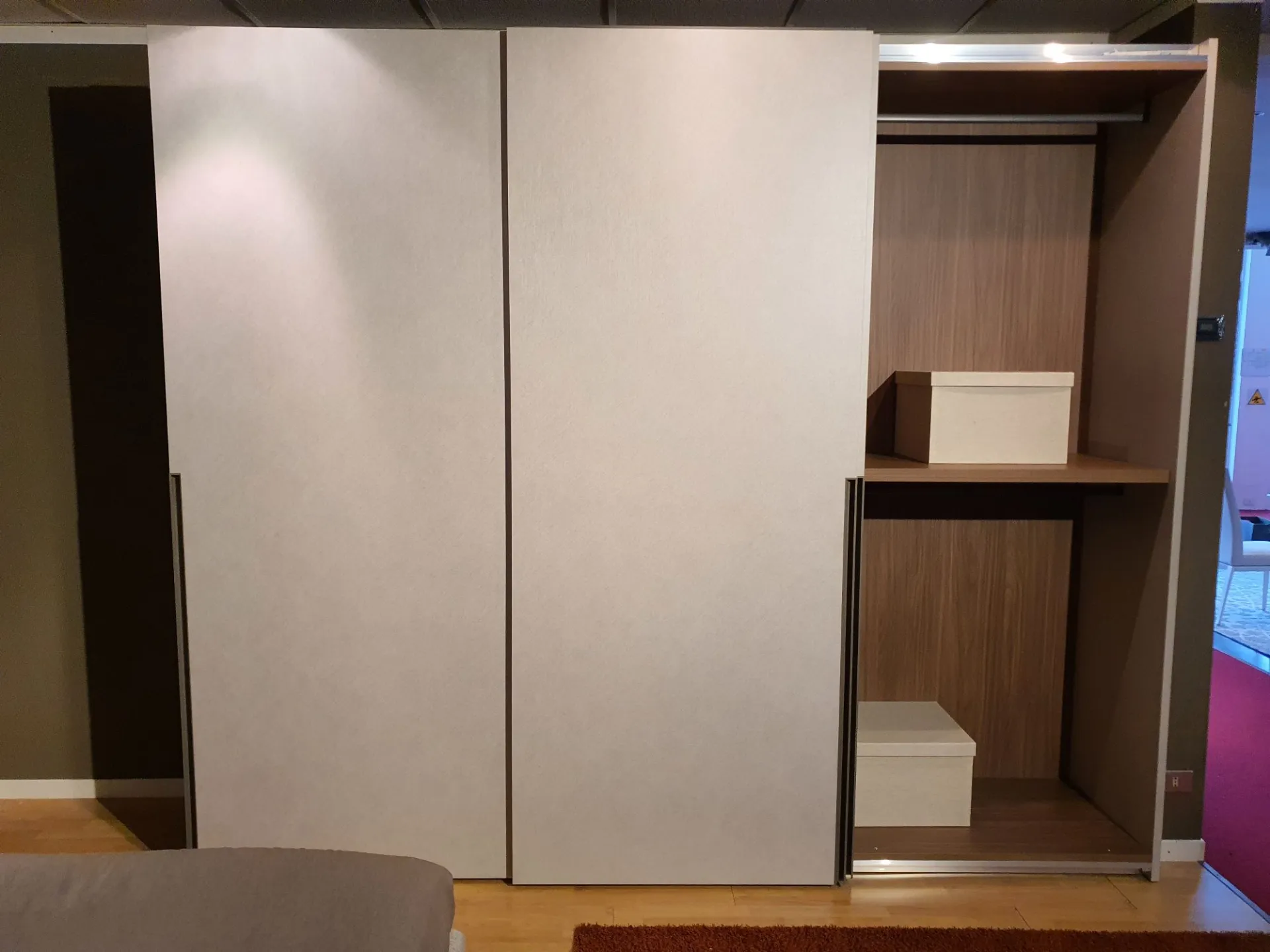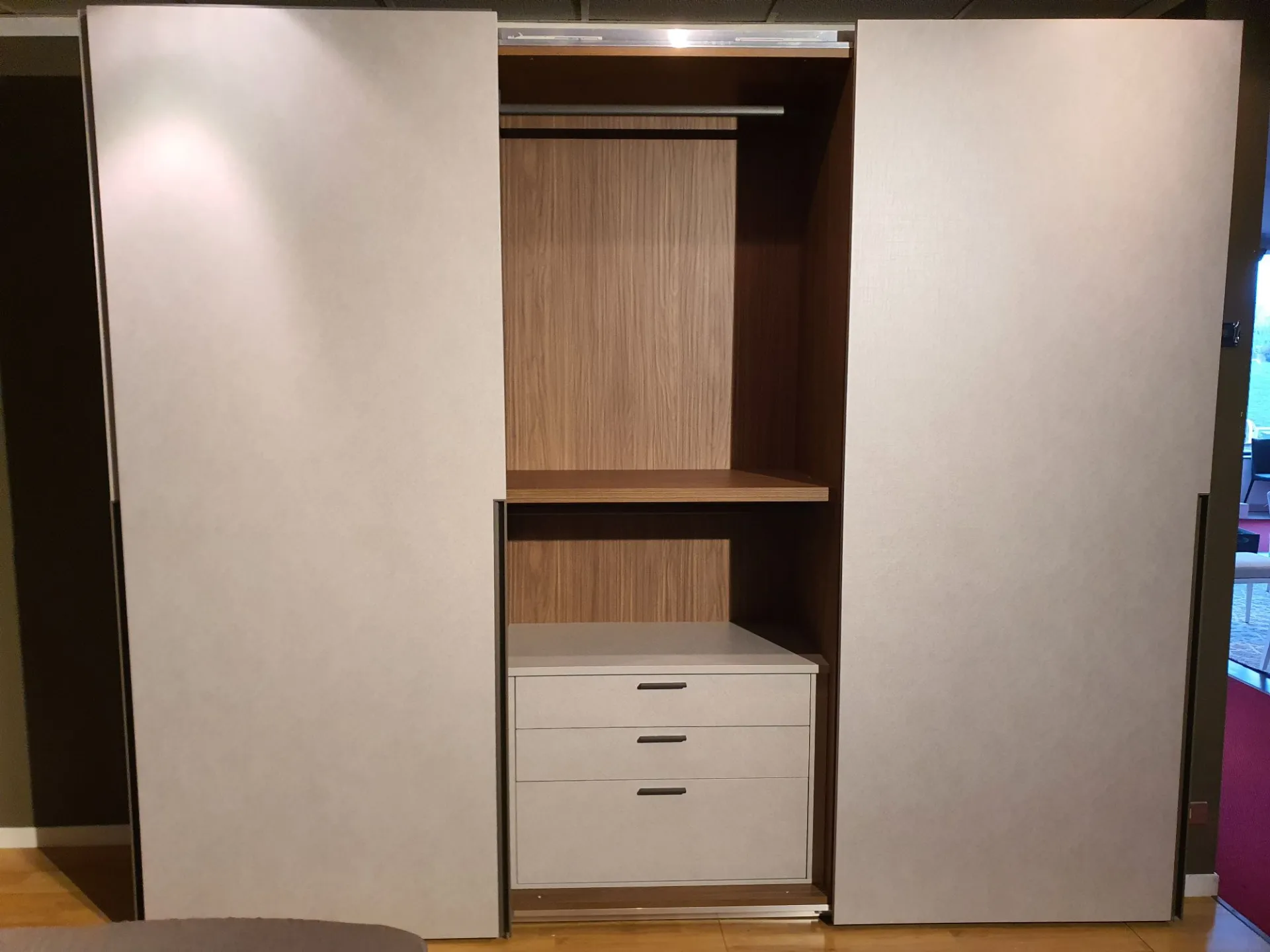 Sliding wardrobe with three doors DORIS. Thanks to the metal handle integrated into the door that divides the height of the wardrobe in two, it will be convenient to open and close the doors. A decorative feature, but also a very practical detail that facilitates the grip and sliding of the door. Internally the wardrobe is equipped with: - n.3 central internal shelves - internal drawer unit with two drawers + a basket, clothes hanging rods The internal equipment can be integrated with additional components upon request. The finish of the wardrobe is in CANVAS material with a lacquered metal handle in GRAY PIACENZA color. The interior is in WALNUT material. The overall dimensions are cm L.304xP.65xH.255. CONTACT US FOR MORE INFORMATION!