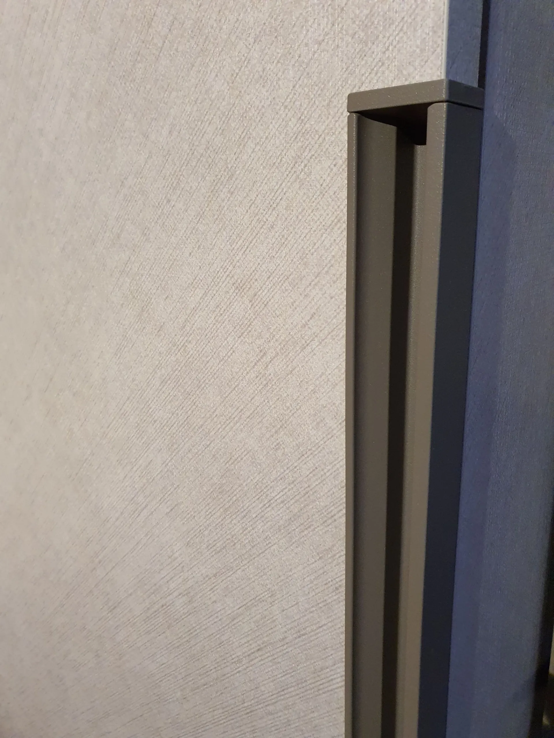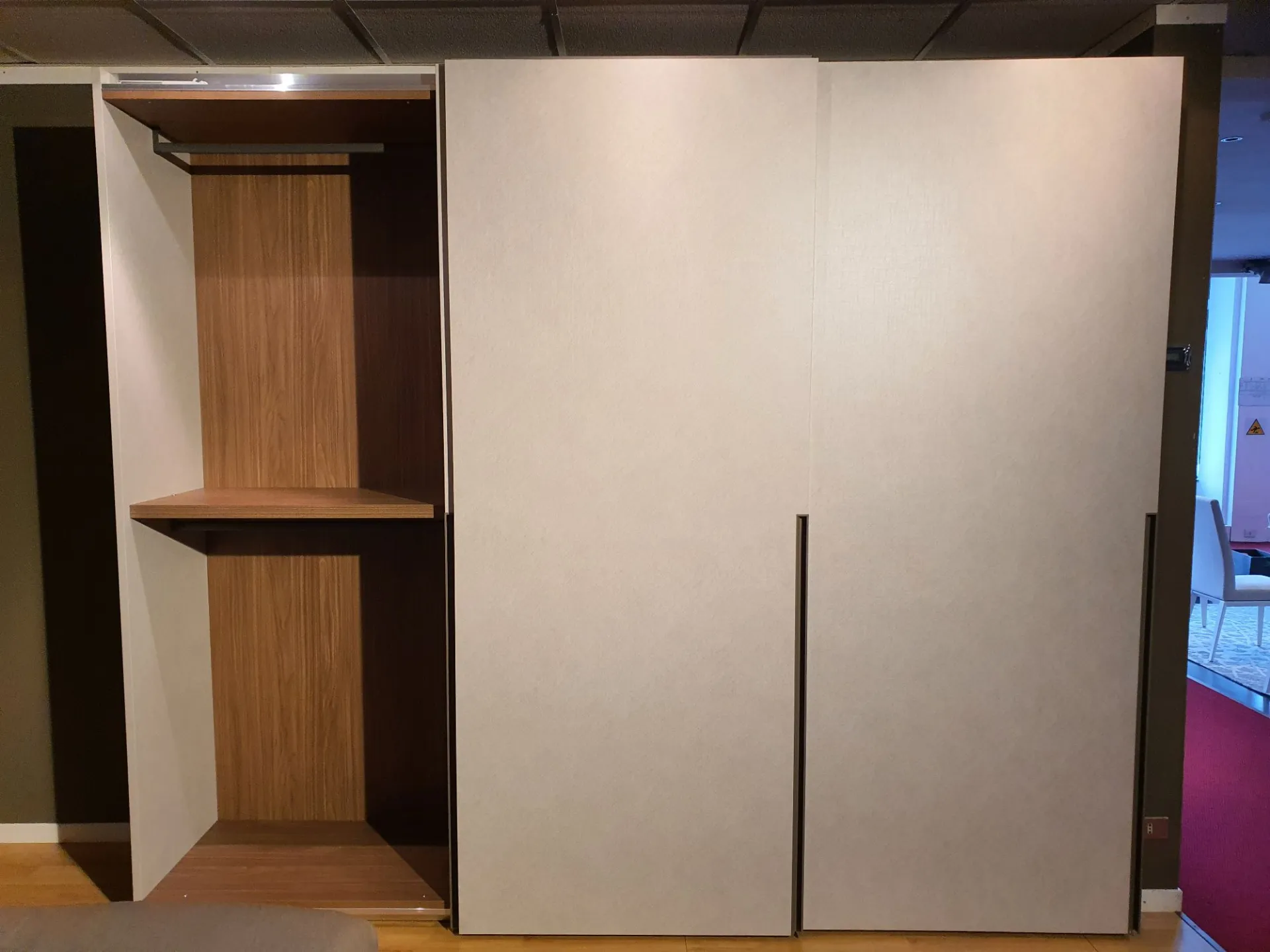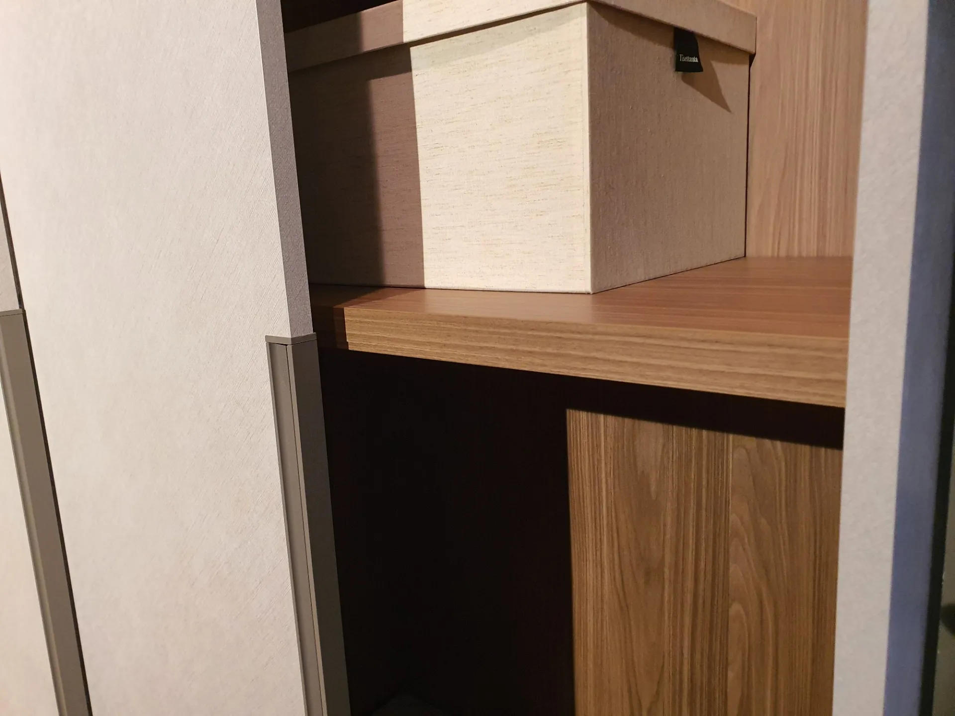 Sliding wardrobe with three doors DORIS. Thanks to the metal handle integrated into the door that divides the height of the wardrobe in two, it will be convenient to open and close the doors. A decorative feature, but also a very practical detail that facilitates the grip and sliding of the door. Internally the wardrobe is equipped with: - n.3 central internal shelves - internal drawer unit with two drawers + a basket, clothes hanging rods The internal equipment can be integrated with additional components upon request. The finish of the wardrobe is in CANVAS material with a lacquered metal handle in GRAY PIACENZA color. The interior is in WALNUT material. The overall dimensions are cm L.304xP.65xH.255. CONTACT US FOR MORE INFORMATION!