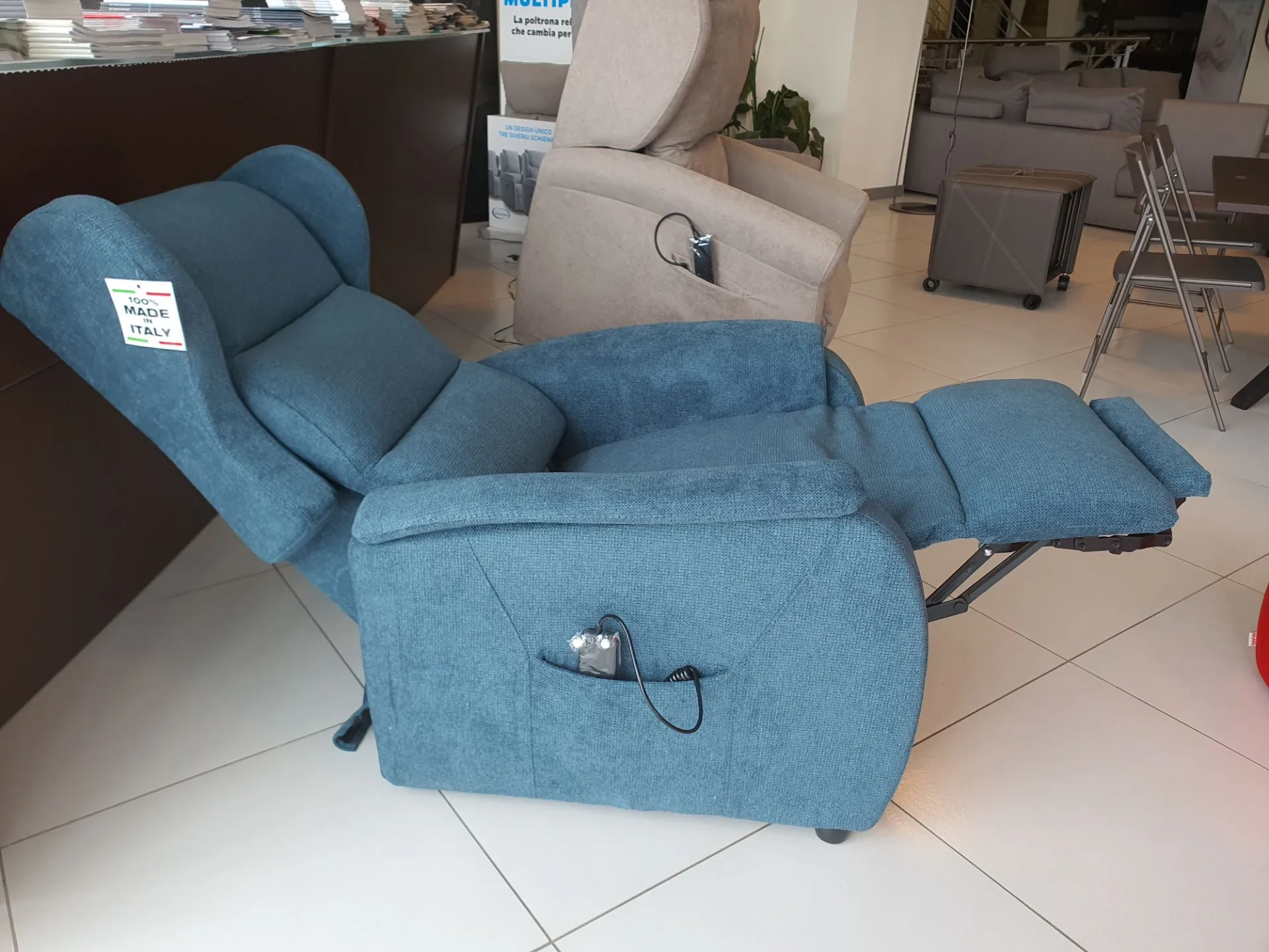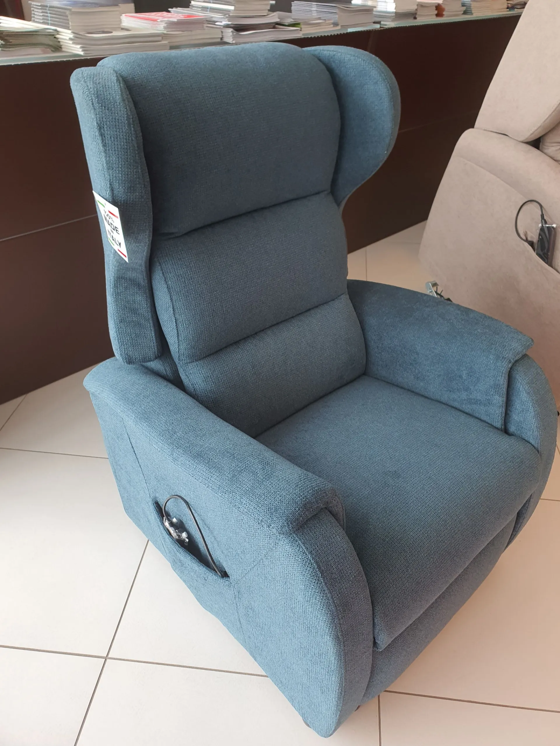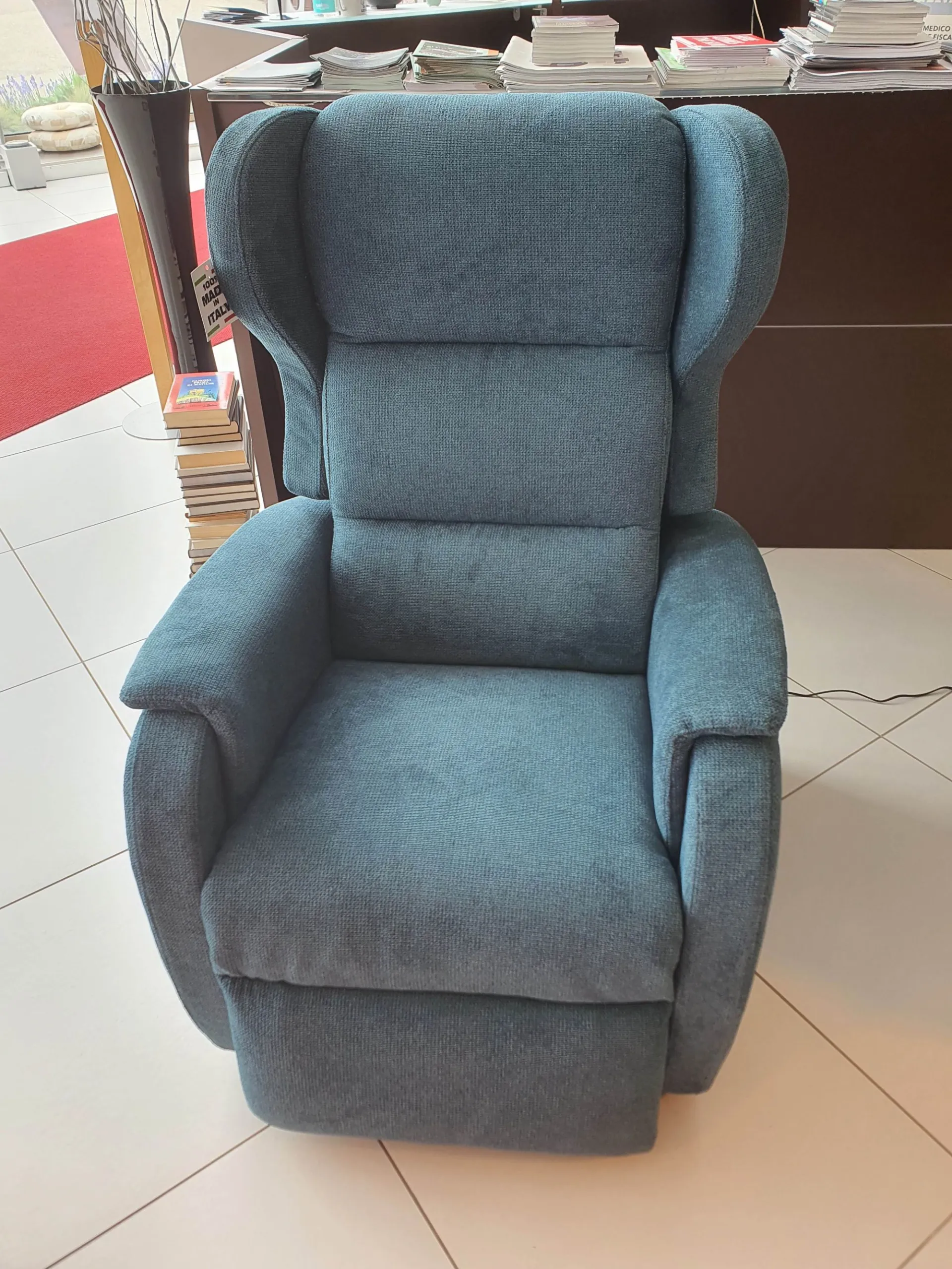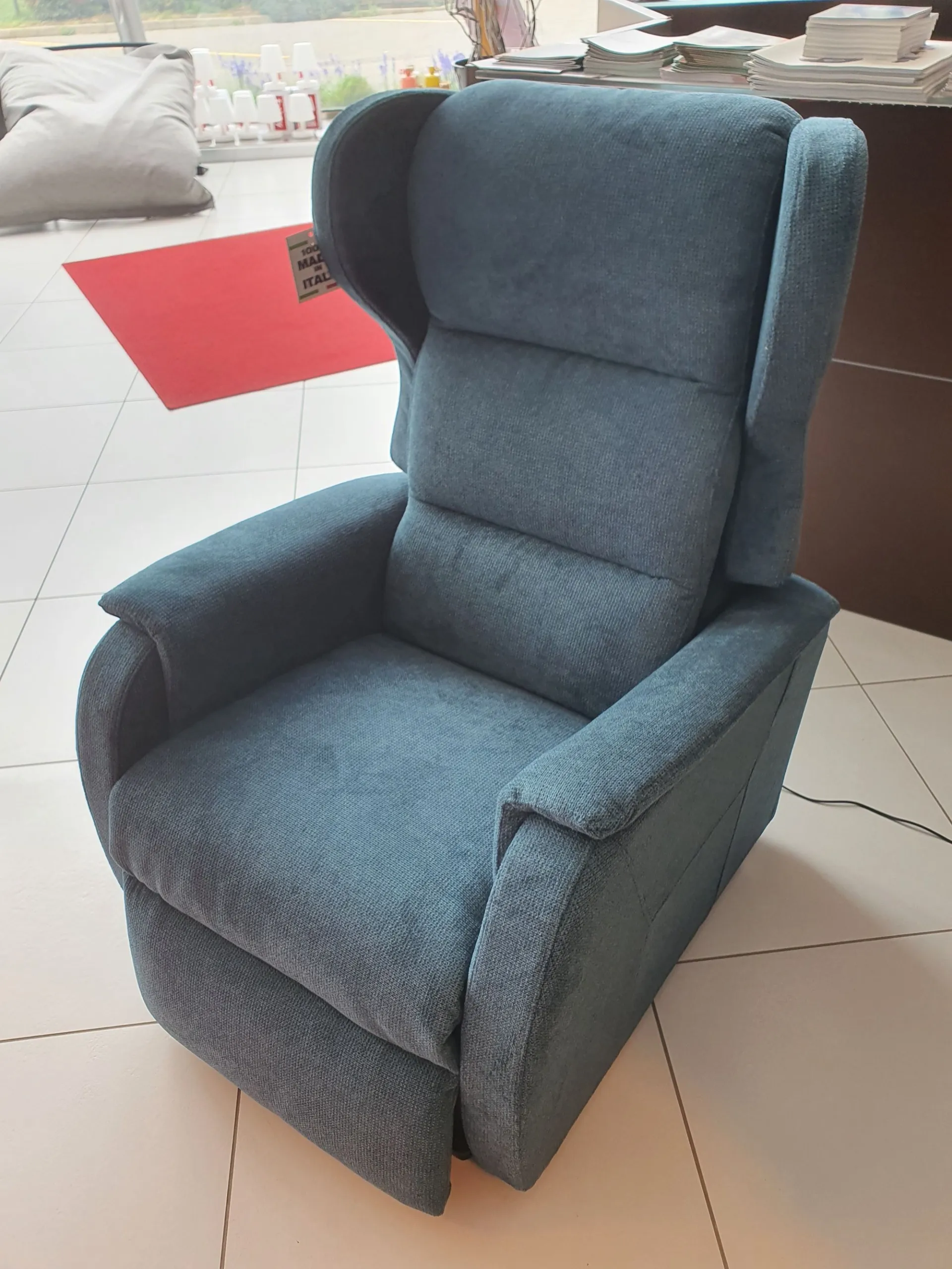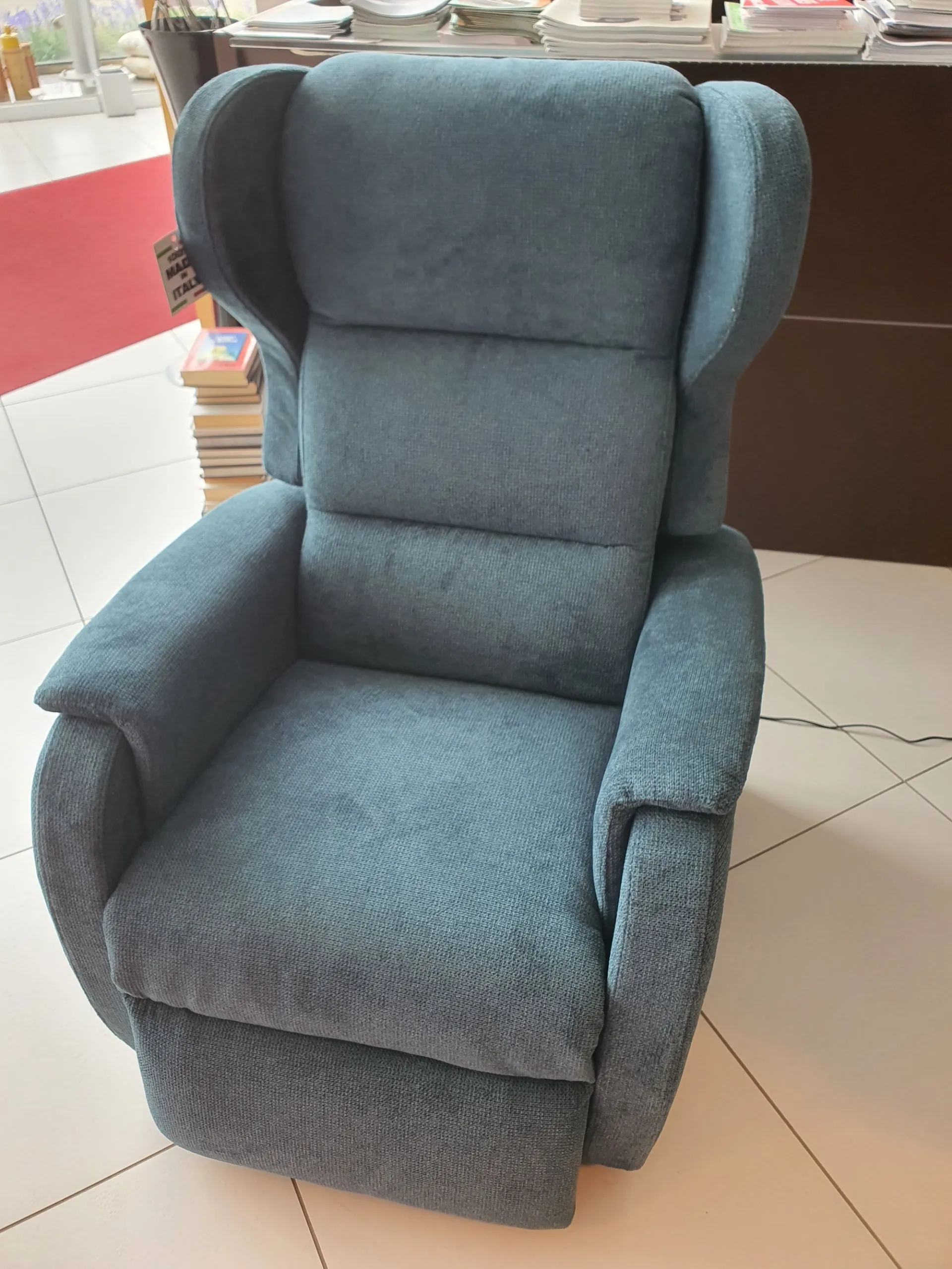 DUCALE Relax ARMCHAIR with LIFT 2 motors and convenient roller kit. Double armrest and fabric covering in petrol color. The armchair measures cm L.79xP.90xH.111
