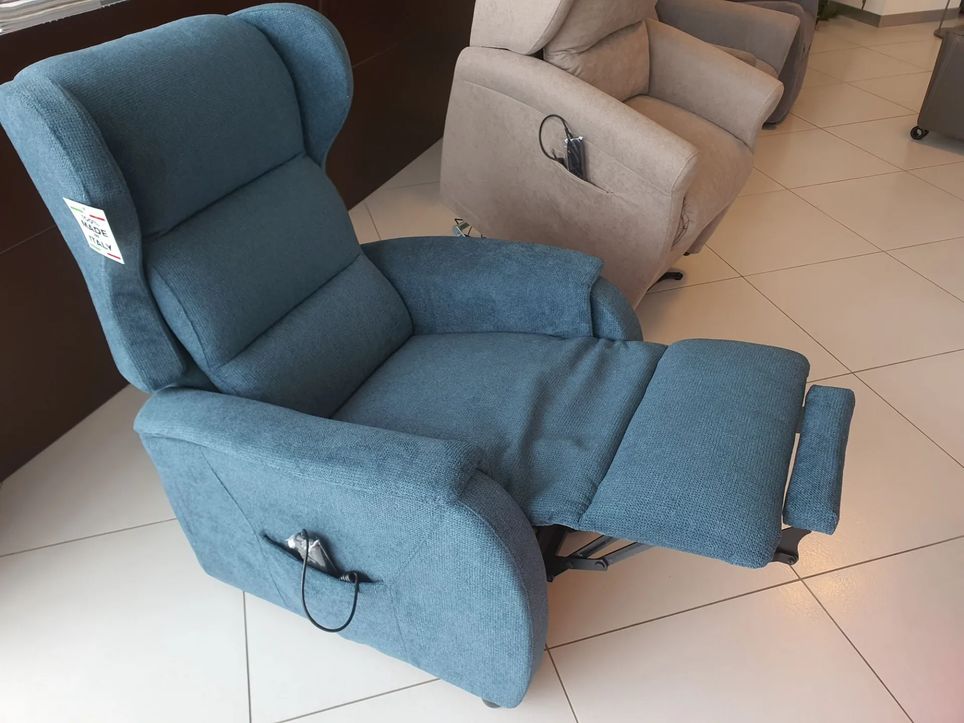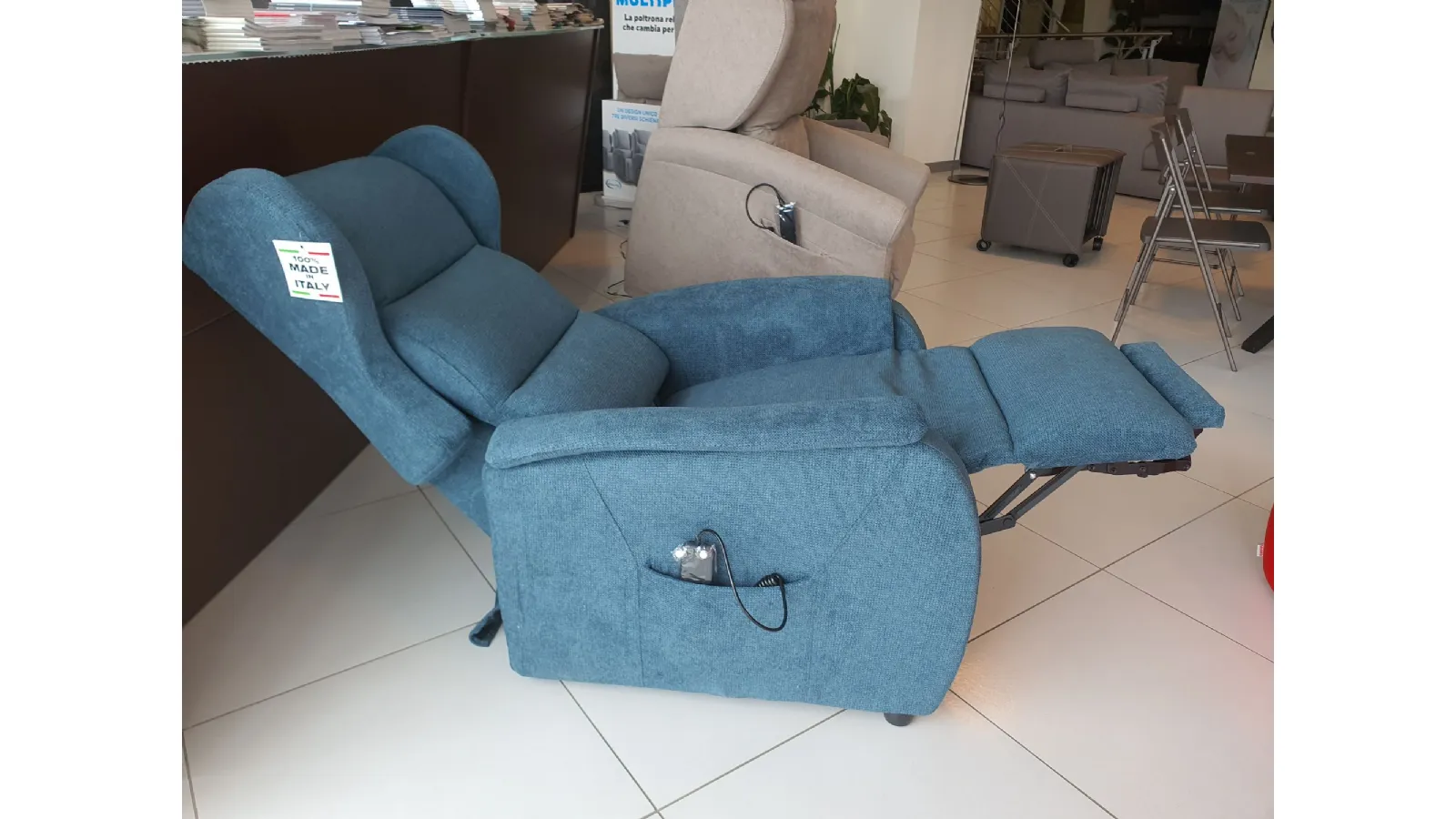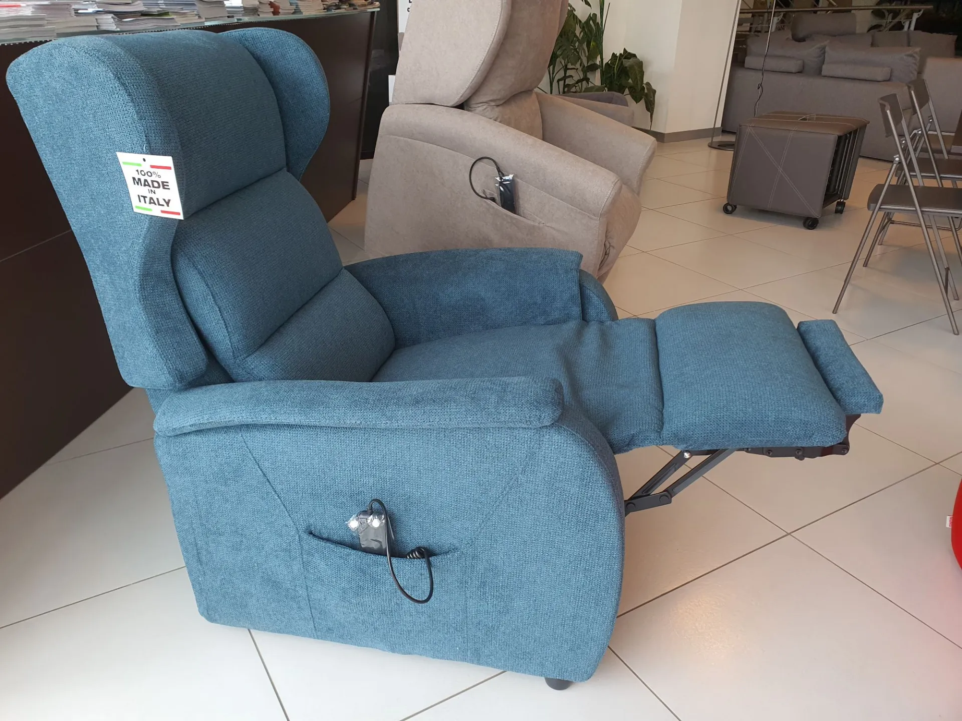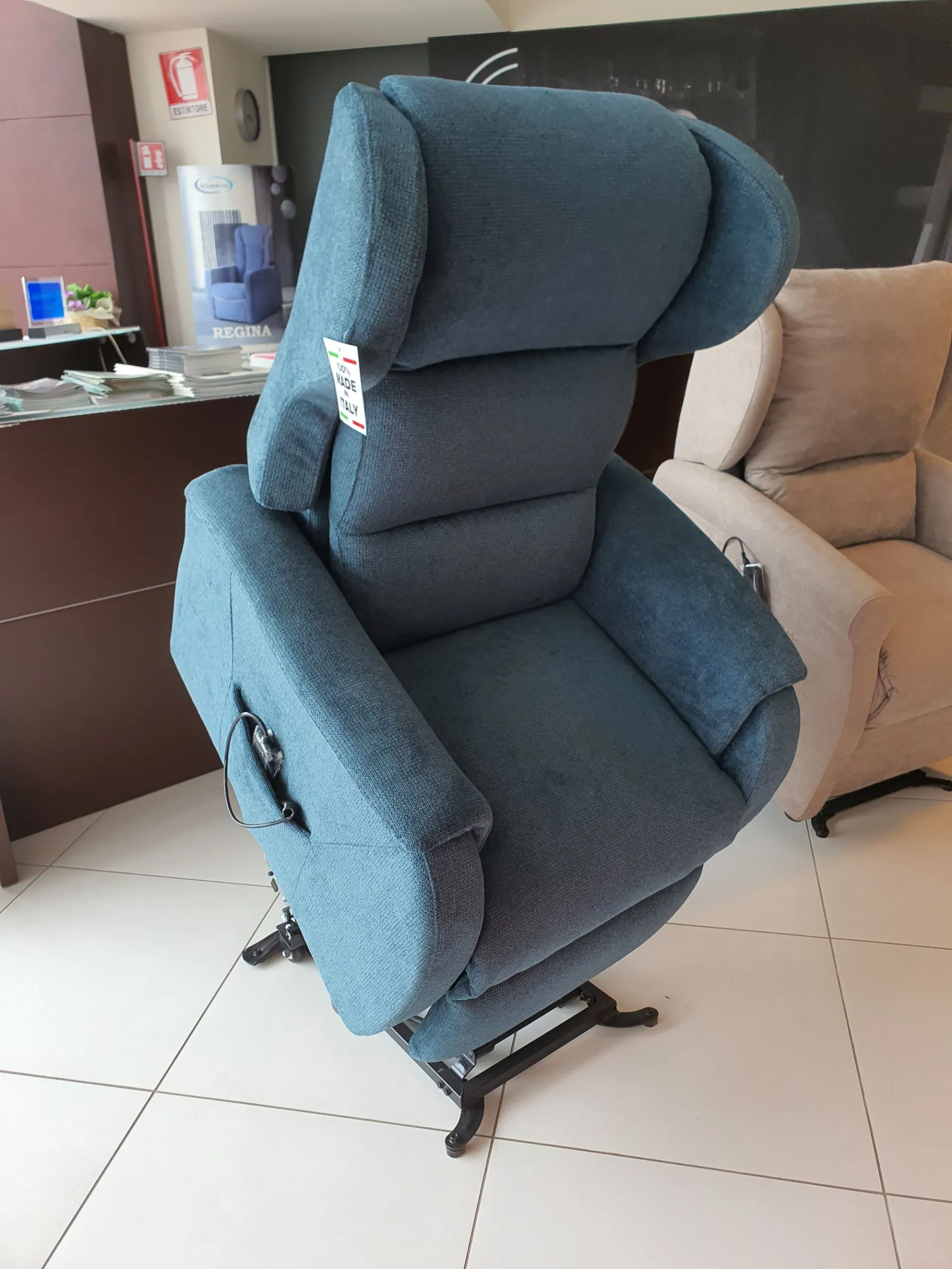 DUCALE Relax ARMCHAIR with LIFT 2 motors and convenient roller kit. Double armrest and fabric covering in petrol color. The armchair measures cm L.79xP.90xH.111