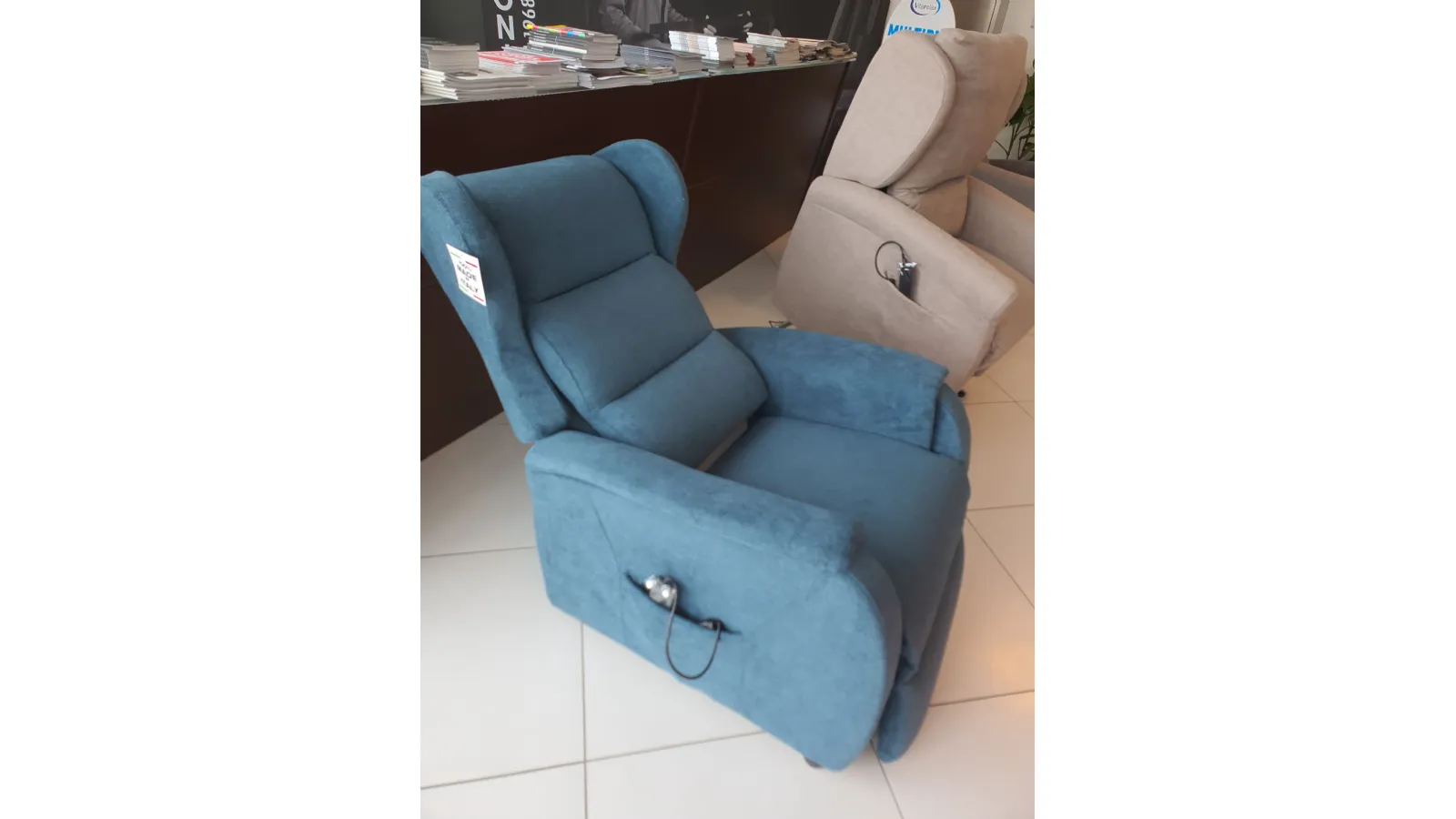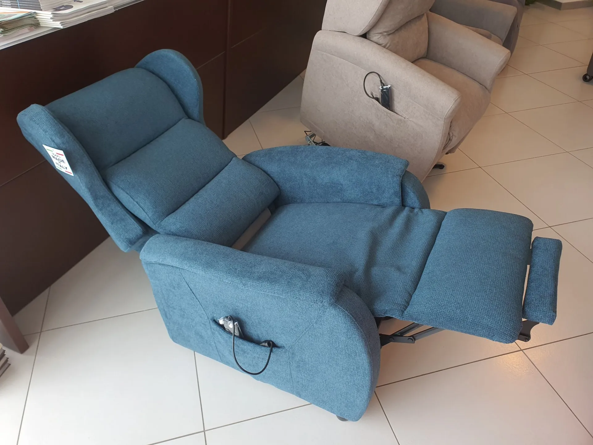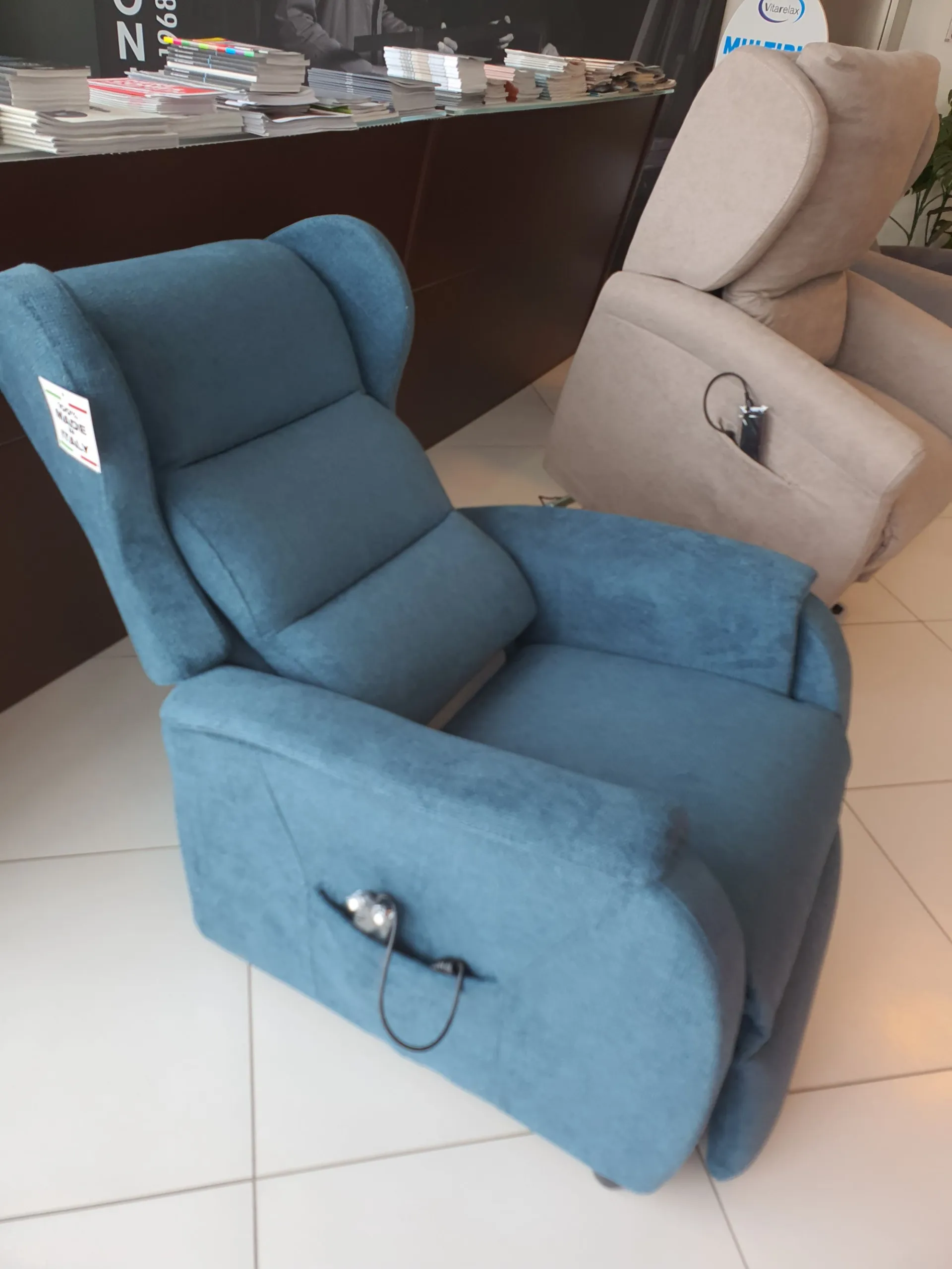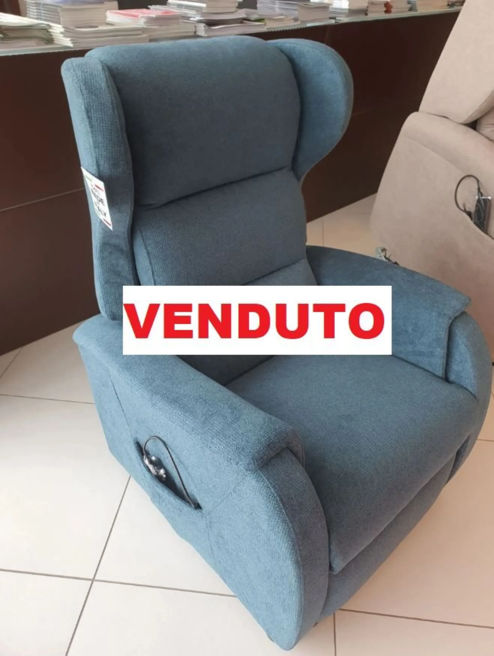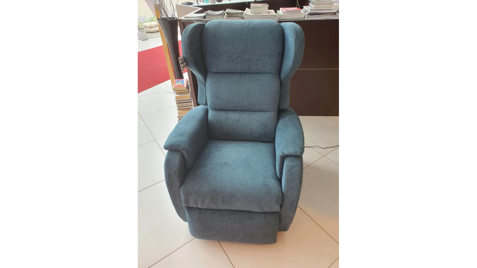 DUCALE Relax ARMCHAIR with LIFT 2 motors and convenient roller kit. Double armrest and fabric covering in petrol color. The armchair measures cm L.79xP.90xH.111