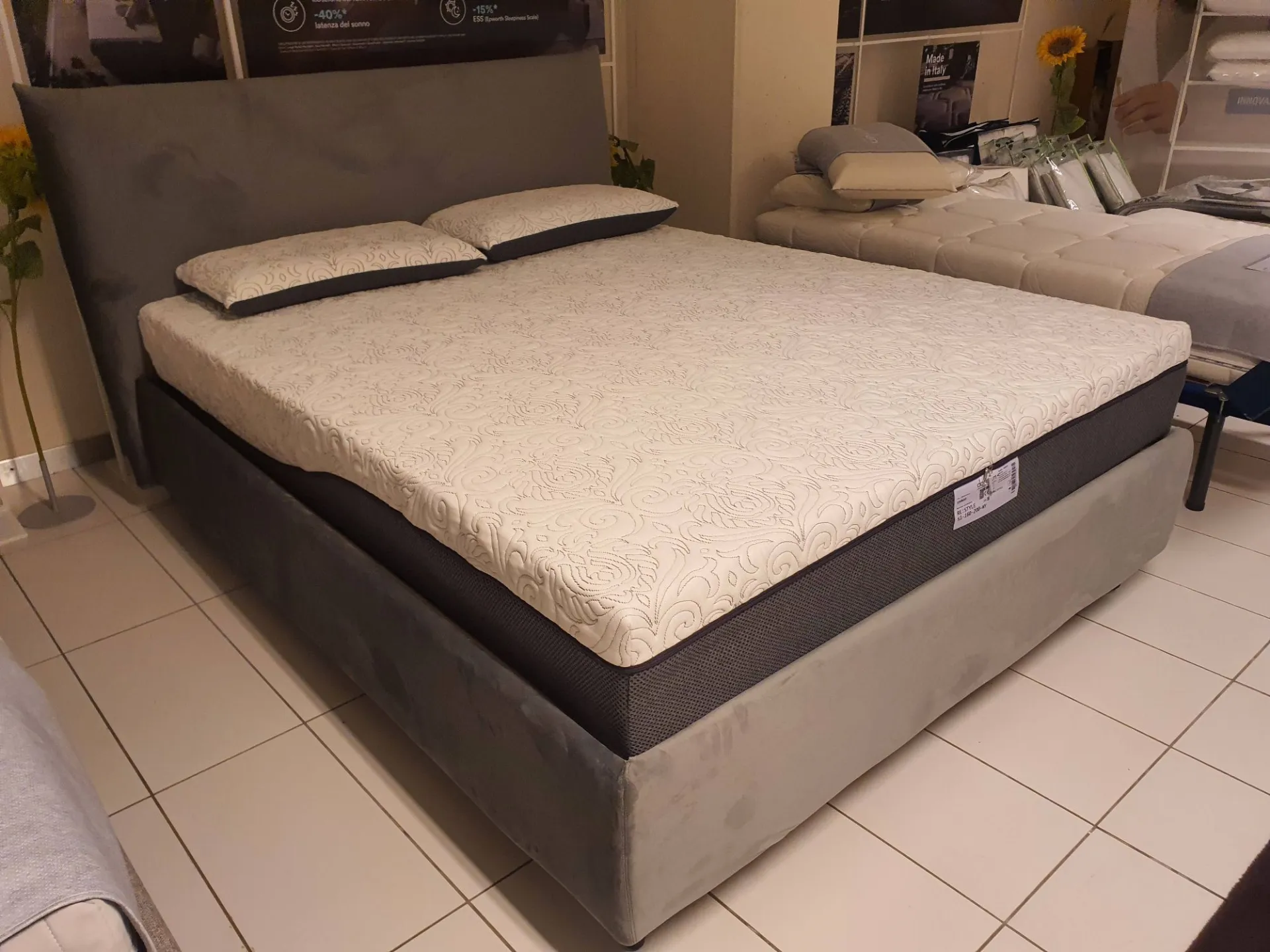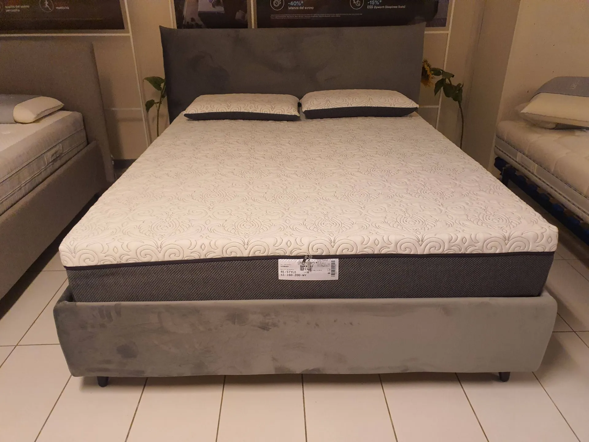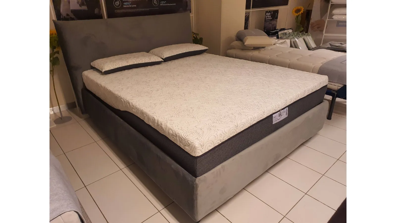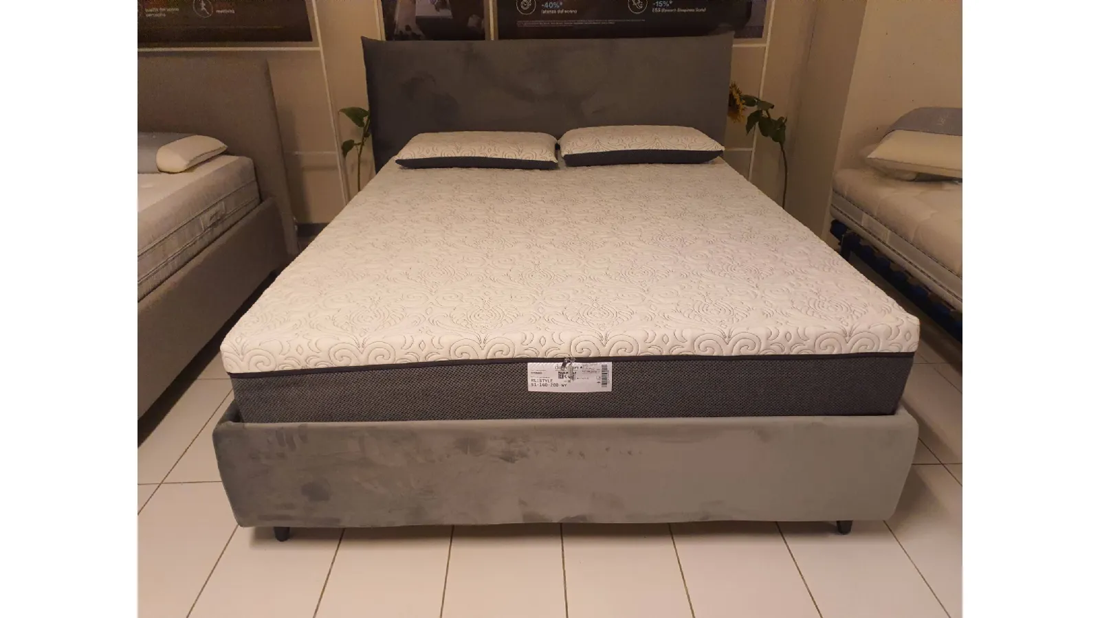 Double bed EGON by Dorelan with completely removable fabric upholstery in grey velvet Container with completely wooden slats (Case Wood) 160x200 cm and grey abs foot H.11cm. Thanks to the presence of wooden slats, the bed is a MEDICAL DEVICE and therefore deductible at 19% The overall dimensions of the bed are cm L.178xP.220xH.121