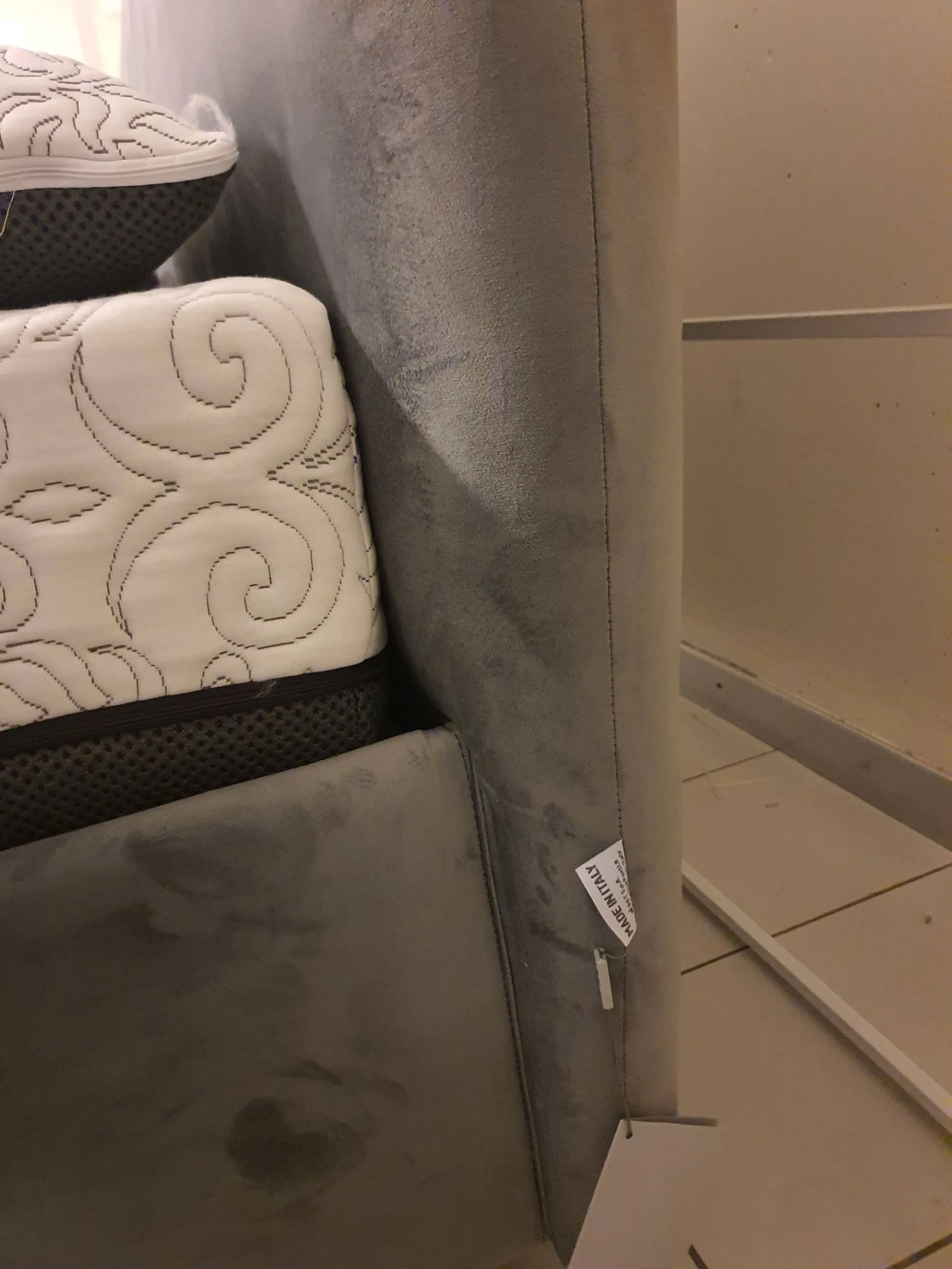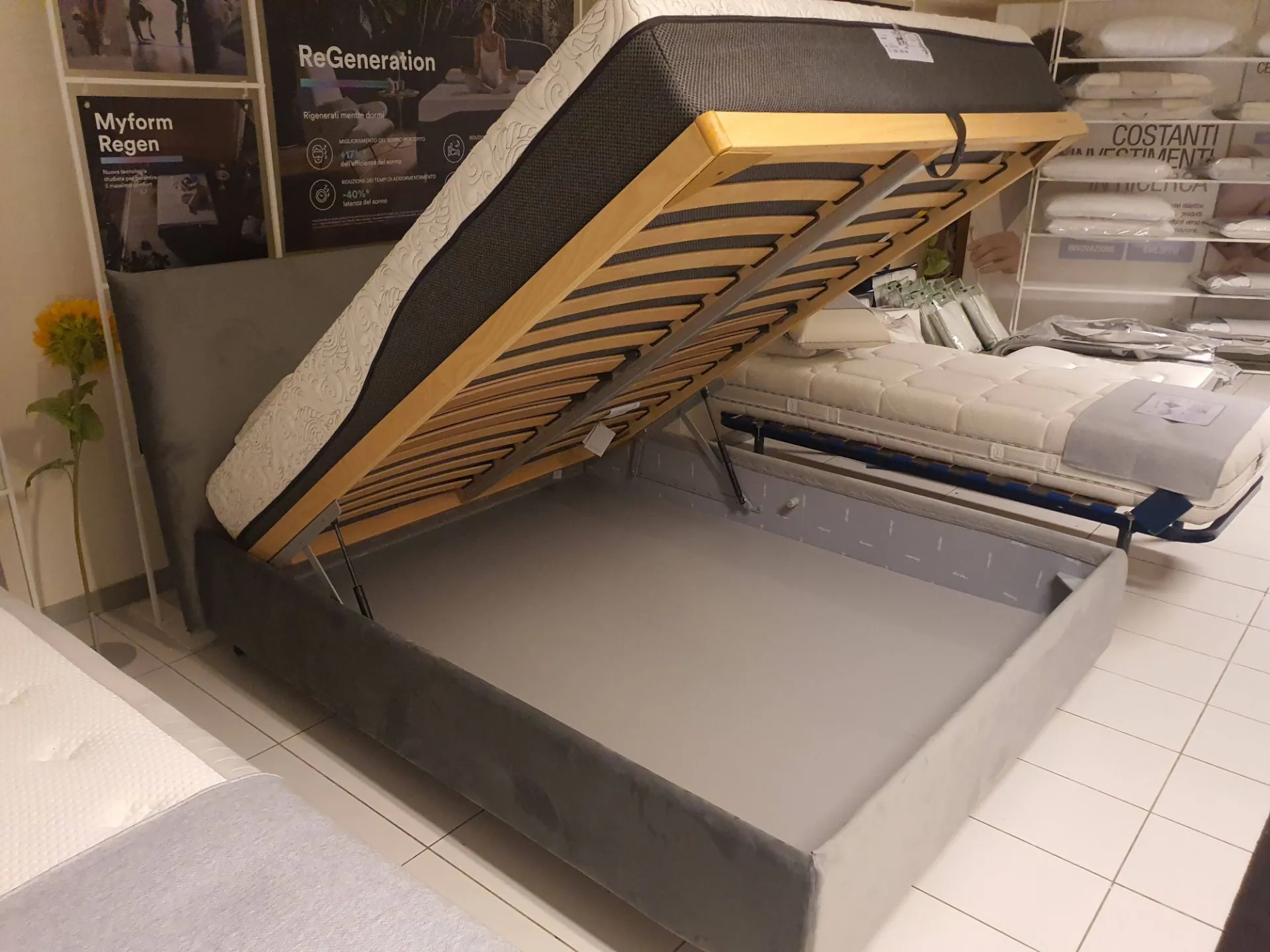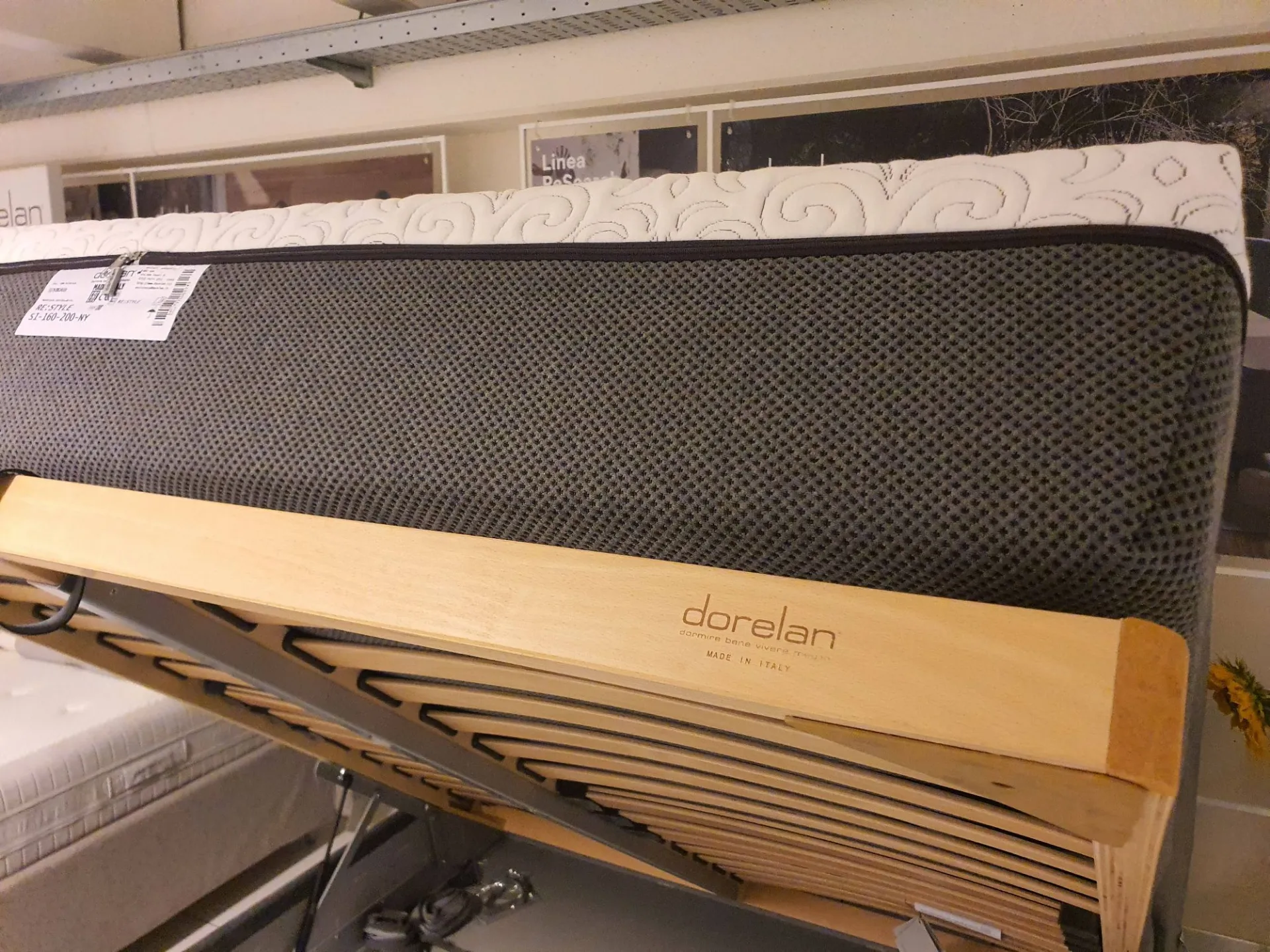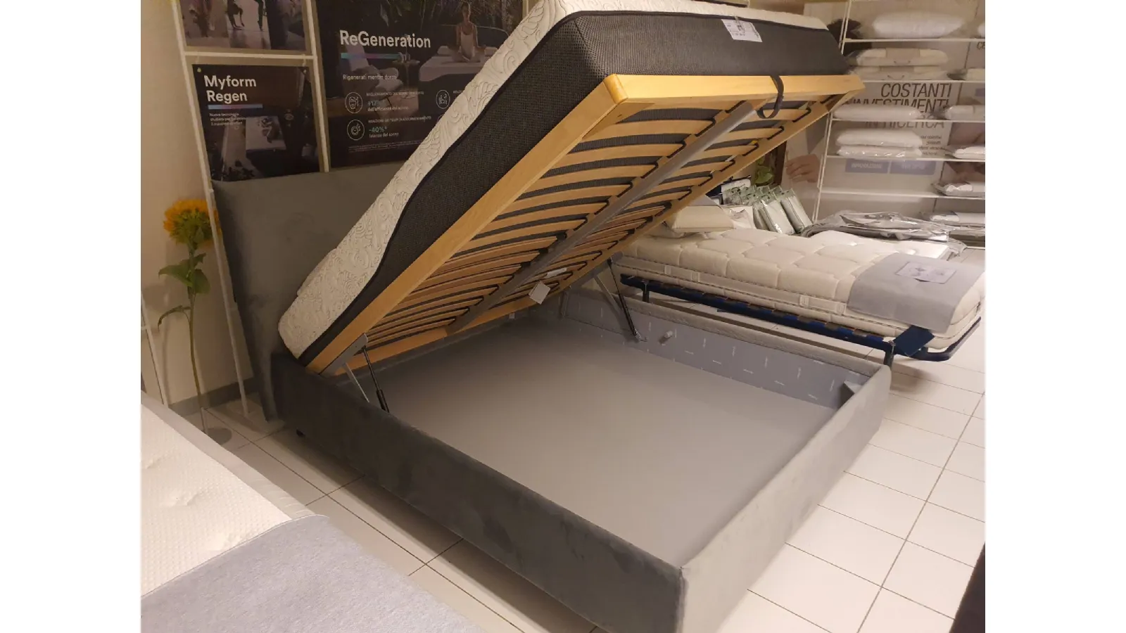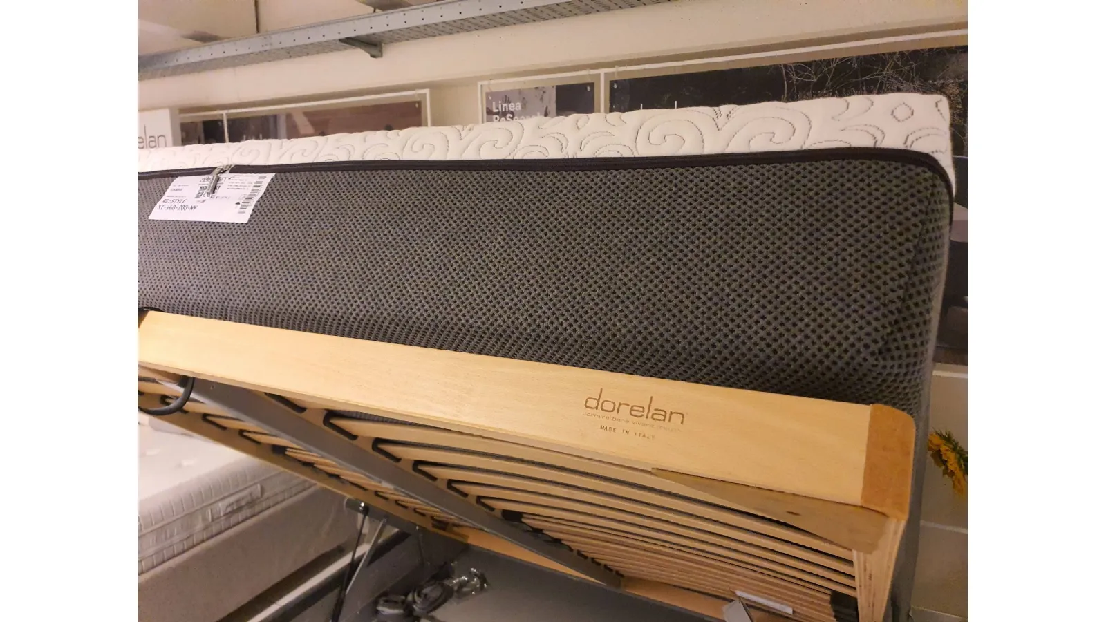 Double bed EGON by Dorelan with completely removable fabric upholstery in grey velvet Container with completely wooden slats (Case Wood) 160x200 cm and grey abs foot H.11cm. Thanks to the presence of wooden slats, the bed is a MEDICAL DEVICE and therefore deductible at 19% The overall dimensions of the bed are cm L.178xP.220xH.121