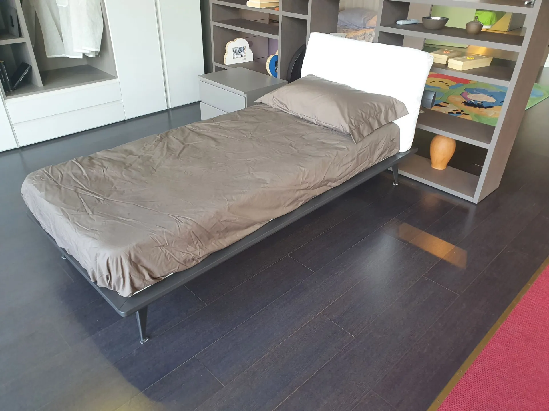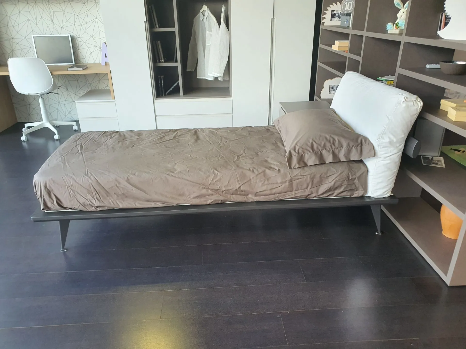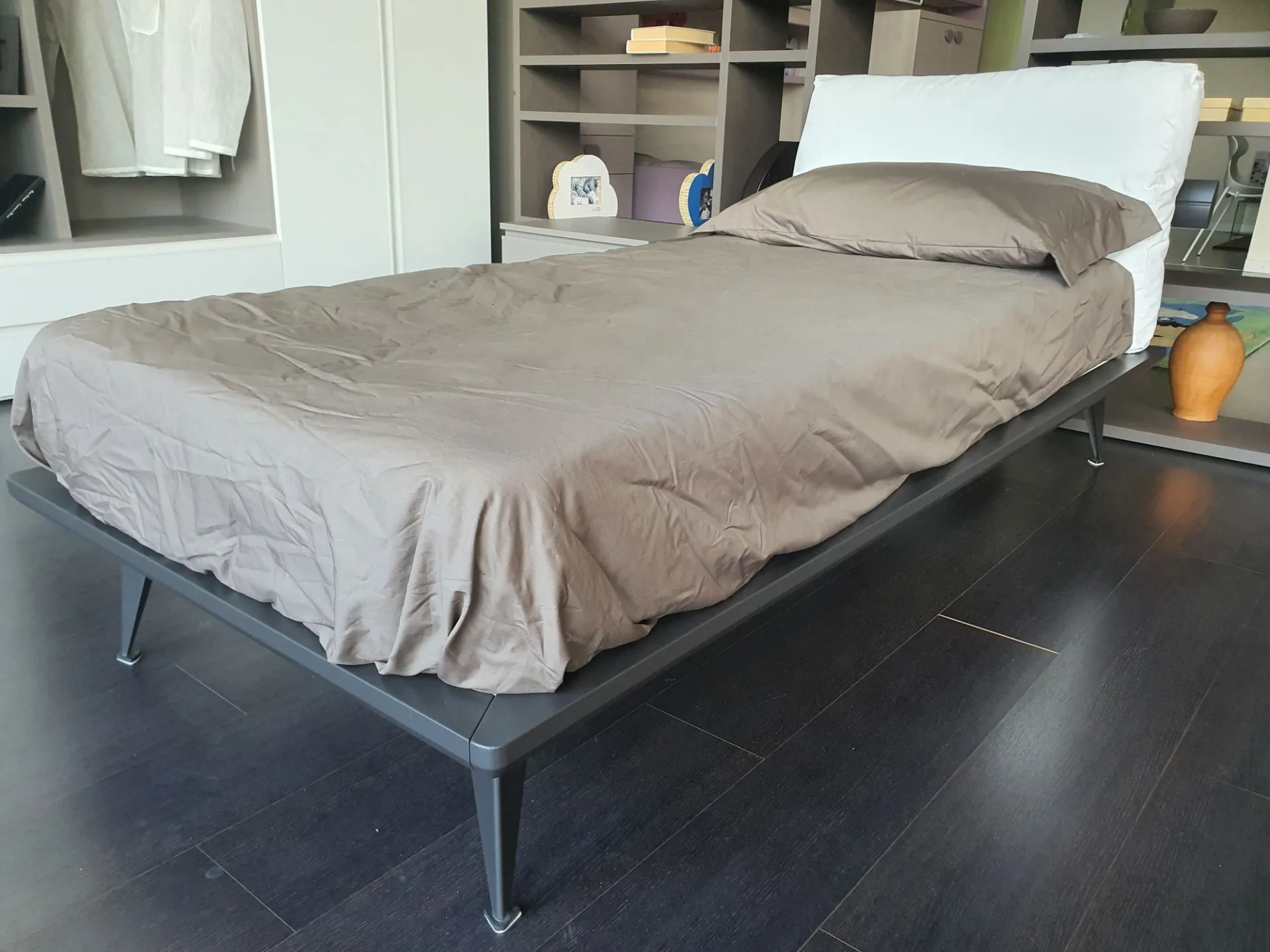 Single bed mod. Piuma with anthracite lacquered matte finish bed frame and upholstered headboard. Headboard covered in white fabric.