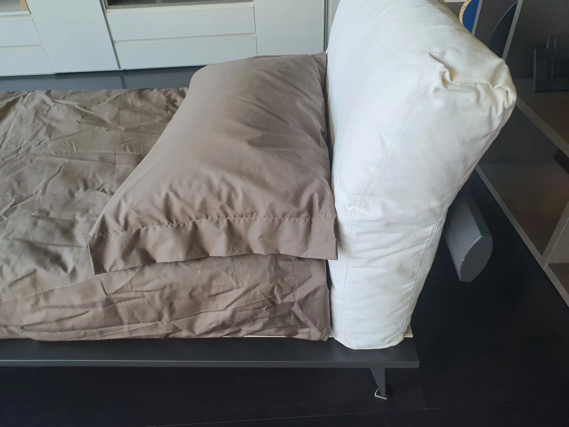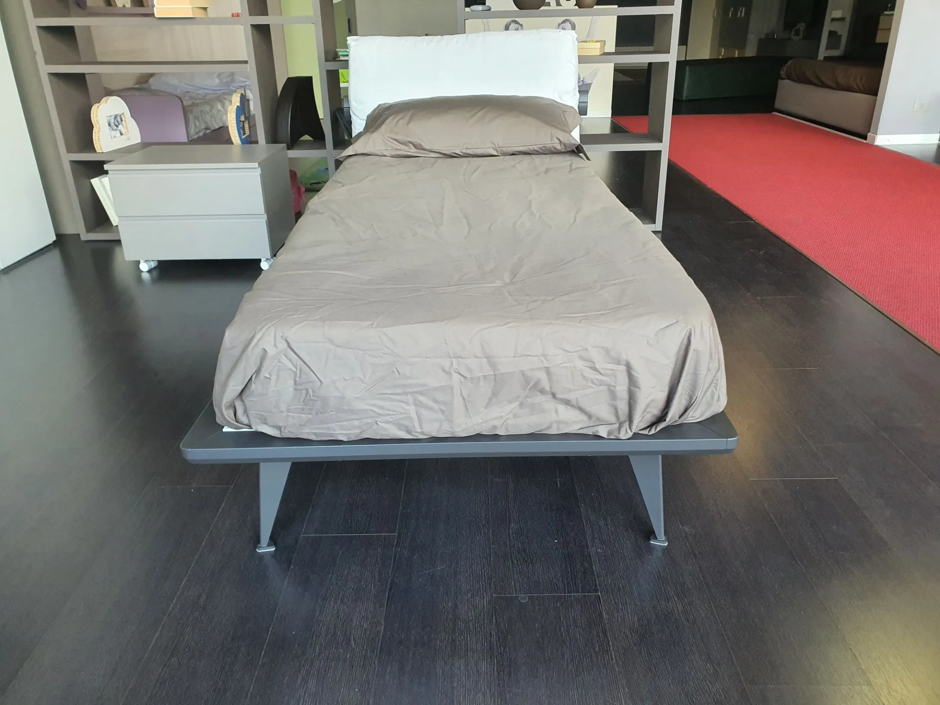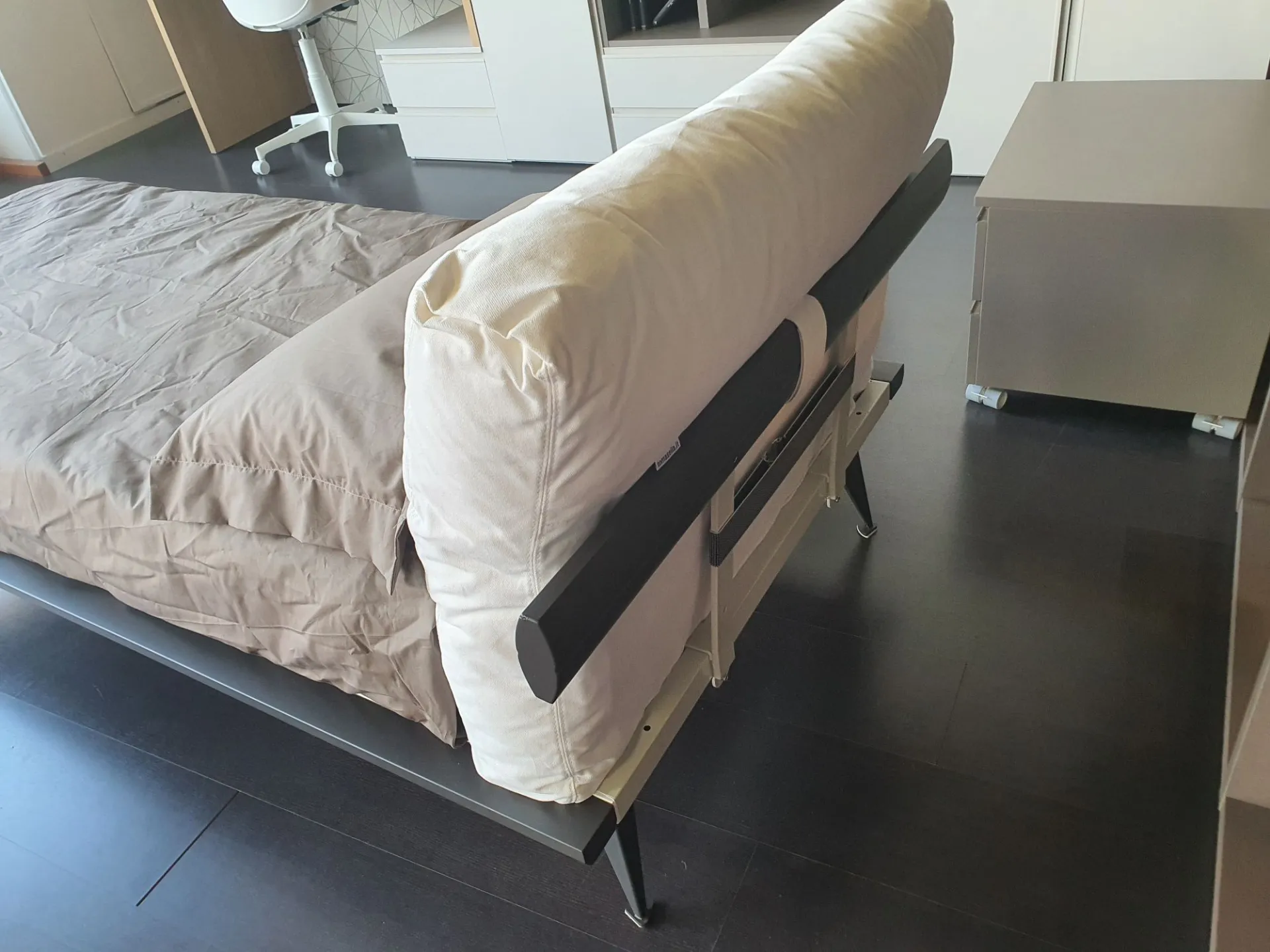Single bed mod. Piuma with anthracite lacquered matte finish bed frame and upholstered headboard. Headboard covered in white fabric.