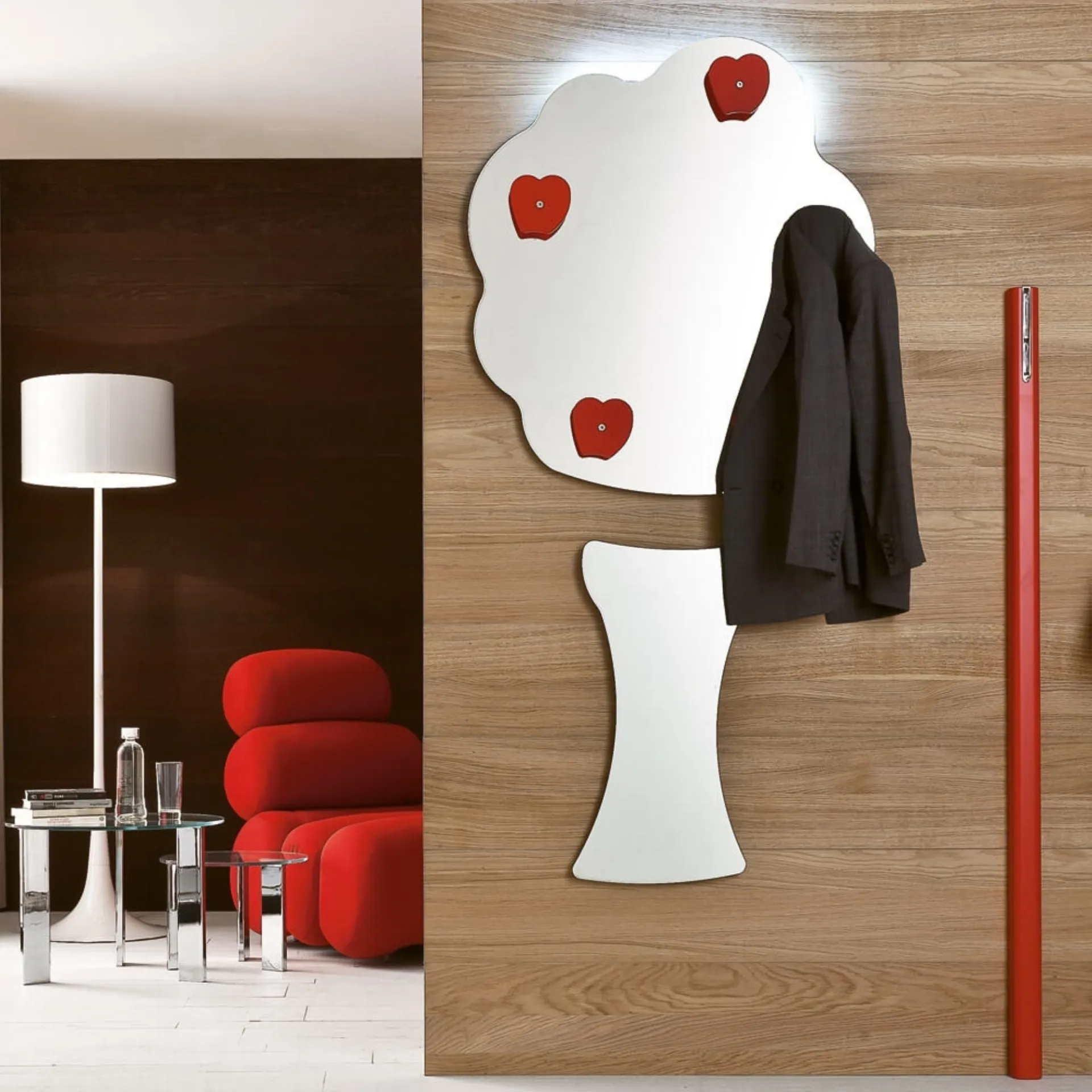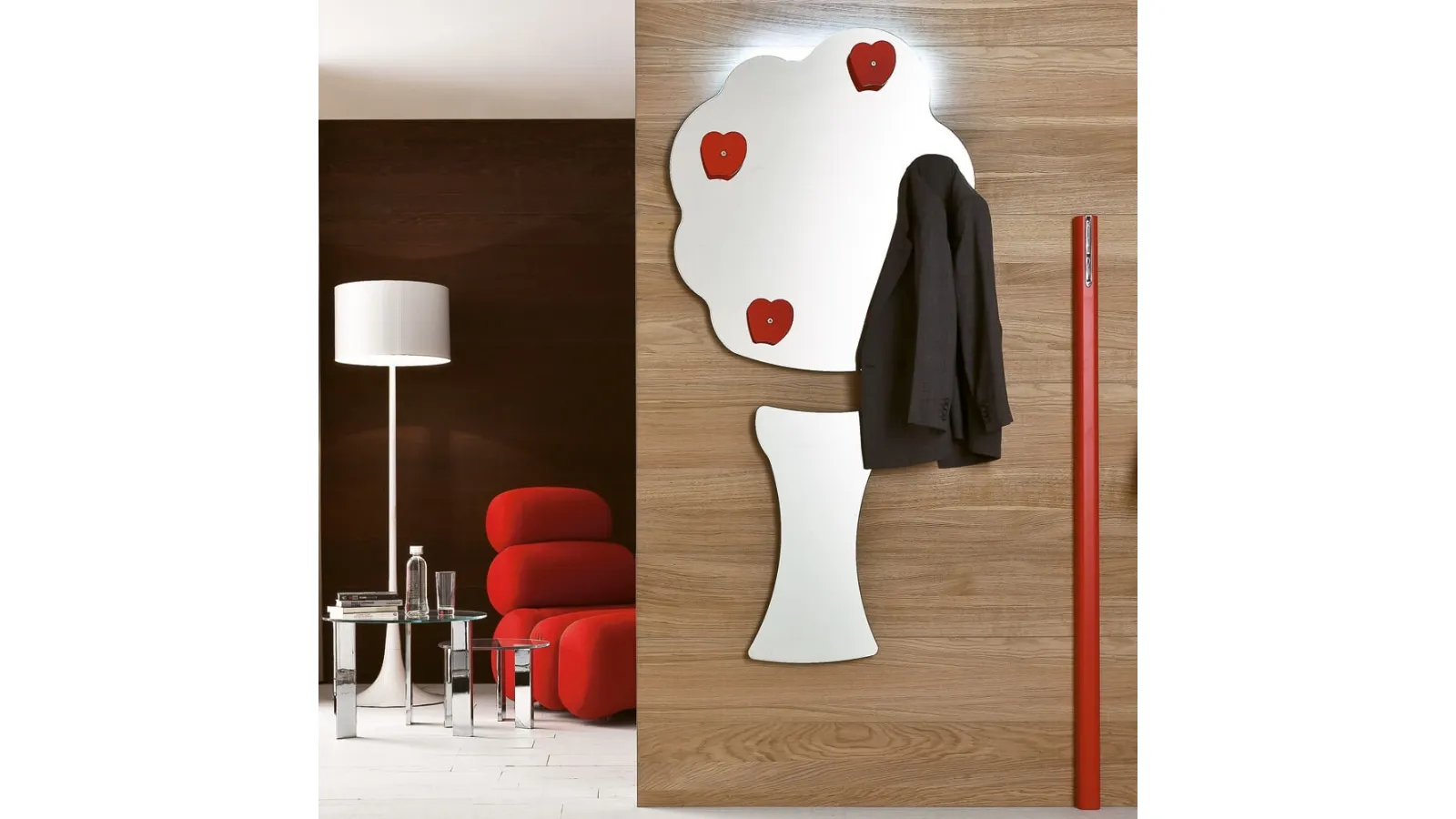 Questo specchio sagomato naturale, un pezzo di design raffinato, è disponibile per essere ammirato nel nostro showroom Rusconi Arredamenti s.r.l. a Cirimido. Realizzato con appendiabiti in plexiglass colorato nelle vivaci tonalità di rosso, viola e bianco, si integra perfettamente in ogni ambiente moderno. Lo schienale in melaminico, dotato di staffe regolabili, assicura un fissaggio a parete stabile e sicuro. Per un tocco di luce in più, è disponibile anche con illuminazione a LED opzionale. È la soluzione ideale per chi cerca un elemento d'arredo che unisca estetica e funzionalità, perfetto per gli spazi moderni della nostra area servita.