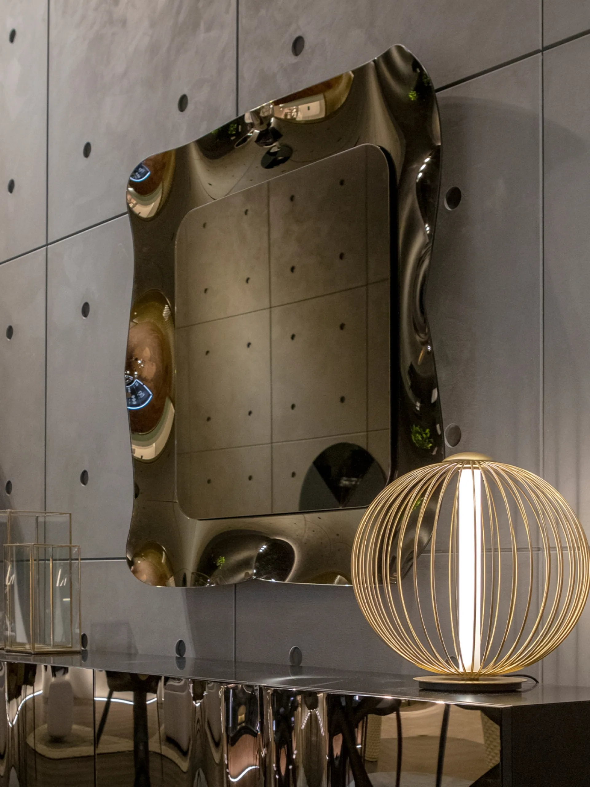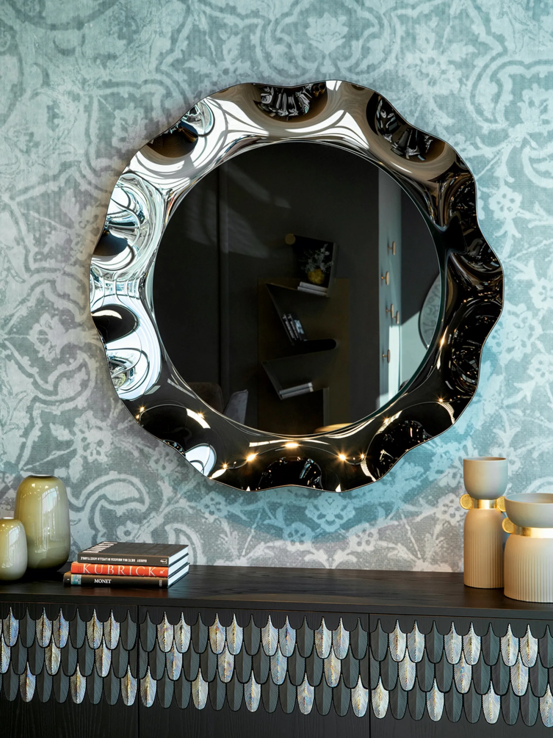 Lo specchio Dorian di Tonin Casa si distingue per la sua ingegnerizzazione avanzata e un'estetica di alto livello. Presenta una cornice circolare con una peculiare lavorazione a corolla, realizzata in vetro curvo. Disponibile nelle finiture argentato, bronzo e fumè, questo elemento d'arredo è progettato per essere un punto focale, conferendo raffinatezza a ogni contesto. Le diverse finiture disponibili, risultato di un'accurata selezione dei materiali, garantiscono un'integrazione stilistica impeccabile e una durata prolungata nel tempo.