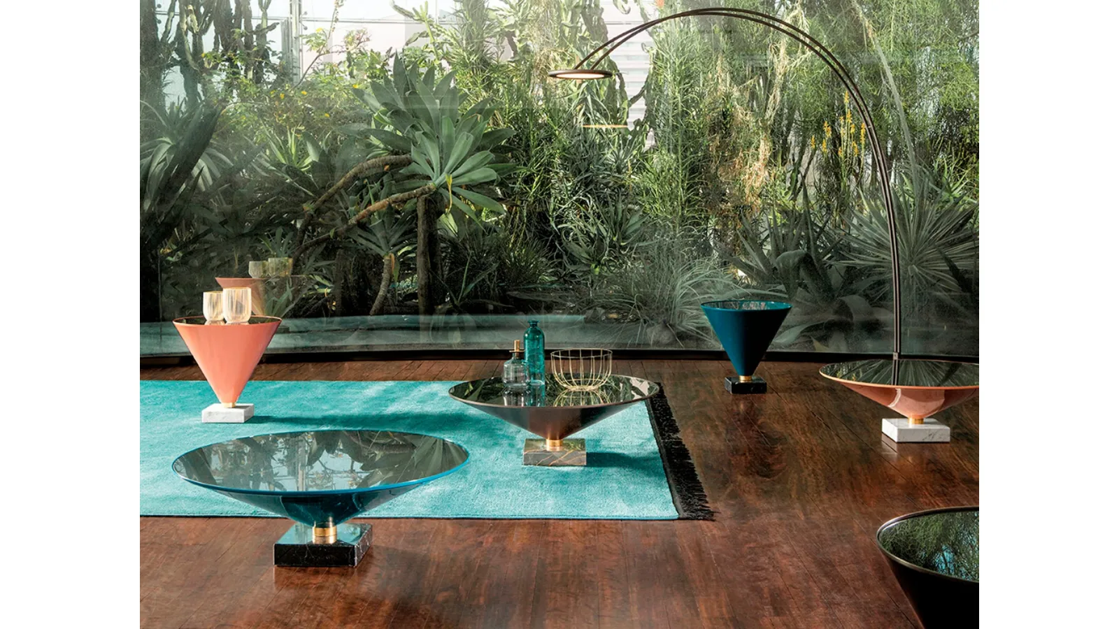 | Materiale: | Base in marmo (disponibile in Bianco Carrara, Port Saint Laurent, Nero Marquinia), Struttura in metallo, Top in vetro fumé trasparente |