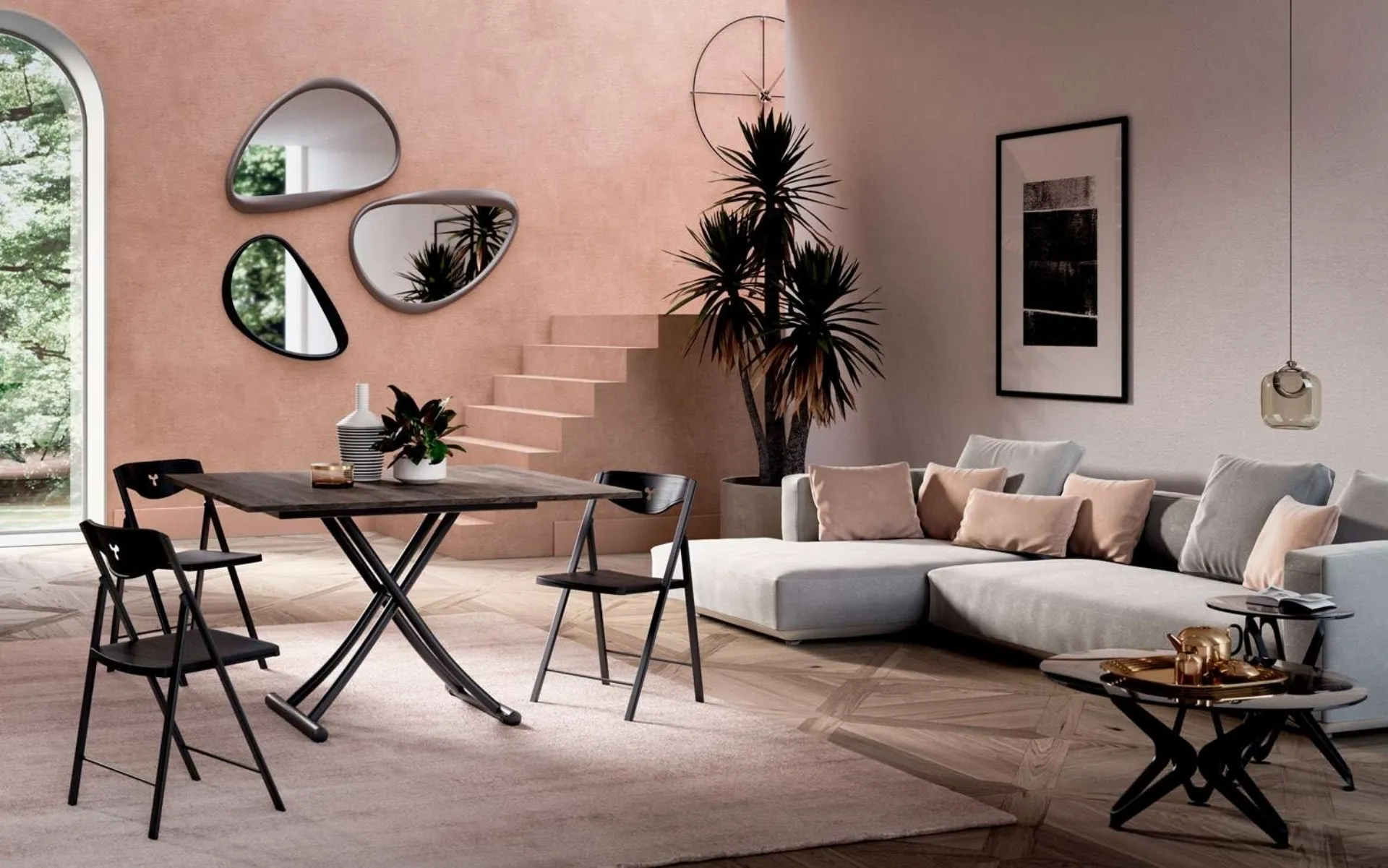 Il tavolo trasformabile Mondial, ideato da Studio Ozeta per Ozzio Italia, si configura come un elemento d'arredo altamente adattabile, capace di evolvere da tavolino a tavolo da pranzo. La sua funzionalità è garantita da un sofisticato meccanismo a pistone a gas, che permette una regolazione precisa dell'altezza, da 23 cm a 80 cm. Il piano, con la sua caratteristica apertura a libro, è disponibile in molteplici varianti materiche: vetro, vetro marmo, ecopannello, diverse essenze lignee (rovere, olmo, noce, faggio, ciliegio), ceramica e melaminico, nonchè finiture laccate, sia opache che lucide. La struttura portante in metallo, dotata di ruote a scomparsa, ne facilita la movimentazione. Mondial rappresenta una soluzione progettuale avanzata per l'ottimizzazione degli spazi in contesti abitativi contemporanei. Questo sistema modulare è concepito per offrire una soluzione definitiva in termini di stile e funzionalità, con un design che garantisce un'integrazione fluida in ogni ambiente.
