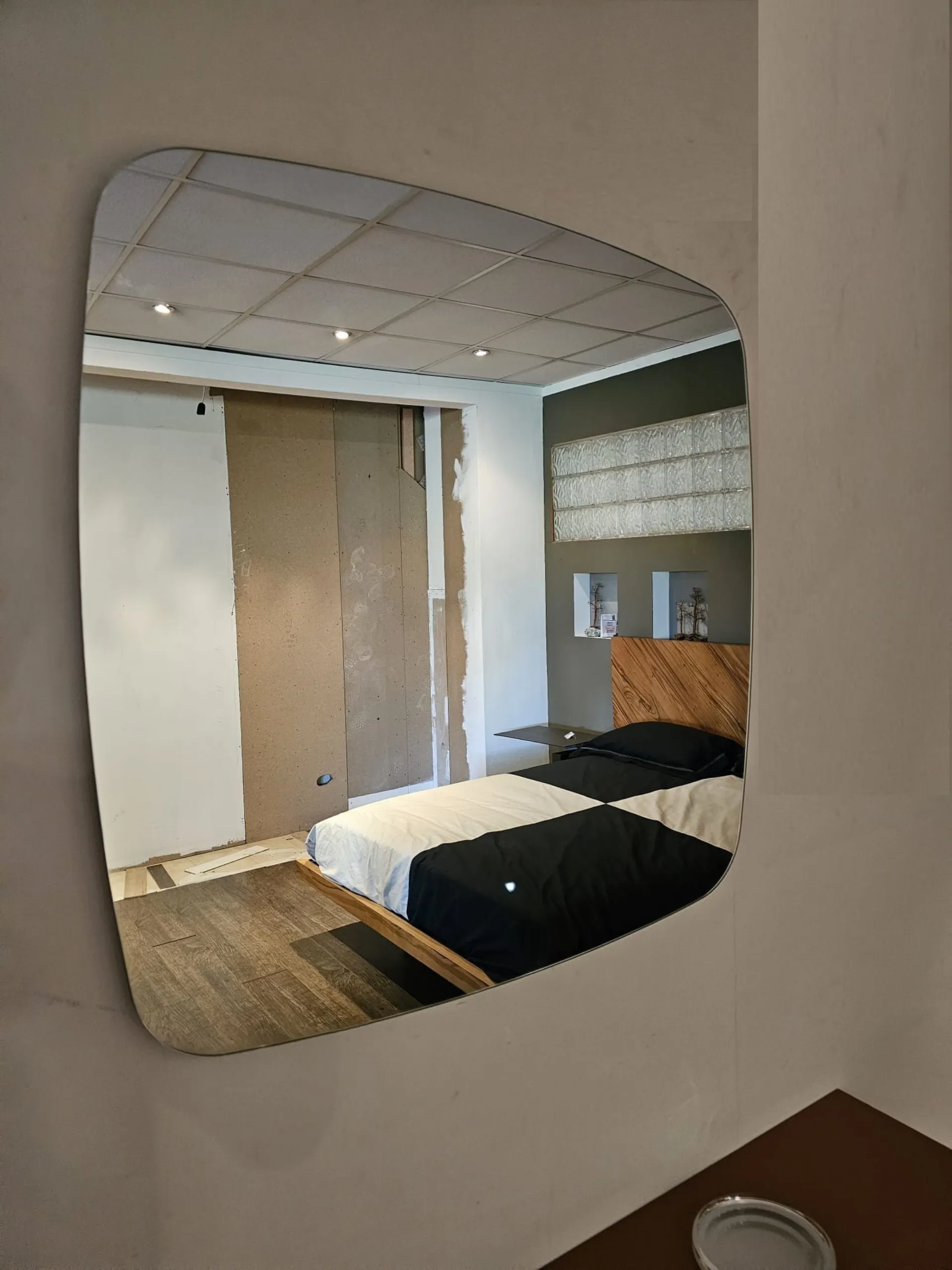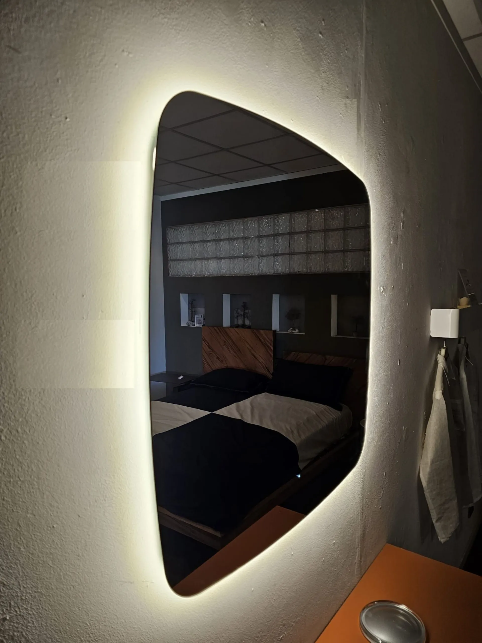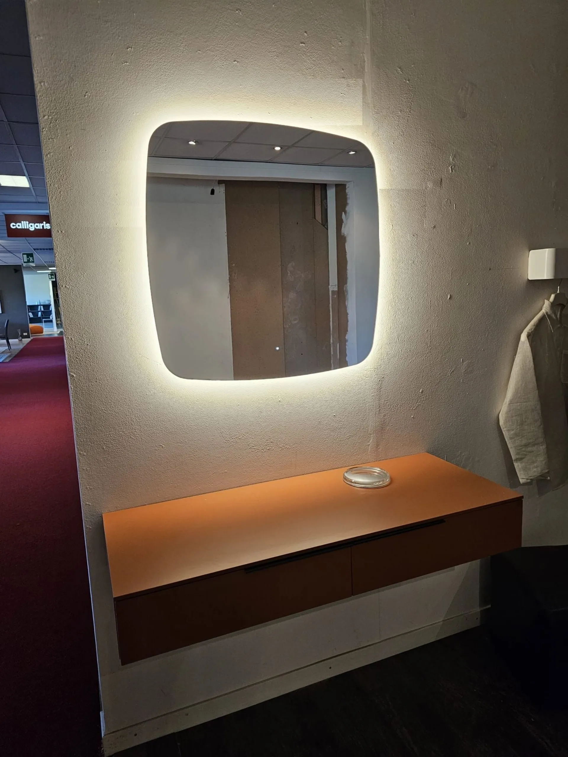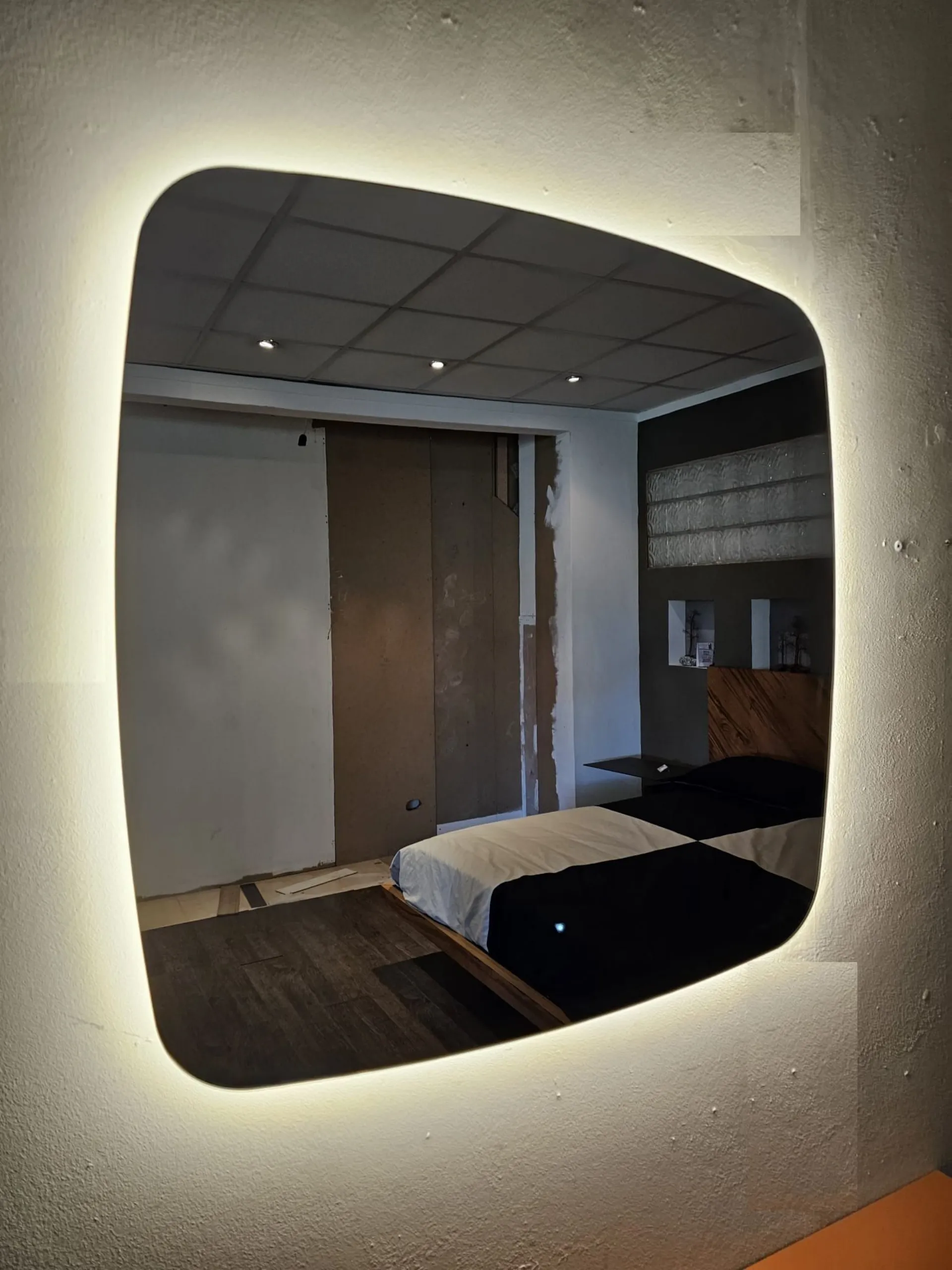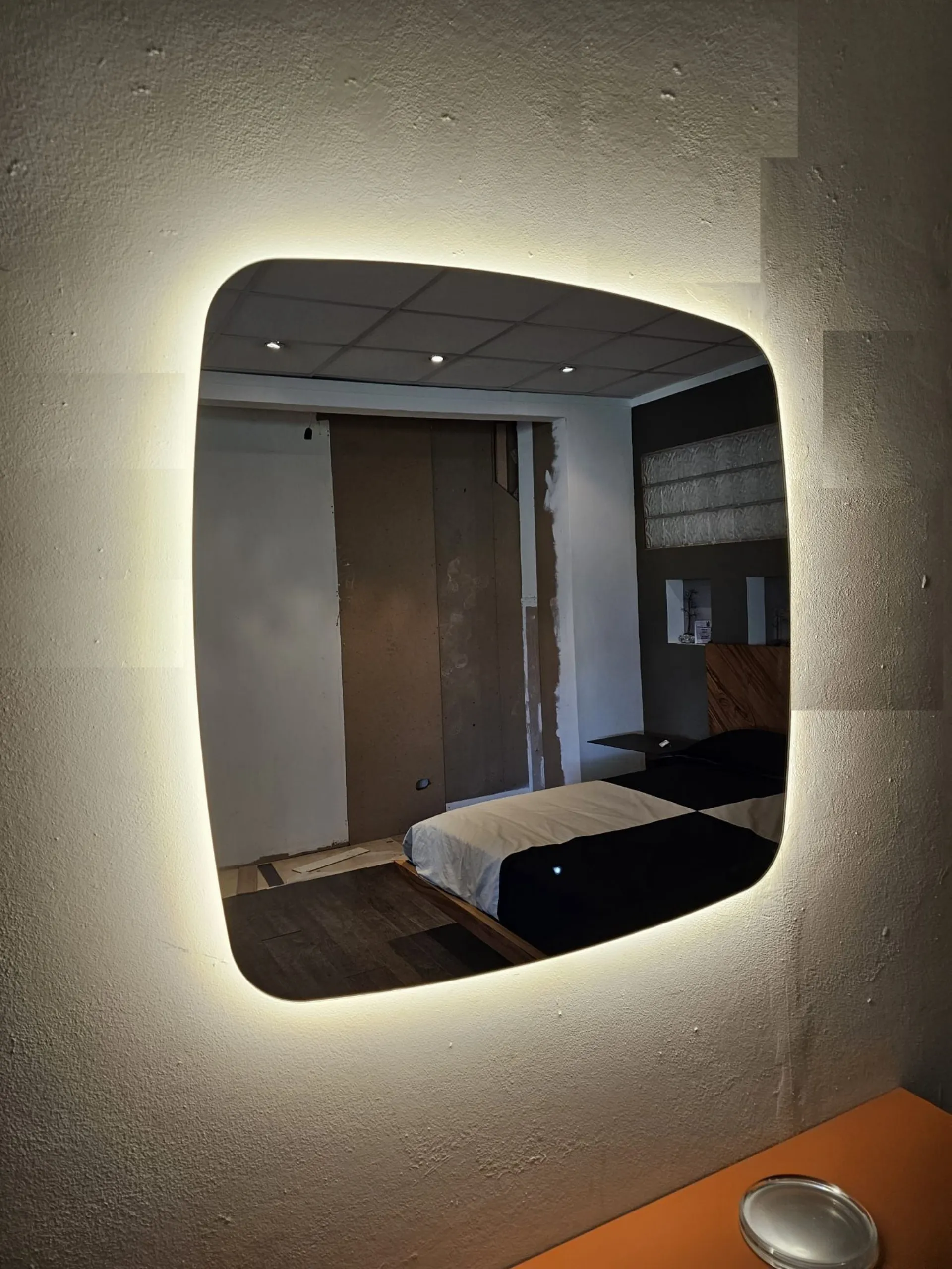 Adok model Reflect mirror, with perimeter LED light and touch control in the center. Measurements are W.80xD.80xH.4. Product is displayed and available for immediate delivery. Contact us for more information.