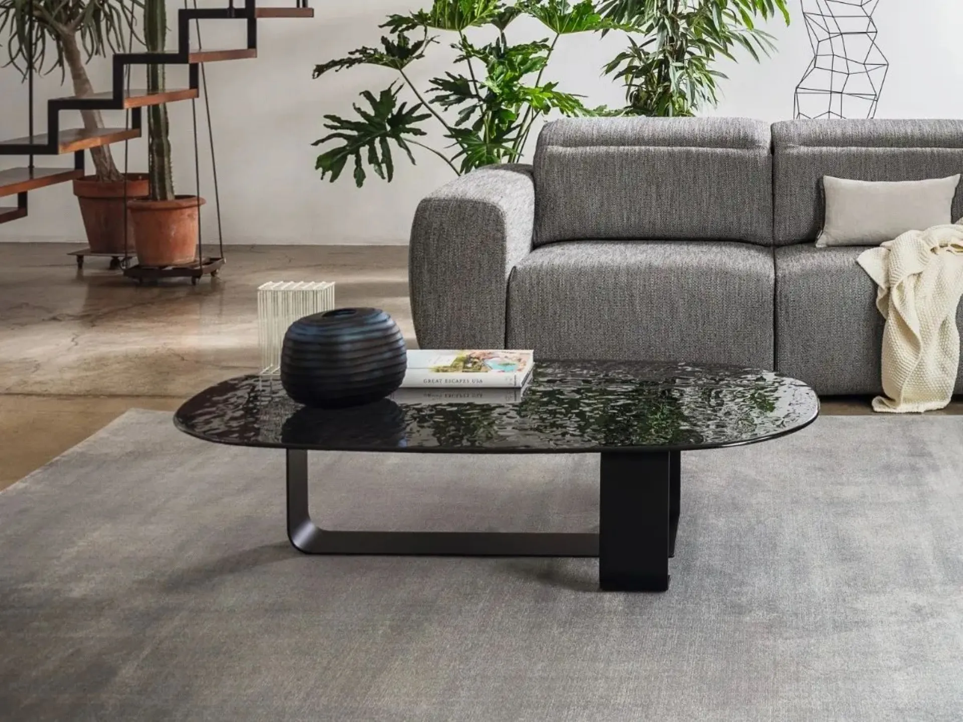 Ribbon is an innovative coffee table with a glass top and a shaped metal blade base. It measures cm L.140xP.81xH.35.