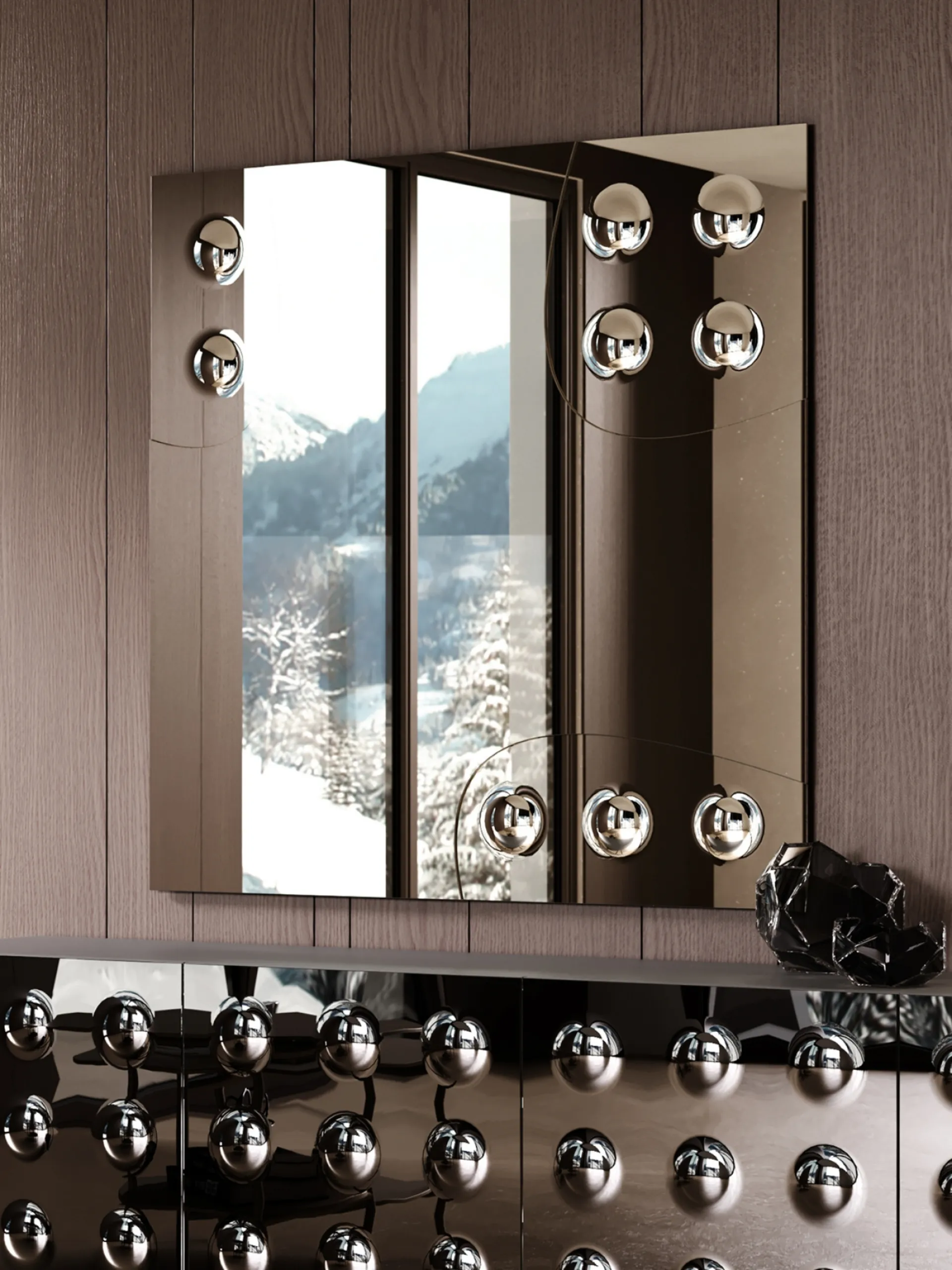 In the store, you will be able to touch and feel all the most exclusive compositions of the renowned brand, including those complete with frameless design mirrors. From the bedroom to the living room, these accessories are essential items to enhance the practical qualities and aesthetic value of your spaces. The Tonin Casa brand represents excellence and style: coming to the store means relying on the years of professionalism and passion of the company. To complete your interiors to the fullest, all it takes is a skillful touch by incorporating some high-quality Accessories among the other furnishings. Refinement and functionality distinguish the various solutions of the company, including this proposal of the Rock Mirror with raised bubbles, a frameless mirror of great aesthetic value.