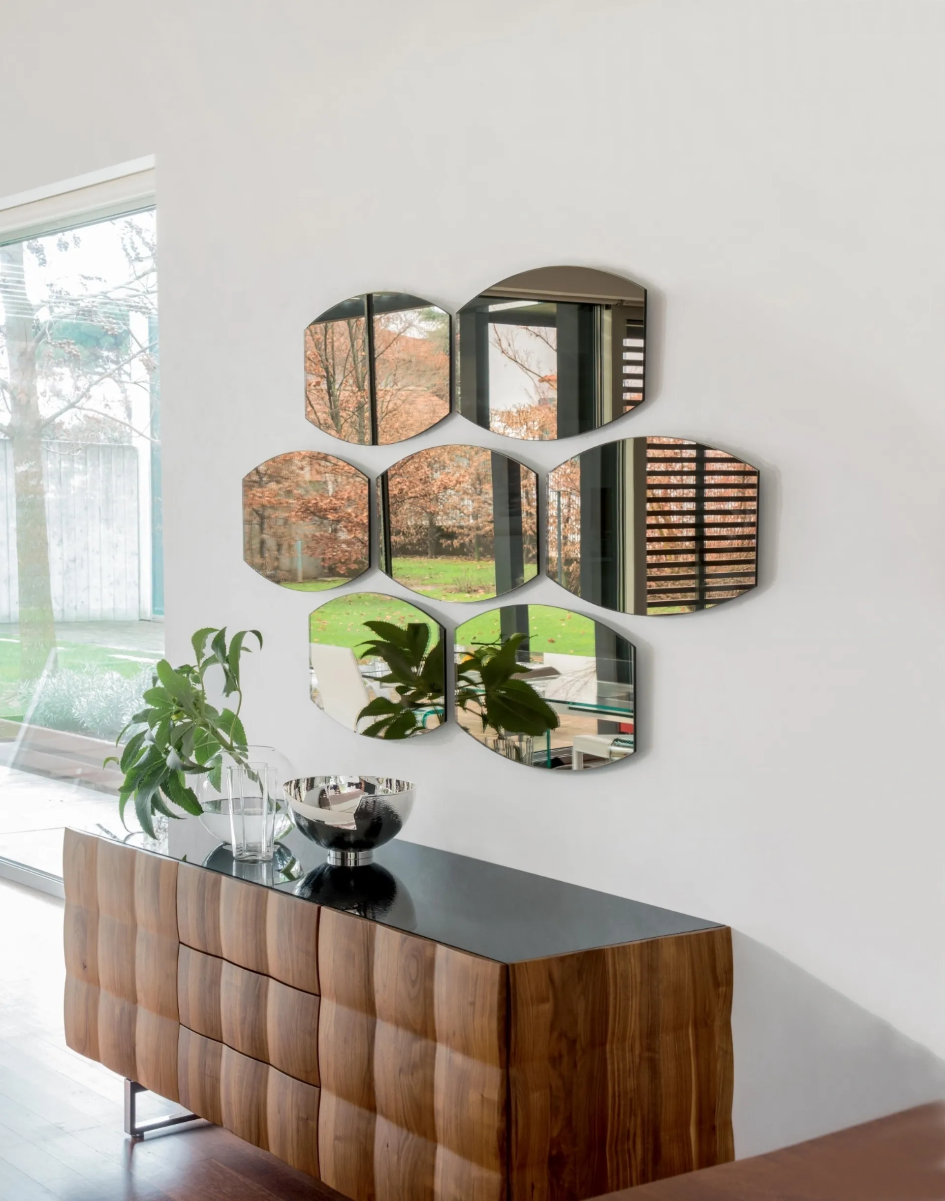 Particularly versatile and multifunctional, the modern Frameless Complements perform various functions: they complete the qualities of practicality and the aesthetic value of the environment. Skin mirror by Tonin Casa without frame: it will give personality and charm to an interior furnished with furniture and accessory elements with modern references. The charming compositions of the Tonin Casa brand enhance the interiors with their colors and style, recreating particular furnishing atmospheres. Complements and mirrors complete the home furnishings, filling the space in a useful way and making it very functional and beautiful to look at. In our showroom you will be able to see live the quality of the signature frameless modern mirror models, just like this solution in the photo.