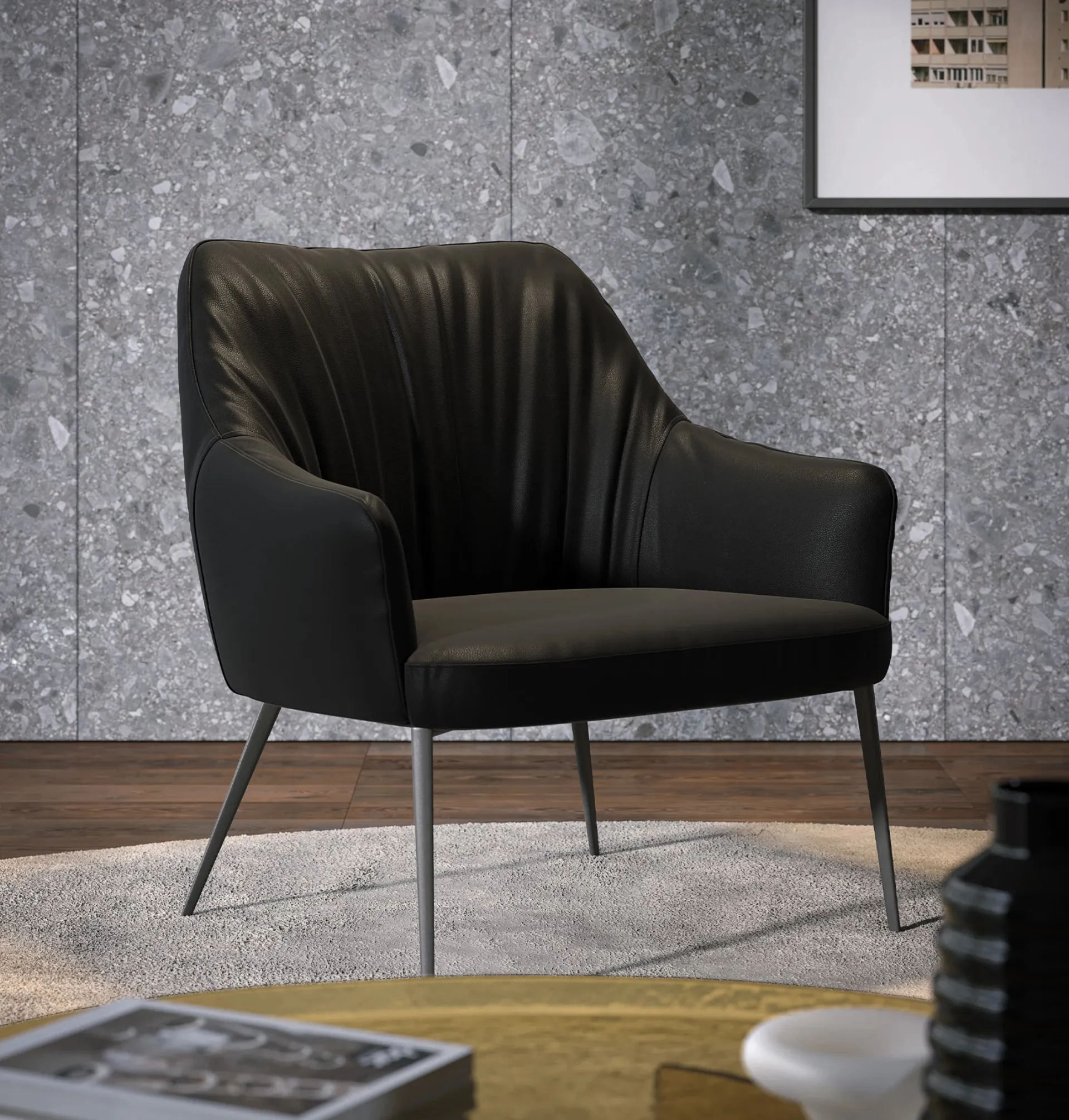 La poltrona Agata Lounge, un'espressione del design Tonin Casa, si distingue per la sua configurazione 'lounge', che esalta il comfort tramite un'imbottitura generosa. La struttura portante, caratterizzata da gambe metalliche di sezione ridotta ma di elevata robustezza, conferisce alla seduta un'estetica contemporanea e una notevole stabilità. Questa peculiare combinazione la rende particolarmente idonea per ambienti che richiedono sia raffinatezza estetica che funzionalità duratura. La meticolosa ricerca sui materiali e l'innovazione tecnologica definiscono un prodotto di elevato standard qualitativo e duraturo.