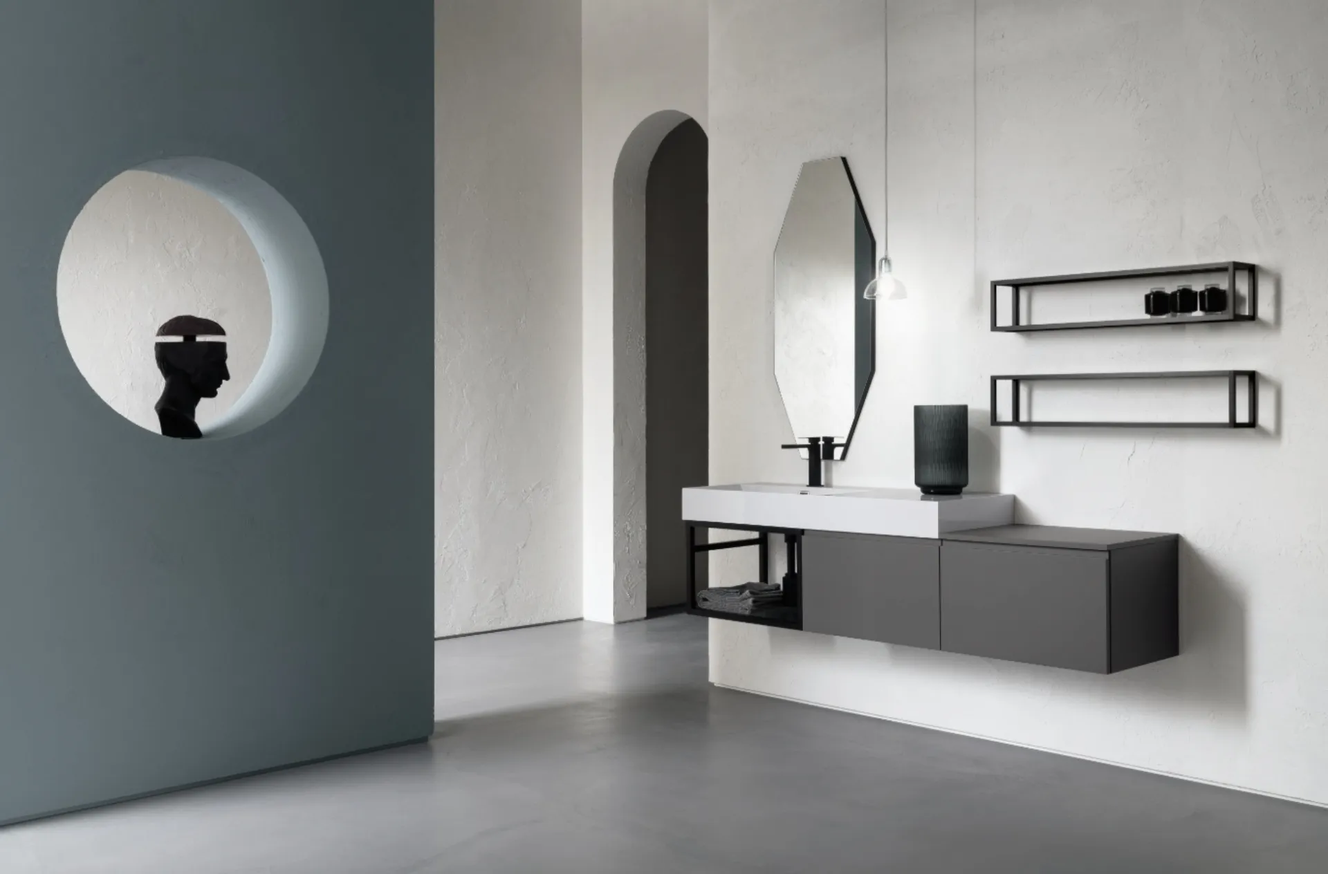 | Componenti: | Lavabo consolle "Tahiti" L 121 cm, Specchiera mod. "Otto", Lampada a sospensione mod. "Lamda" |