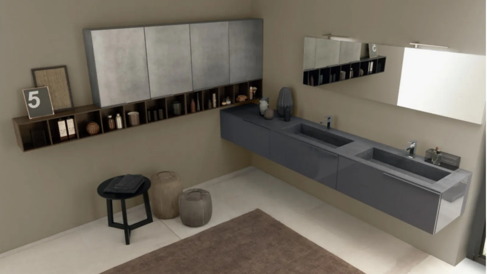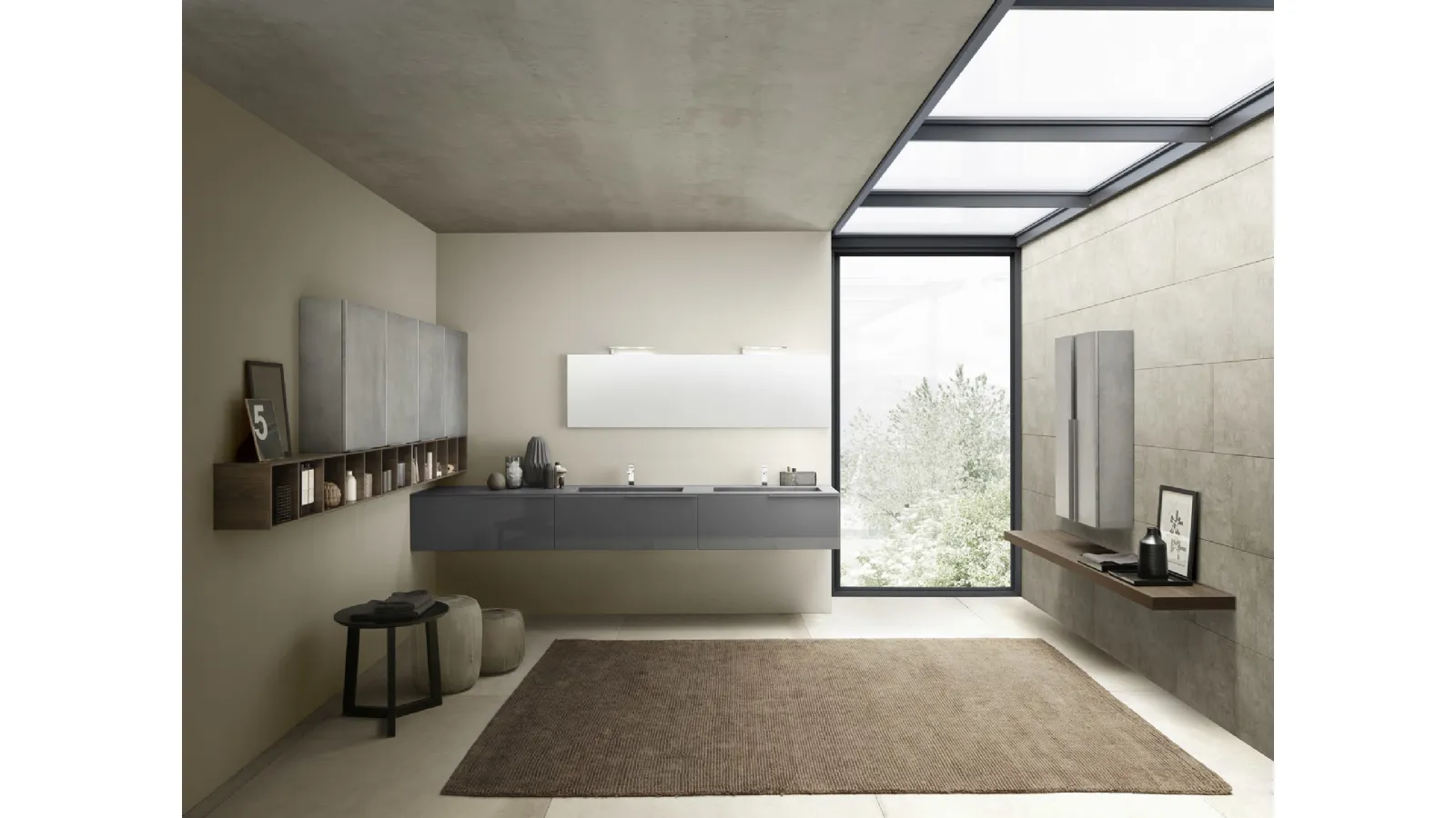 | Materiale: | Laccato Grigio Grafite lucido (basi), Laccato Metal Acciaio (pensili), Dekorativo 3D Rovere Sherwood Scuro (pensili a giorno), Specchiera con lampada Led Star |