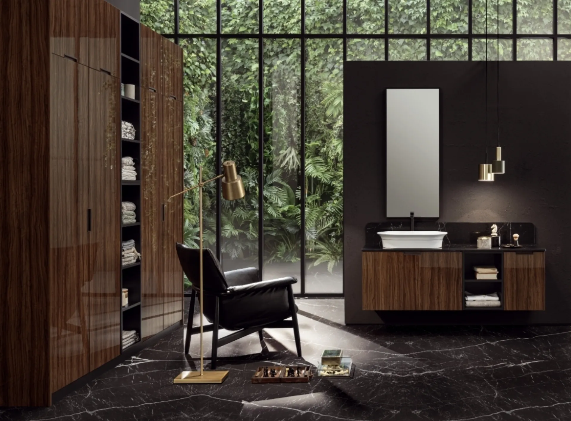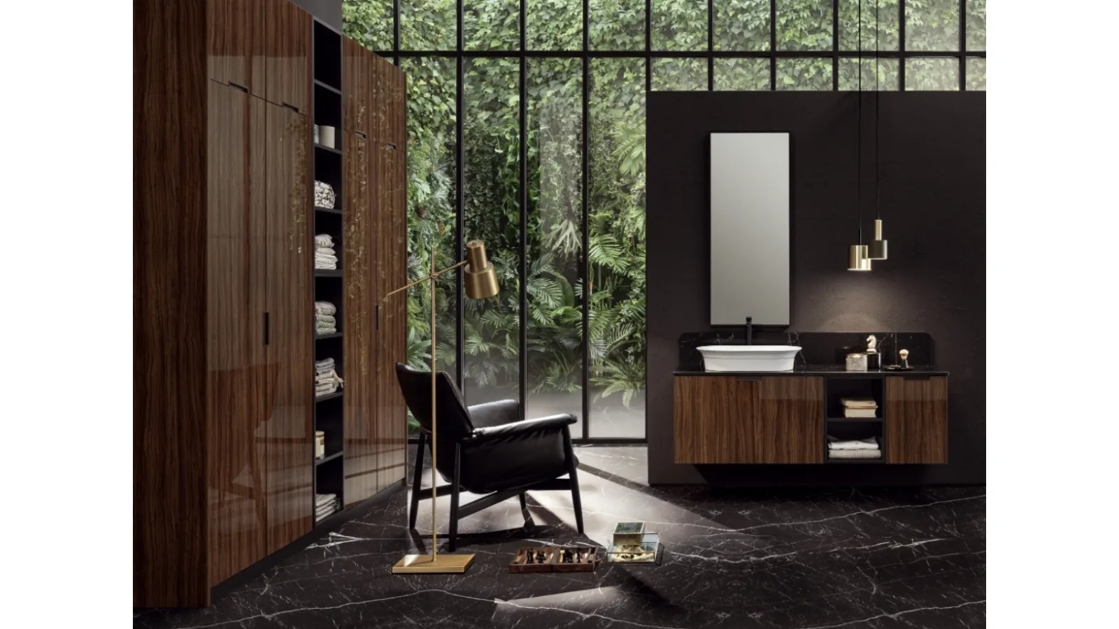 Il sistema d'arredo bagno EGOISTA EG03 di Compab si distingue per l'eleganza dei suoi materiali e la sofisticata combinazione cromatica. La struttura è realizzata in pregiato olivo scuro lucido, armoniosamente accostato a dettagli in laccato opaco nero, con frontali che riprendono la finitura lucida dell'olivo scuro. Questo mobile sospeso integra un raffinato lavabo da appoggio modello 'Lilì' in ceramica bianca lucida, completato da un piano e alzata posteriore in marmo con finitura Pluto, dello spessore di 2 cm, che conferisce robustezza e pregio. L'insieme è arricchito da una specchiera modello FACE NE, studiata per completare l'estetica funzionale del mobile, offrendo una soluzione completa e di design per l'ambiente bagno. La configurazione complessiva, con misure di L 218,6+156 x P 51 cm, evidenzia una progettazione attenta agli spazi e alla funzionalità. Questo prodotto incarna la perfetta sintesi tra design innovativo e ingegneria dei materiali, garantendo prestazioni estetiche e funzionali di alto livello, tipiche delle collezioni di alta gamma.