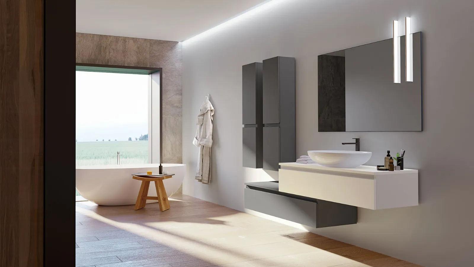 Discover our series of modern bathroom furniture and suspended bathroom furniture in matt lacquer, such as the Happy 13 model