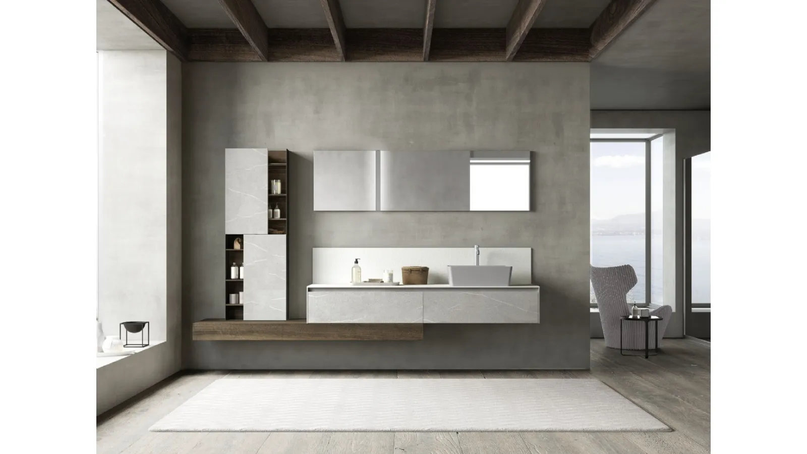 Il sistema per l'arredo bagno M2 System 222 di Baxar è concepito per ottimizzare il benessere e la funzionalità degli spazi. Caratterizzato da innovative luci Two-face che delineano lo specchio in verticale e da un'integrazione armoniosa con il lavabo Tuttofuori della serie Blade, realizzato in ceramica colorata. La versatilità è garantita da un'ampia gamma di finiture, tra cui essenze legnose, laccature (opache, lucide, soft-touch), Dekorativo 3D, HPL Unicolor e laccature metallizzate, permettendo una personalizzazione profonda e l'adattamento a ogni esigenza stilistica e funzionale. Questo approccio progettuale assicura una soluzione duratura e di alto valore estetico, pensata per soddisfare le aspettative più elevate nel tempo.