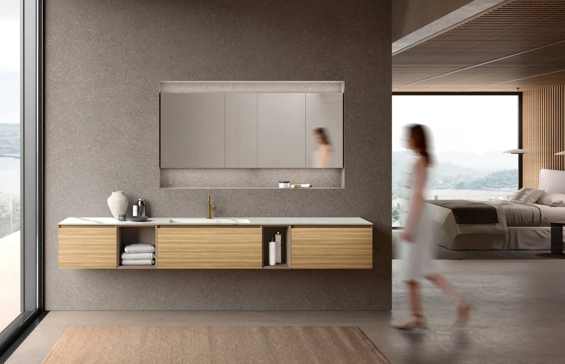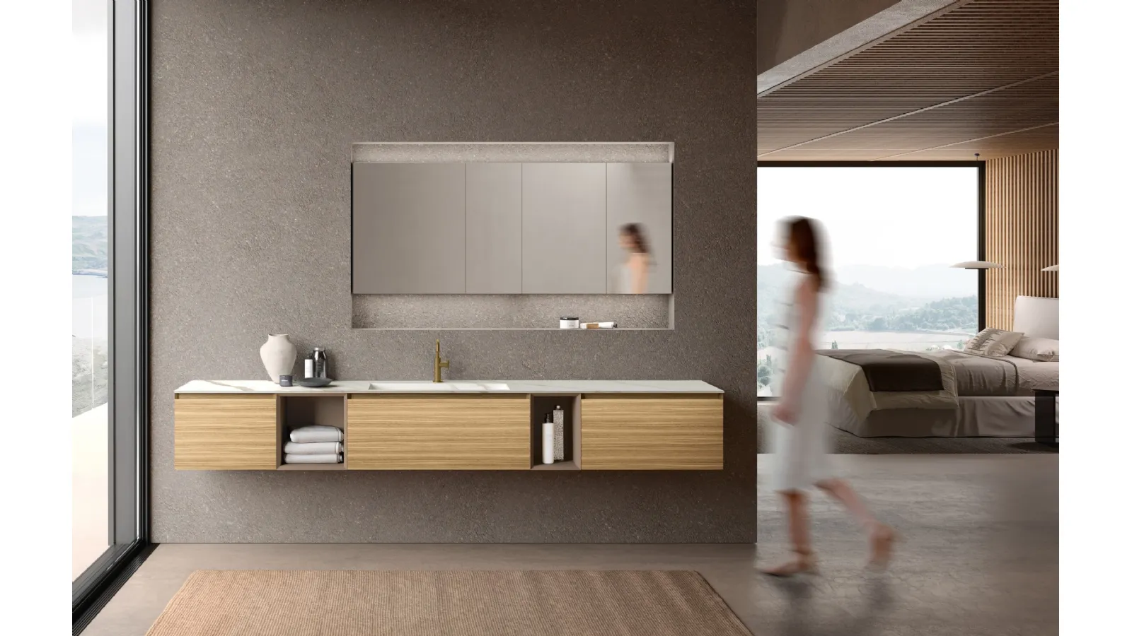 Il sistema M3 System 317 di Baxar rappresenta una soluzione d'arredo bagno all'avanguardia, dove l'estetica minimalista si fonde con la ricchezza delle finiture. Le basi sospese, realizzate in Dekorativo Eucalipto Lab Naturale, si abbinano armoniosamente ai vani a giorno laccati nella tonalità Castoro Ottawa, configurando un'area espositiva di grande impatto visivo. Progettato per ottimizzare gli spazi e favorire il benessere, questo sistema integra uno specchio contenitore Sky dotato di anta bifacciale da 6 mm. La versatilità si estende al top, disponibile con uno spessore di 1 cm e vasca integrata Scivolo L. 70 cm in pregiato Gres Calacatta Oro Venato, oppure in una versione da 1,2 cm con vasca integrata Syntesi L. 58 cm in Tekorlux Bianco opaco. Questa composizione offre un'elevata modularità e opzioni di personalizzazione avanzate, tipiche delle proposte dei brand leader nel settore.