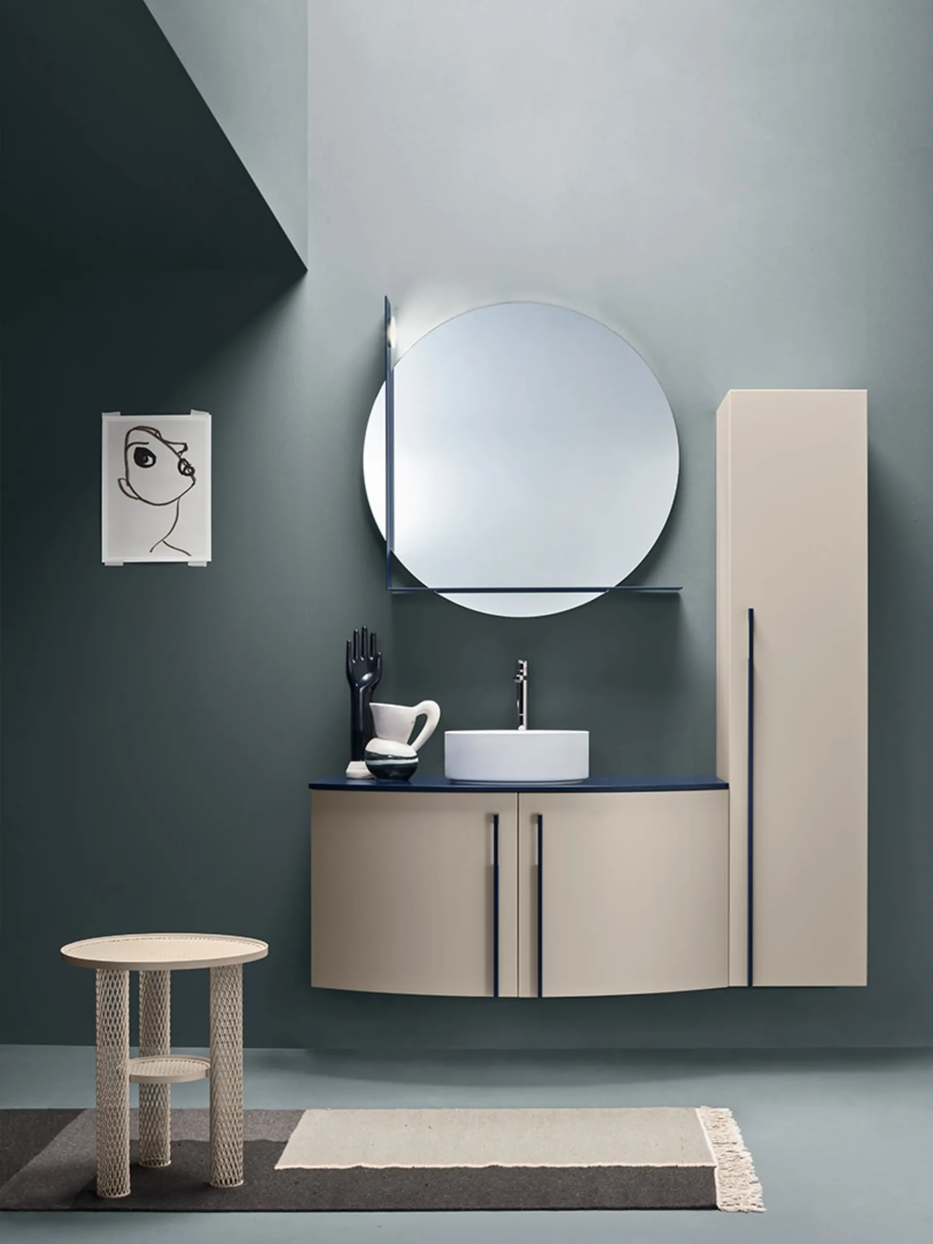 Each project developed with the company's products can be customized with suspended bathroom furniture of all kinds, always made of first-choice and resistant materials. The colors, finishes, and modules that the brand offers for modern bathroom furnishing with suspended bathroom furniture offer the opportunity to design different contexts. The bathroom is the space dedicated to relaxation and personal care practices, so it should be furnished by mixing functionality and style. Home bathrooms differ both in elegance and size, so it is essential for each person to find the ideal solution for their needs. With a wide selection of furnishing compositions from the Ardeco company, you can design the bathroom in great detail, solving your housing needs. Here we propose the model of the Round Deep Blue Bathroom Cabinet by Ardeco in matte lacquer that perfectly enhances the space while ensuring practicality.