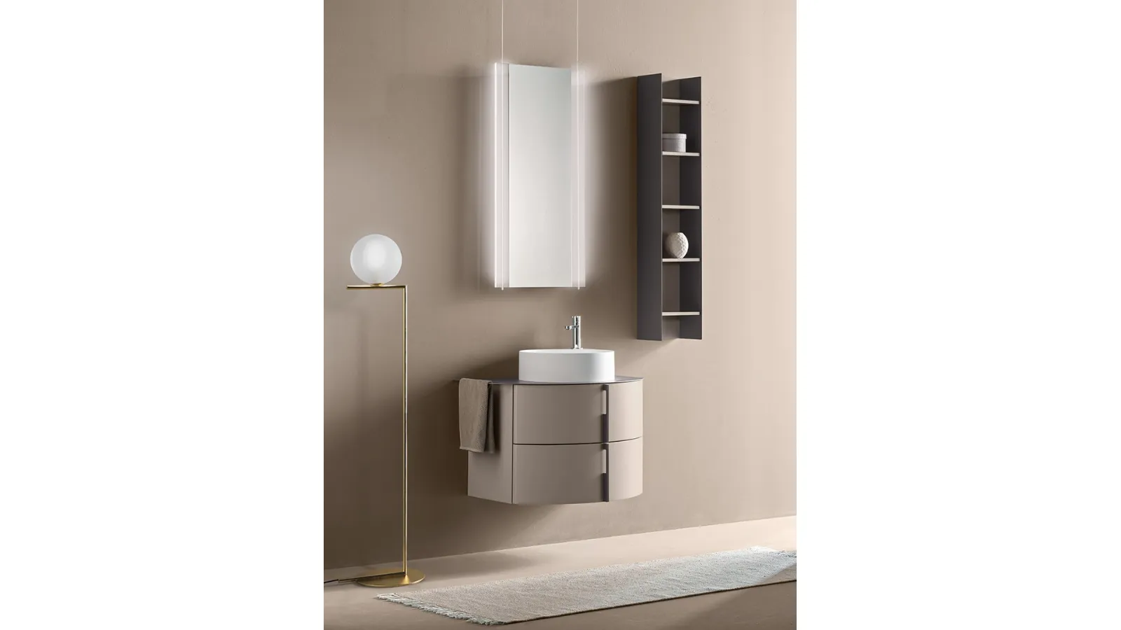 Quali materiali e finiture sono disponibili per il mobile bagno Round 07 Truffle Dust?Per il mobile bagno Round 07 Truffle Dust sono disponibili diverse finiture come laccato, legno e laminato. Puoi scegliere e farti consigliare sui materiali direttamente nella nostra materioteca per progetti di arredo.