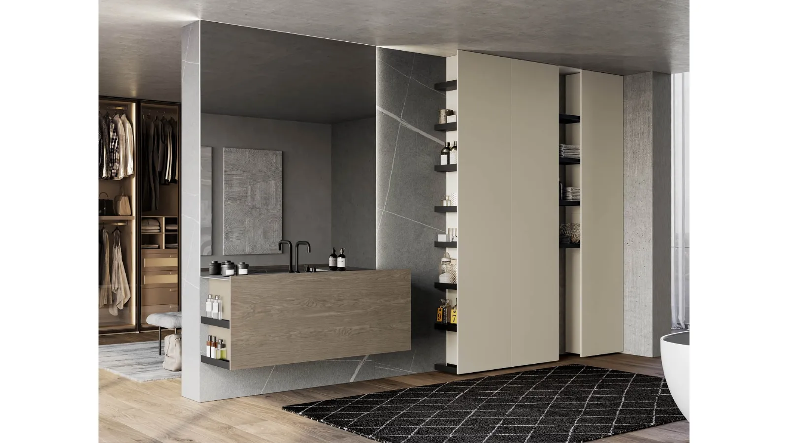 | Materiale: | Essenza rovere cenere, Gres Senda grigio, Laccato opaco, Alluminio alveolare |