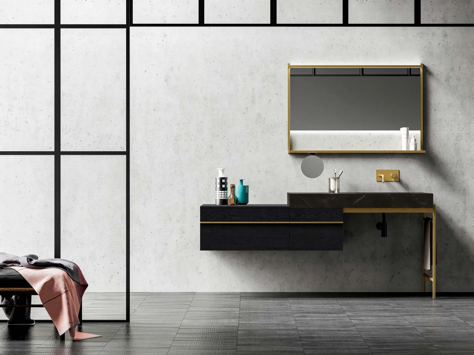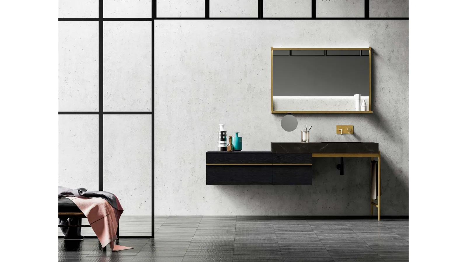 Il sistema Sidéro 03 di Birex rappresenta una soluzione sofisticata per l'arredo bagno, evidenziando l'eleganza intrinseca del metallo. Questa particolare configurazione sfoggia un'accurata lavorazione in legno di rovere carbone, abbinato a un raffinato top in gres Storm enro. Dettagli come il telaio e le maniglie sono realizzati in metallo con finitura ottone anticato, conferendo un tocco di distinzione. La serie Sidéro si distingue per l'impiego di elementi tubolari metallici, disponibili in molteplici varianti cromatiche quali nero, titanio, ottone anticato e bianco. Il design è arricchito da una ricca modularità, che include accessori integrabili quali mensole a muro, vani a giorno con struttura metallica e specchi con cornici coordinate. Per garantire la massima durabilità e un'estetica impeccabile, Sidéro 03 è concepito con materiali di pregio e finiture studiate per resistere nel tempo.