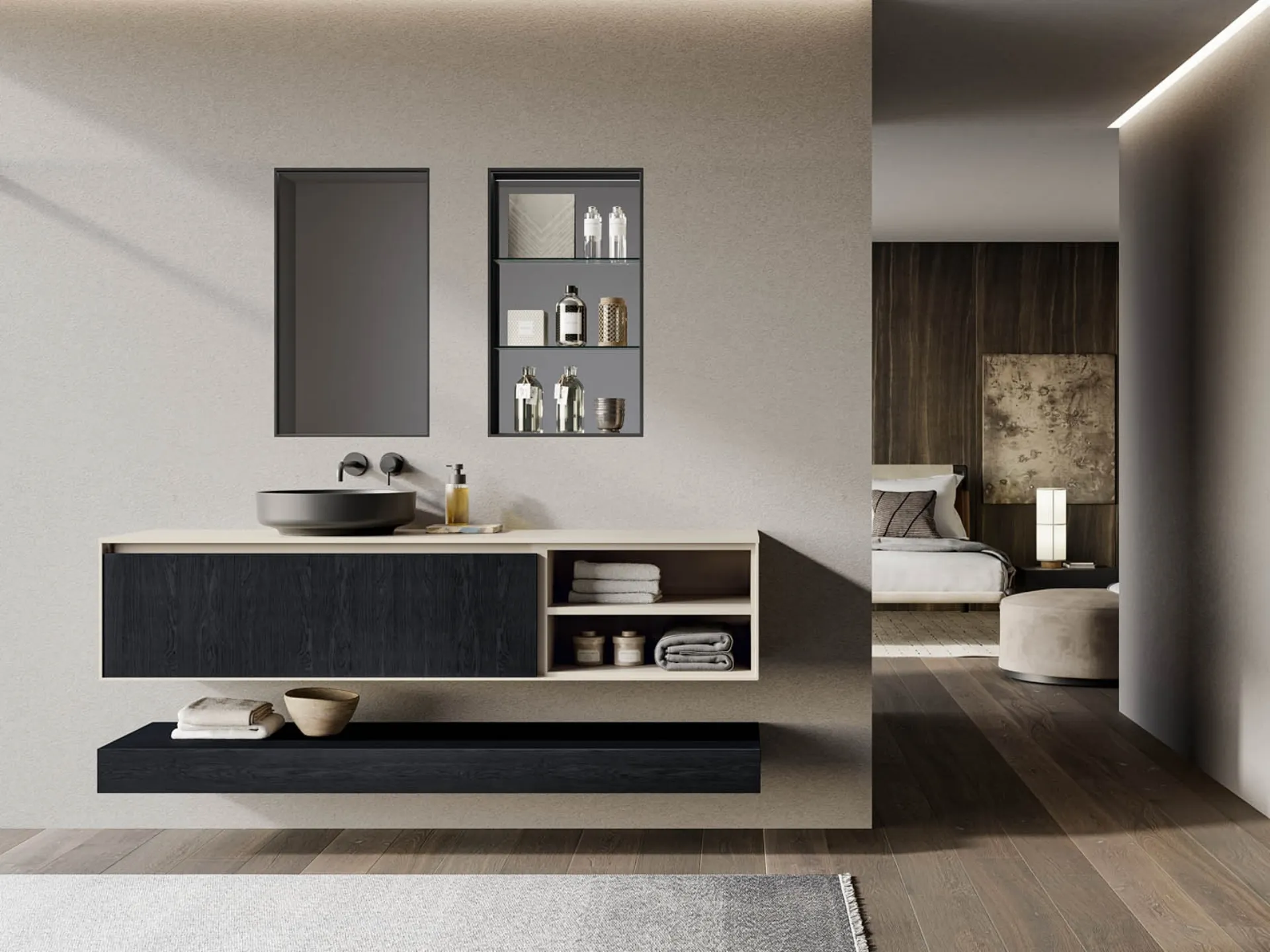 La composizione Birex Traccia 03 incarna un sistema d'arredo bagno dall'estetica raffinata e dal profilo distintivo. Il design si focalizza su una cornice grafica che valorizza l'effetto materico delle superfici, inglobando con eleganza vani a giorno e contenitori. La meticolosa lavorazione artigianale unisce i pannelli a 45°, creando un'interessante dialettica tra pieni e vuoti che accoglie cassetti e moduli aperti. I frontali possono essere impreziositi dall'esclusivo motivo a righe tridimensionali della finitura canneté, che conferisce un pregevole tocco artigianale e genera suggestivi giochi di luce e ombra. Questa soluzione, come l'intera collezione Traccia, è studiata per garantire funzionalità avanzate e un'elevata personalizzazione, adattandosi con armonia al bagno contemporaneo. L'elevata modularità e la vasta scelta di finiture disponibili permettono di configurare soluzioni d'arredo bagno uniche, rispecchiando le esigenze individuali con la qualità e il design che contraddistinguono i prodotti Birex.