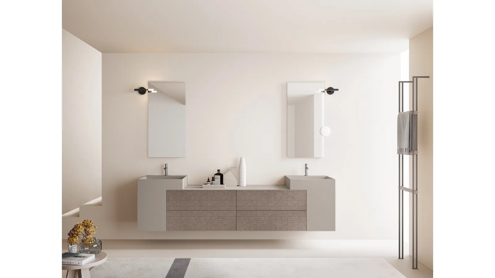 The Vintage 03 Elegant Sand bathroom cabinet model by Ardeco in melamine belongs to the company's complete range of bathroom furnishings, always of great aesthetic value. Ardeco offers proposals for the bathroom furniture design with suspended bathroom furniture that mix well-studied lines and a lot of practicality, as this interior requires. With the proposals we present you will guarantee well-made and trendy furnishings also for the bathroom, which must be furnished with care, practicality and design. Pleasant and indispensable in every bathroom, a melamine design model like the one in the image will solve your housing needs of all kinds. With us you will be able to see firsthand the most original furnishing compositions of the well-known brand: we will welcome you to furnish the wellness room together. Innovative finishes and a rich range of colors guarantee detailed customization and first choice materials resistant to various substances.