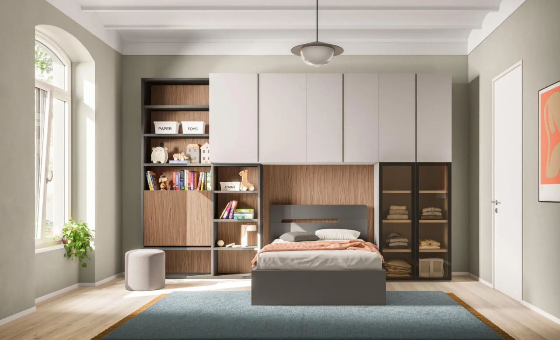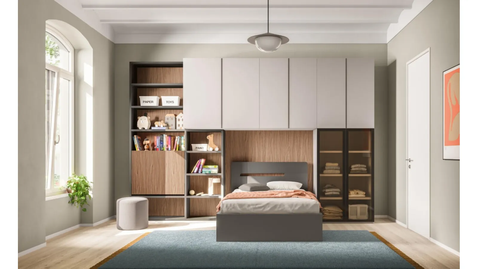 La Cameretta Ponte 34 di Mistral rappresenta una soluzione d'arredo avanzata, studiata per ottimizzare gli spazi destinati ai ragazzi. Questa composizione modulare offre elevata funzionalità e un design curato, integrandosi perfettamente in ambienti moderni. Le opzioni di personalizzazione sono ampie, con finiture come il sofisticato Noce, il raffinato Velluto e l'innovativa Lavagna. Mistral impiega materiali di qualità superiore, inclusi melaminici materici e dekor per texture uniche, melaminici lisci per superfici uniformi, e una selezione di tessuti ed ecopelli resistenti, garantendo durabilità e stile in ogni dettaglio. L'architettura modulare consente configurazioni flessibili, adattandosi a diverse esigenze spaziali.