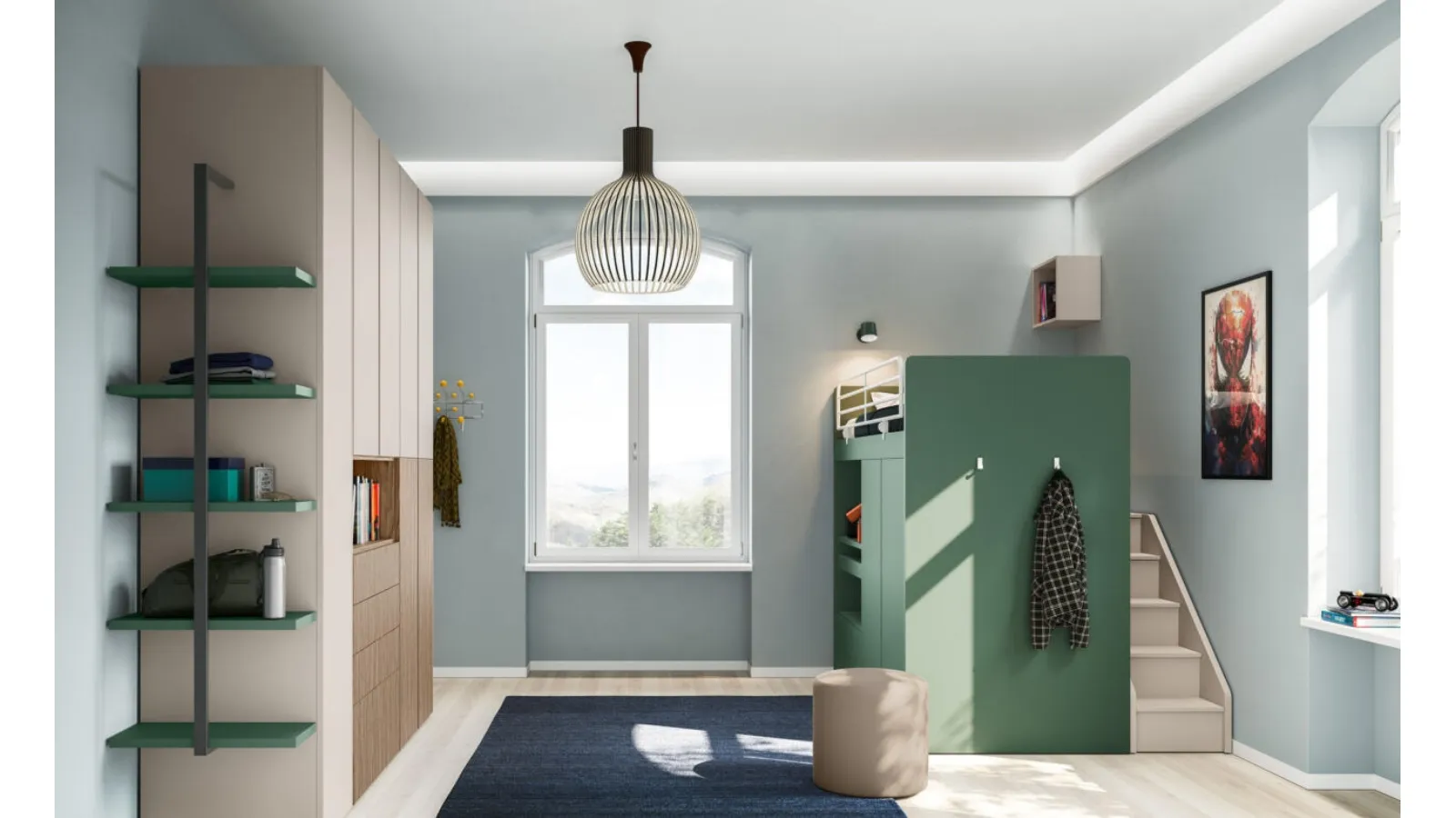We present in our store various modern loft bedrooms for children from the brand, ideal for following them during their development. Our children spend hours of their days in their bedrooms: make them suitable for studying, playing, and relaxing daily. With Mistral's 50 Space-Saving Bedroom in melamine, you will ensure a perfect mix of functionality and ergonomics, ideal for your children's room. In our showroom, we take care to guide you from choosing furniture for the bedroom to designing the place where your children will grow up, having fun and dreaming. Our children's bedrooms are the space where they will grow up having fun and dreaming, so it is essential that the space is functional.