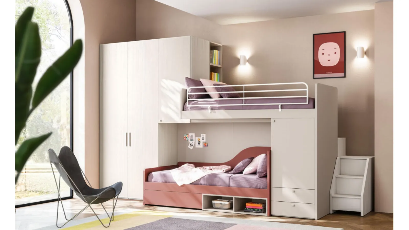 Mistral offers a wide range of custom-made accessories to complement your room: you will find a bed, wardrobe, desk, chairs, and bookshelves. This melamine proposal perfectly combines the practical qualities and aesthetic value of the bedroom, as it is able to combine functionality and ergonomics. If you are looking for creative ideas to decorate your children's room perfectly, we suggest Mistral's Space-Saving 54 Bedroom Set with a melamine finish. Bring aesthetics and lively colors into the children's room with this proposal, one of Mistral's loft bedrooms for girls. Trust us in designing the room for the youth: in our store, we offer all the most beautiful modern furniture compositions for their room.