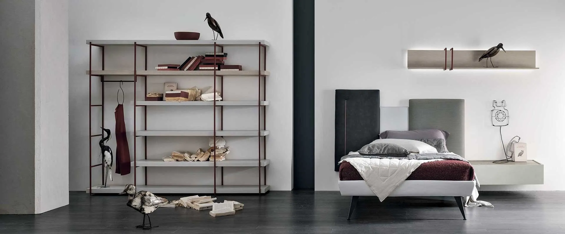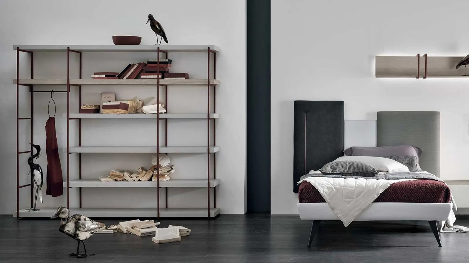 Questa composizione di Tomasella rappresenta una soluzione d'arredo per la cameretta dall'estetica moderna e dalla spiccata funzionalità. Il suo design modulare integra una libreria Fortebraccio con appendiabiti, una testiera Skyline Special Edition con ring vaschetta, un comodino sospeso Replay e una mensola Ring retroilluminata. Le specifiche dimensionali dei singoli componenti sono: Libreria Fortebraccio con appendiabiti: L 216 cm, P 38,5 cm, H 187,5 cm. L'aggregato di testiera Skyline Special Edition, comodino sospeso Replay e mensola Ring presenta dimensioni complessive di L 255 cm, P 208 cm, H 157 cm. La selezione meticolosa dei materiali e le finiture di pregio sono al centro della filosofia del brand, assicurando un'esperienza d'uso superiore e duratura.