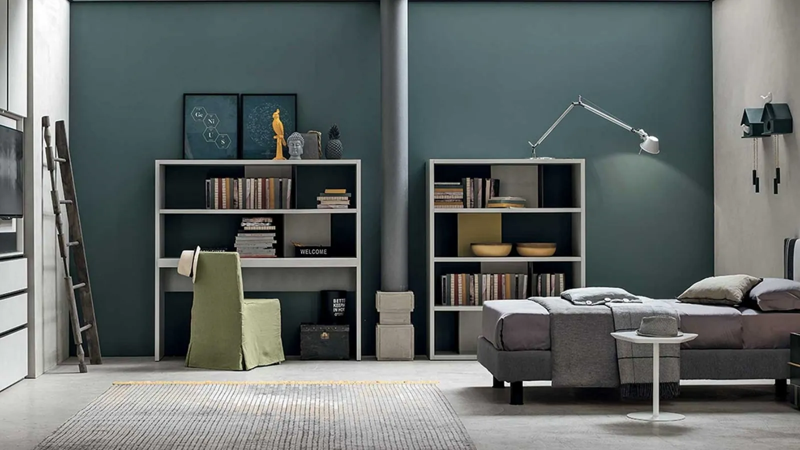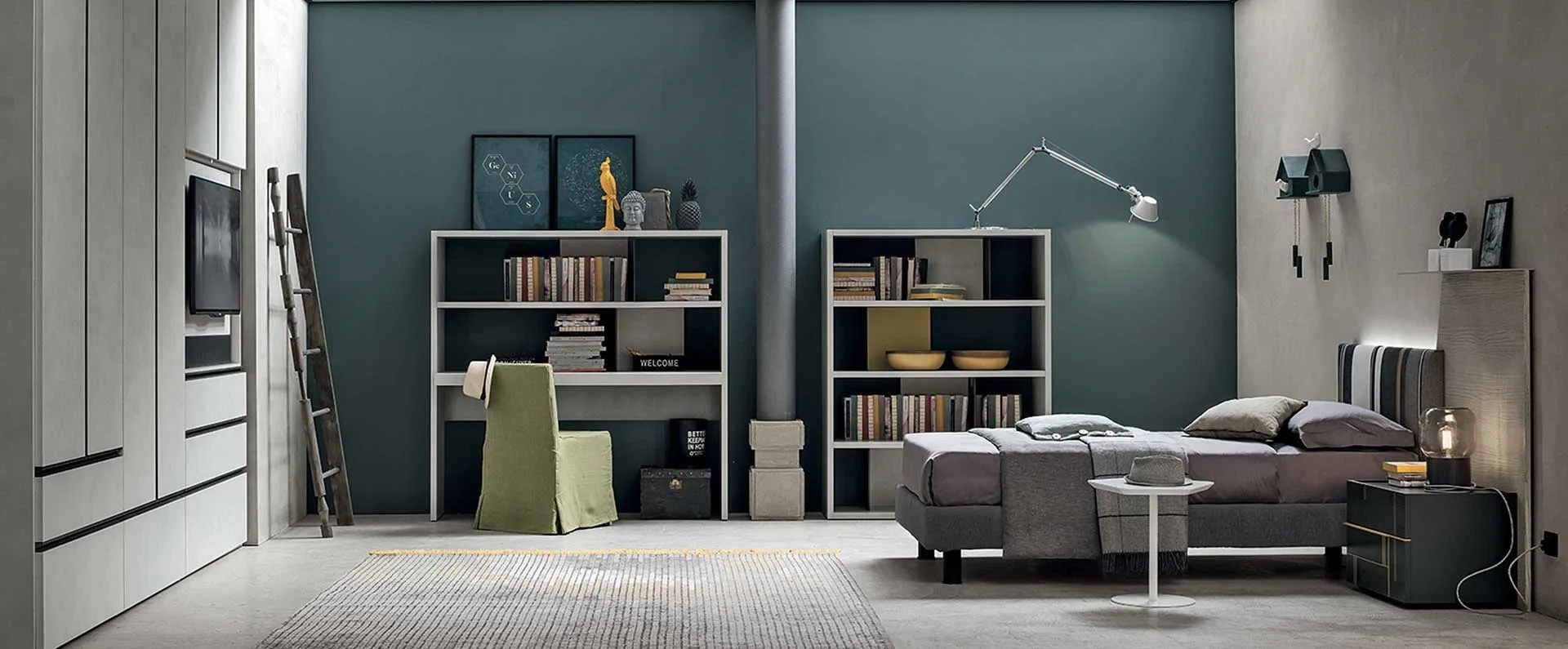 Questa Composizione 08 di Tomasella rappresenta una soluzione d'arredo altamente funzionale e modulare, specificamente concepita per l'ambiente notte giovanile. Il sistema integra un armadio battente Modula, caratterizzato da un innovativo accessorio Pivot che ne ottimizza l'orientamento e la praticità d'uso. La configurazione include inoltre una robusta libreria a spalla modello Atlante, una sedia Tiffany Gonna, una testiera Diagonal Young abbinata a un Ring Sommier, un versatile comodino Hashtag e un elegante tavolino Caruso. L'armadio è ingegnerizzato per massimizzare la funzionalità, ospitando un porta-tv integrato e offrendo ampi spazi contenitivi. Le specifiche dimensionali dei componenti principali sono: l'armadio battente Modula misura L 307,2 P 62 H 255 cm, mentre la libreria a spalla Atlante ha dimensioni L 147+111 P 51 H 147,5 cm. Un sistema progettato per garantire prestazioni e durabilità nel tempo, consolidando la sua affidabilità strutturale e stilistica.