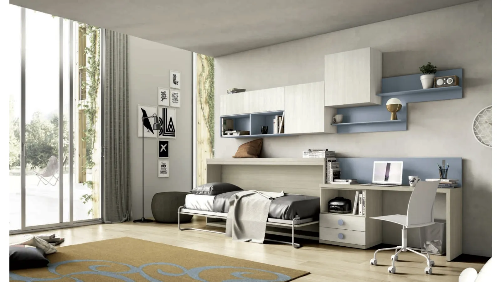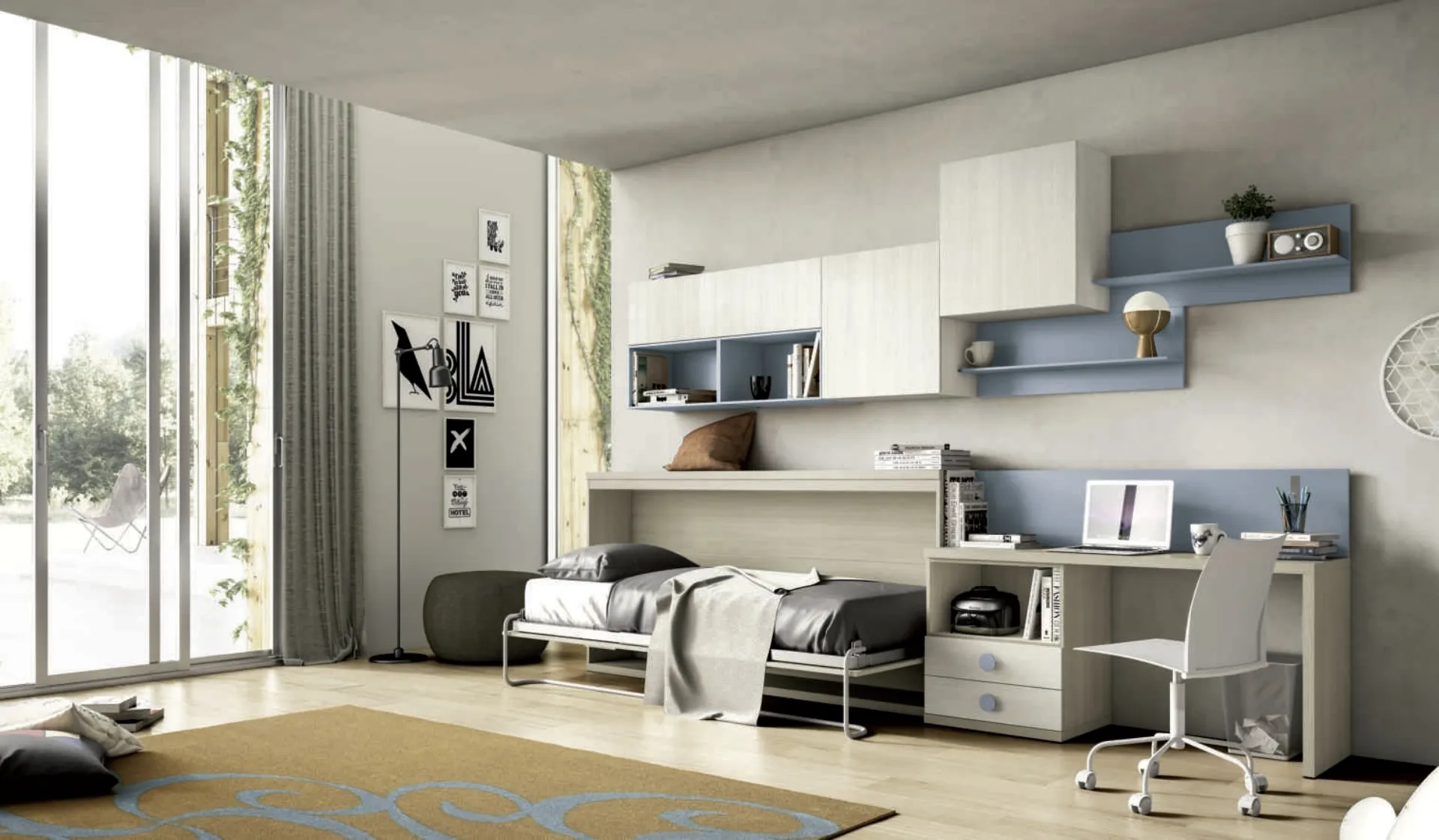 We present in our showroom multiple modern bespoke children's bedrooms of the brand, ideal for following them as they grow. Our children spend hours of the day in their bedrooms: make them suitable for homework, having fun and sleeping every day. With the space-saving bedroom Composition 715 by Spagnol Mobili in melamine you will guarantee a perfect combination of functionality and ergonomics, ideal for your children's room. In our showroom we take care of following you from the choice of bedroom furniture to the design of the place where your children will grow up, having fun and dreaming. Our children's bedrooms are the place where they will grow up having fun and dreaming, so it is essential that the space be practical.